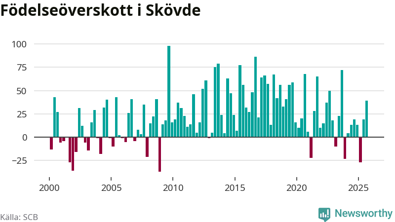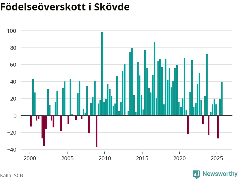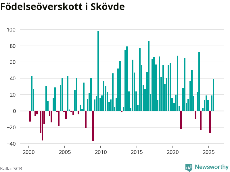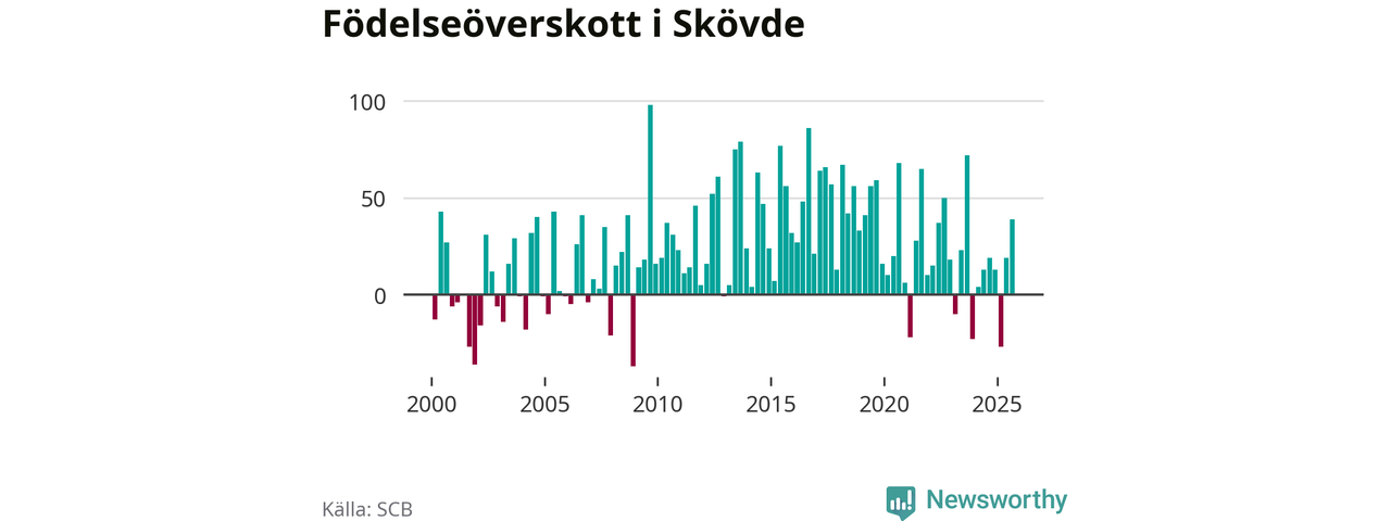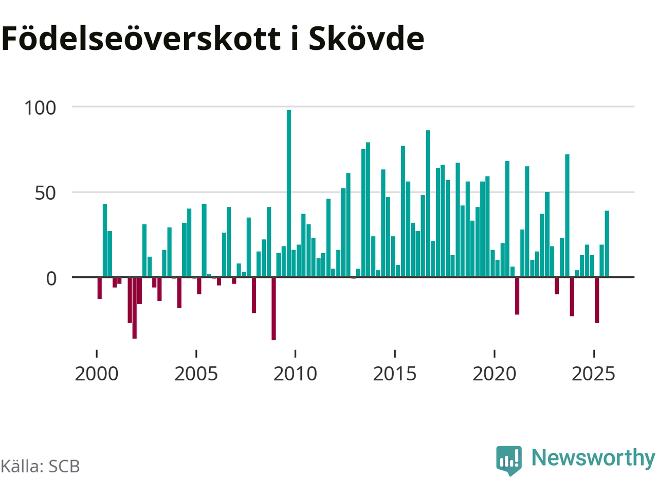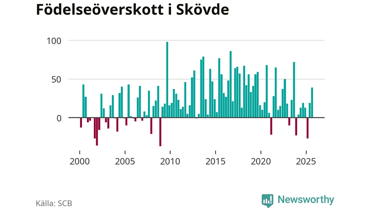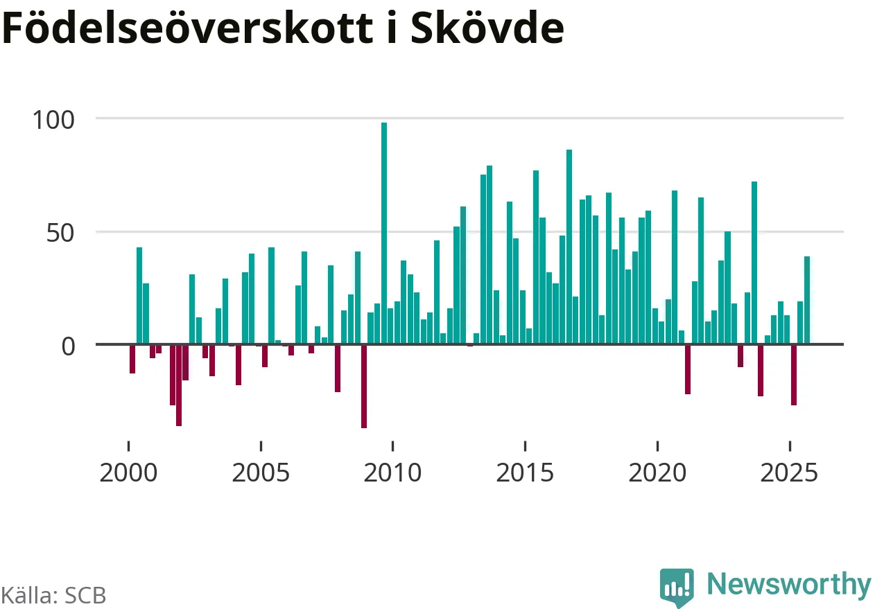 Enligt SCB:s siffror föddes 147 barn i Skövde under det senaste kvartalet. Samtidigt avled 108 personer. Skövde hade alltså ett positivt födelsenetto, vilket kommunen historiskt sett nästan alltid har haft.