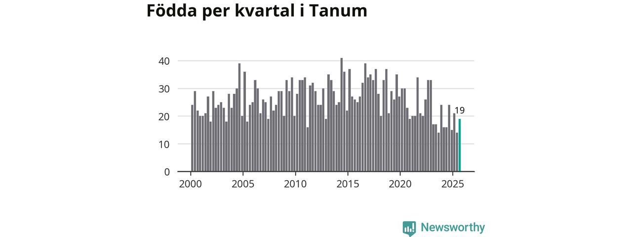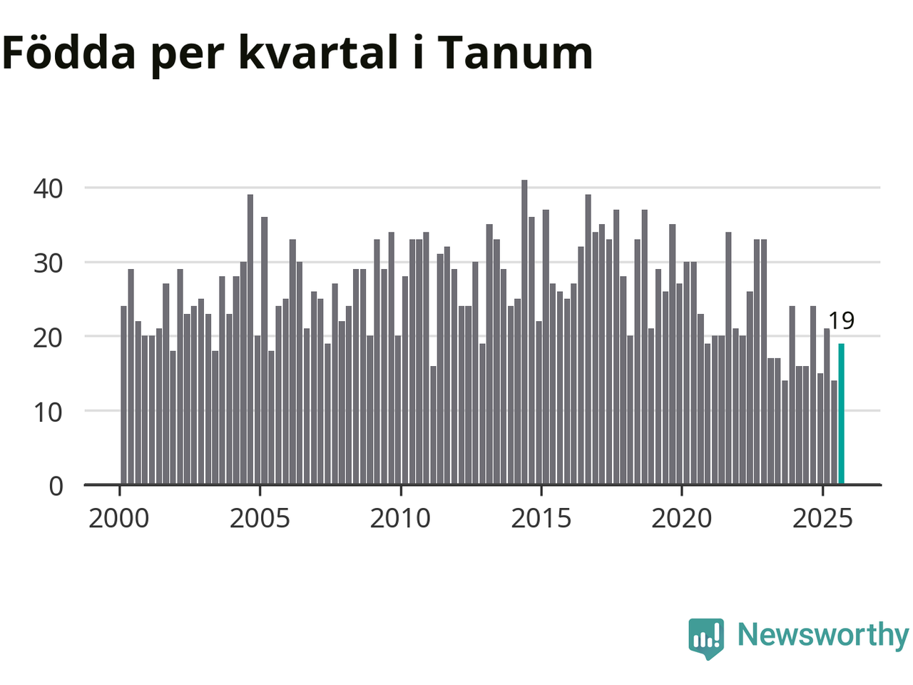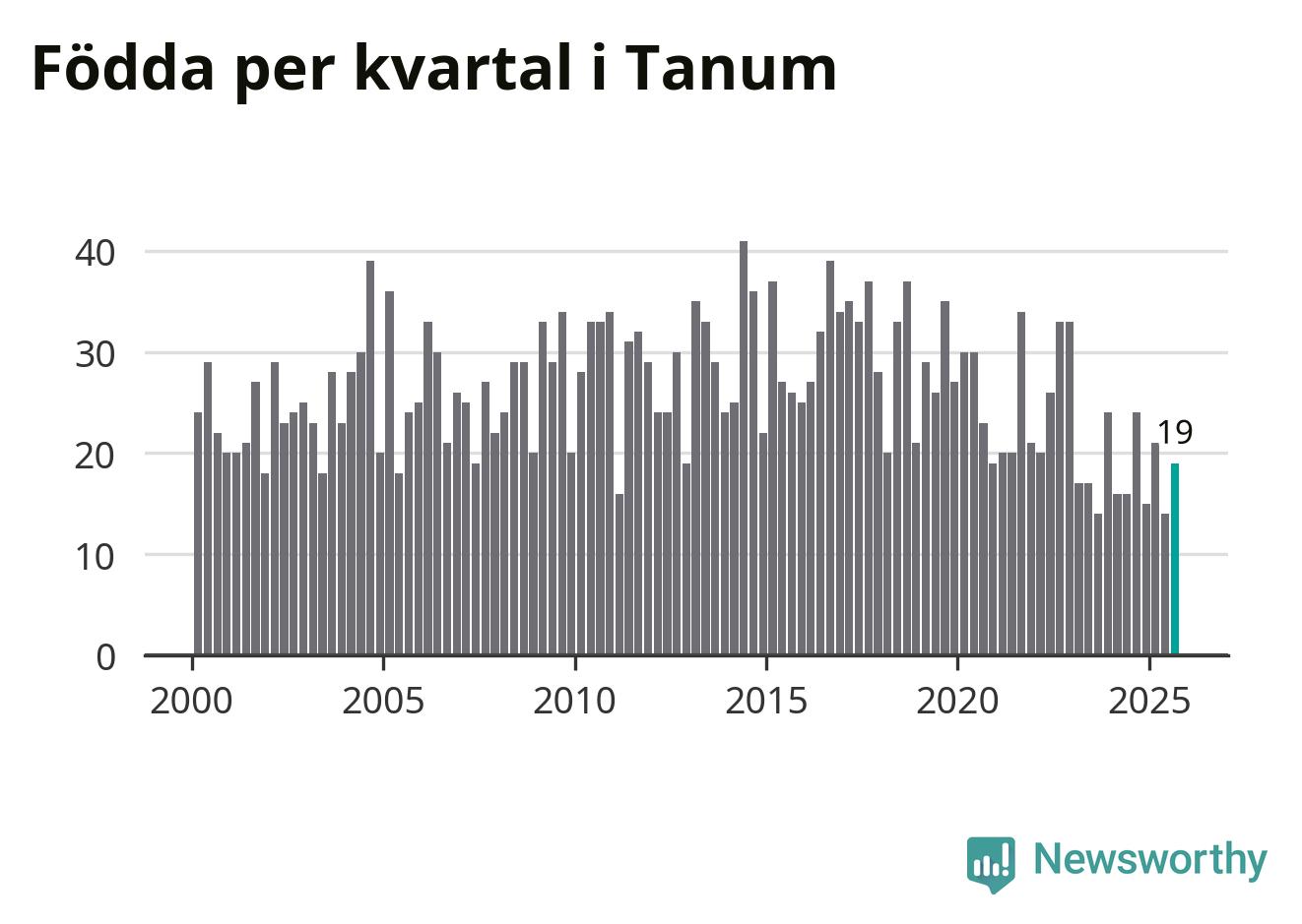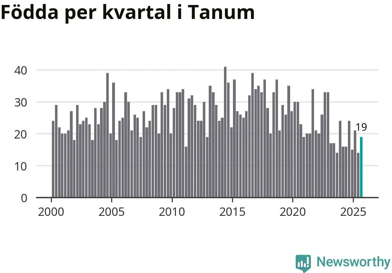 Enligt SCB:s siffror föddes 19 barn i Tanum under det senaste kvartalet. Samtidigt avled relativt många – 50 personer. Tanum hade alltså ett negativt födelsenetto, vilket kommunen historiskt sett nästan alltid har haft.