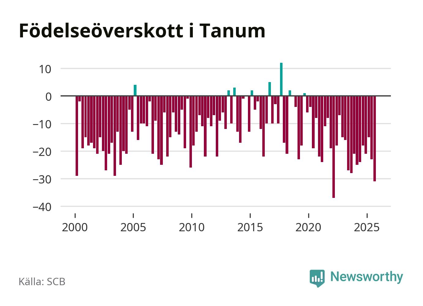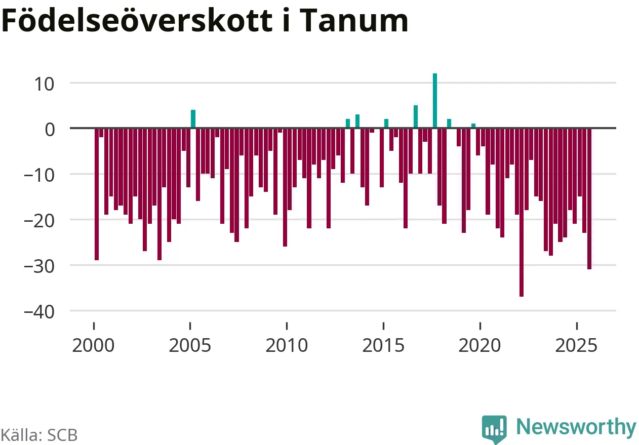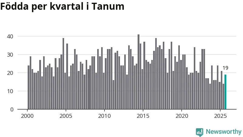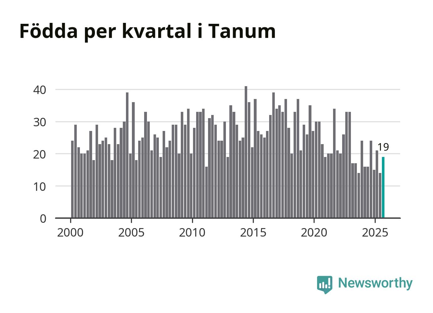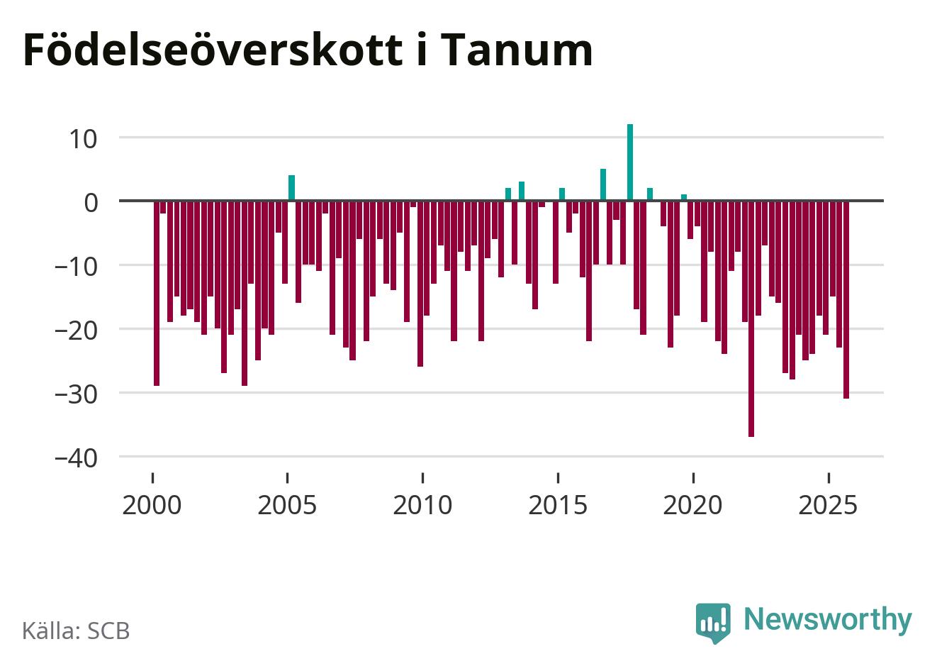 Enligt SCB:s siffror föddes 19 barn i Tanum under det senaste kvartalet. Samtidigt avled relativt många – 50 personer. Tanum hade alltså ett negativt födelsenetto, vilket kommunen historiskt sett nästan alltid har haft.