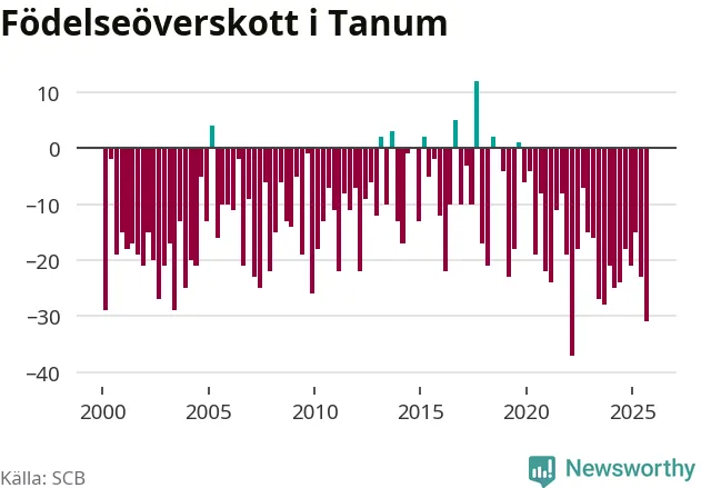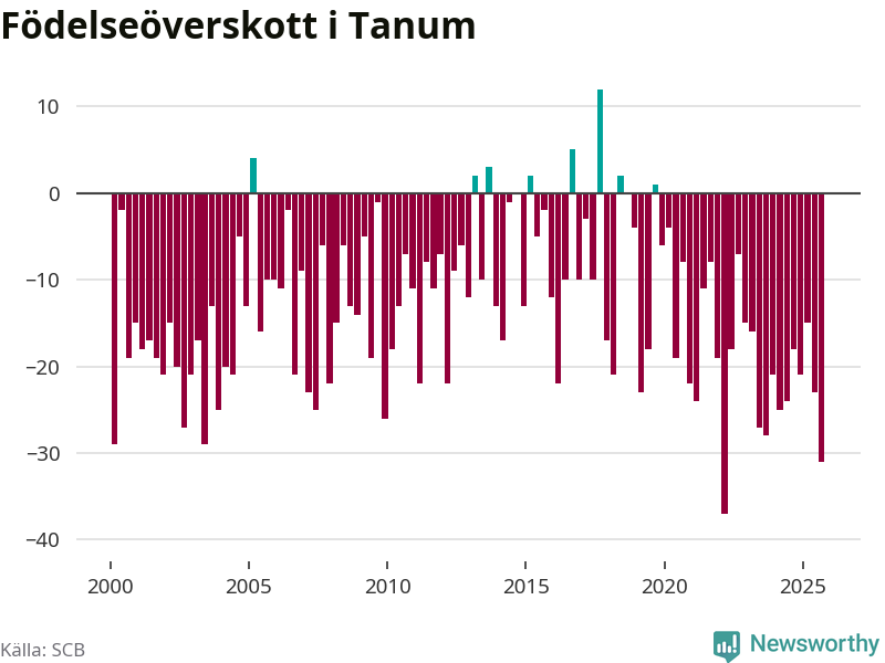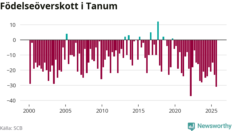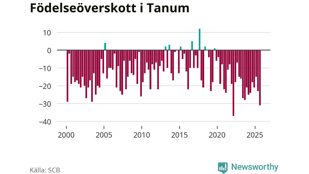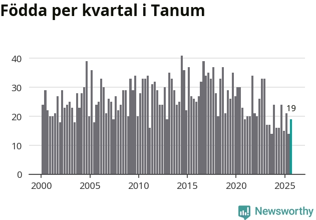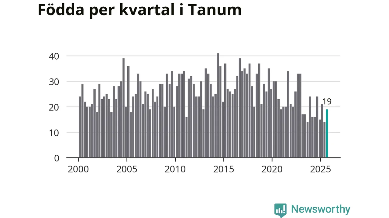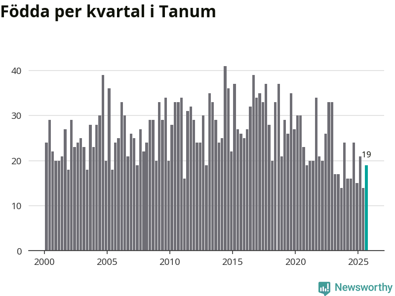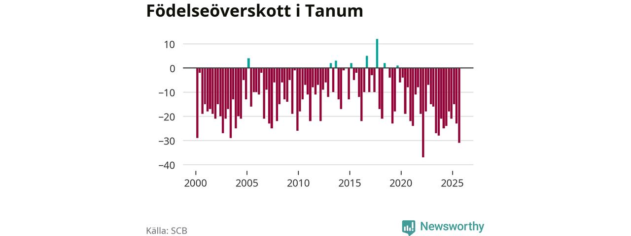 Enligt SCB:s siffror föddes 19 barn i Tanum under det senaste kvartalet. Samtidigt avled relativt många – 50 personer. Tanum hade alltså ett negativt födelsenetto, vilket kommunen historiskt sett nästan alltid har haft.