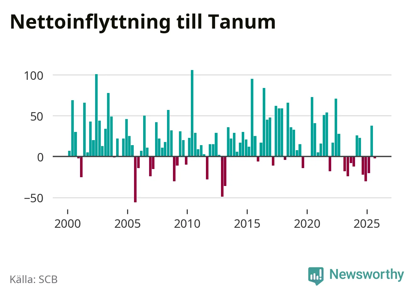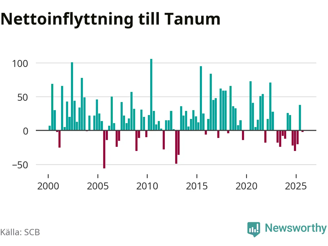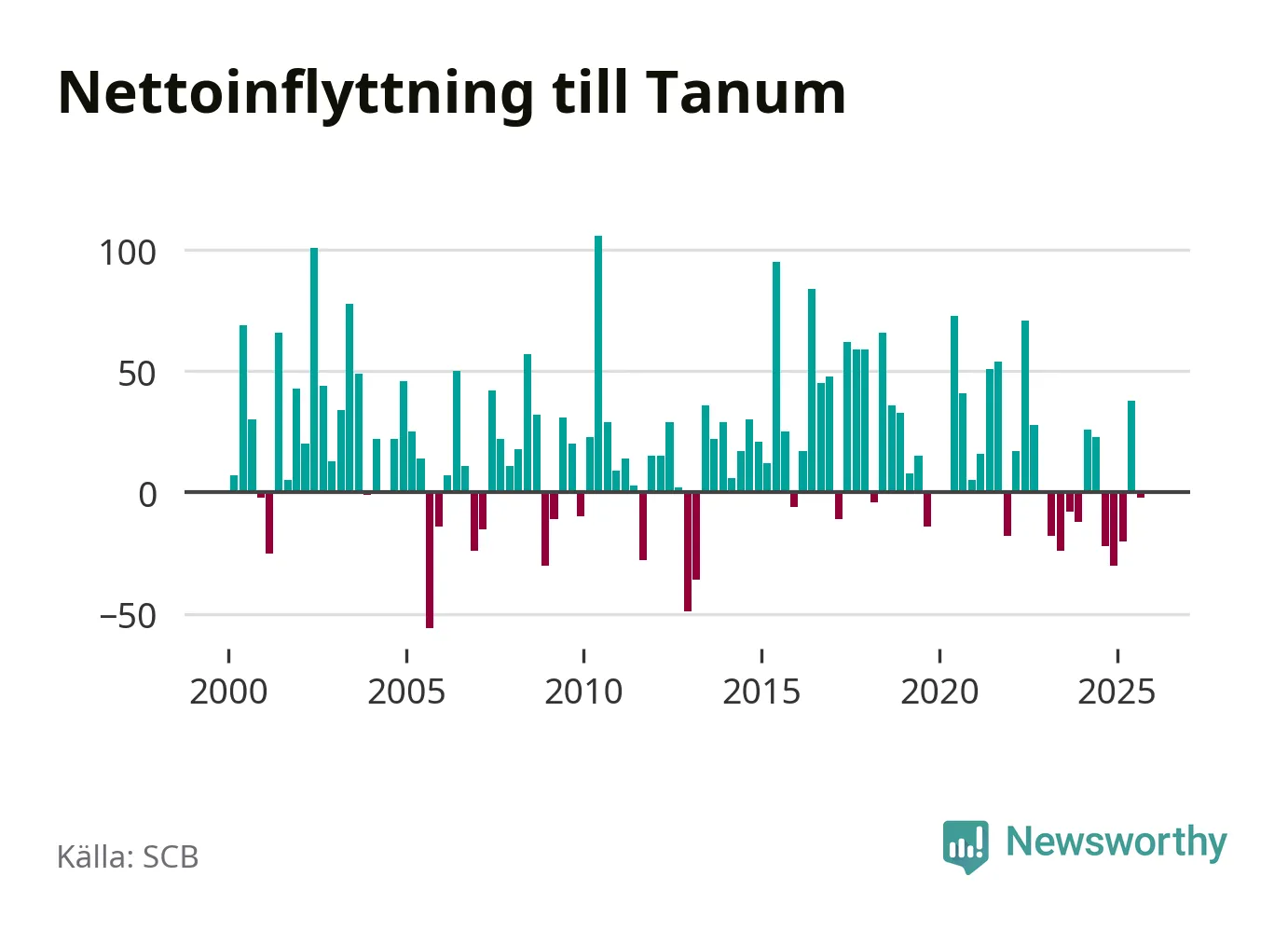 Under tredje kvartalet 2025 flyttade 200 personer till kommunen medan 202 personer flyttade därifrån. Det är historiskt sett en stor utflyttning under ett kvartal. Skillnaden mellan antalet in- och utflyttade är så liten att den lika gärna kan bero på SCB:s slumpmässiga brus. Sedan seklets början har Tanum oftast haft ett positivt flyttnetto.