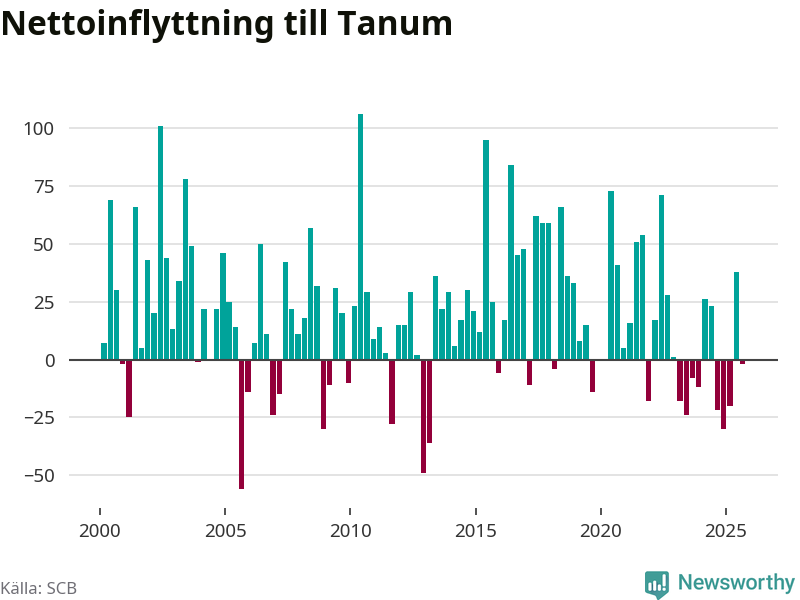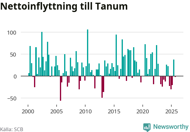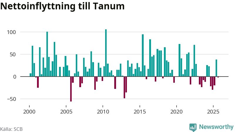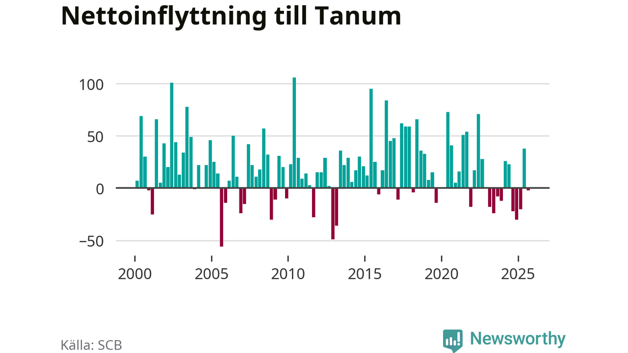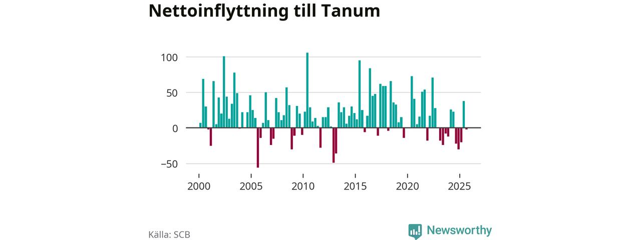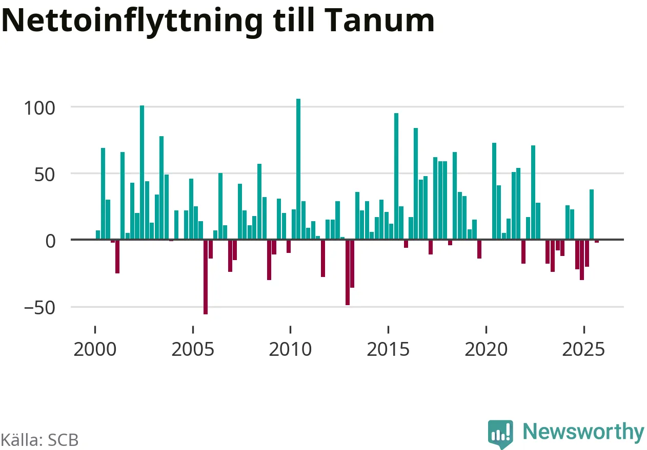 Under tredje kvartalet 2025 flyttade 200 personer till kommunen medan 202 personer flyttade därifrån. Det är historiskt sett en stor utflyttning under ett kvartal. Skillnaden mellan antalet in- och utflyttade är så liten att den lika gärna kan bero på SCB:s slumpmässiga brus. Sedan seklets början har Tanum oftast haft ett positivt flyttnetto.