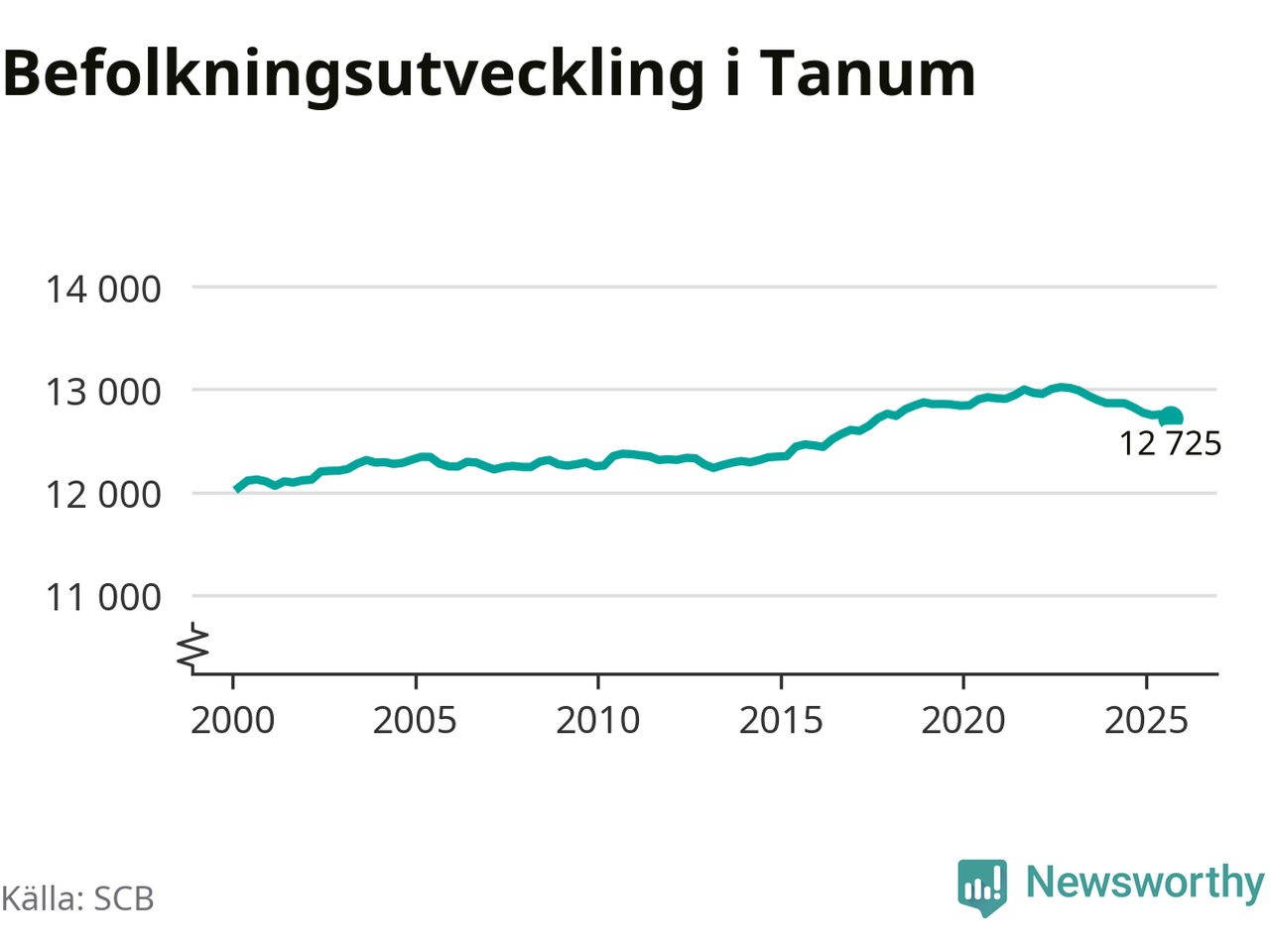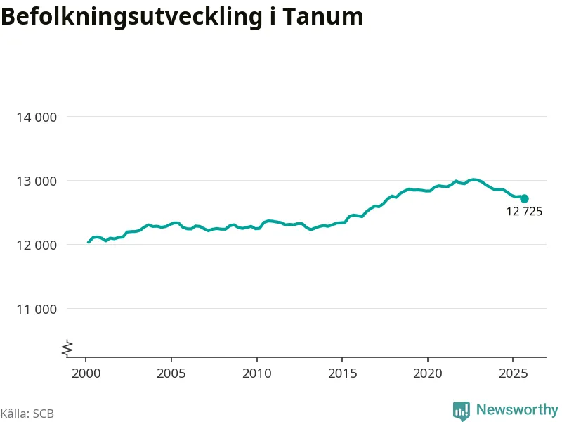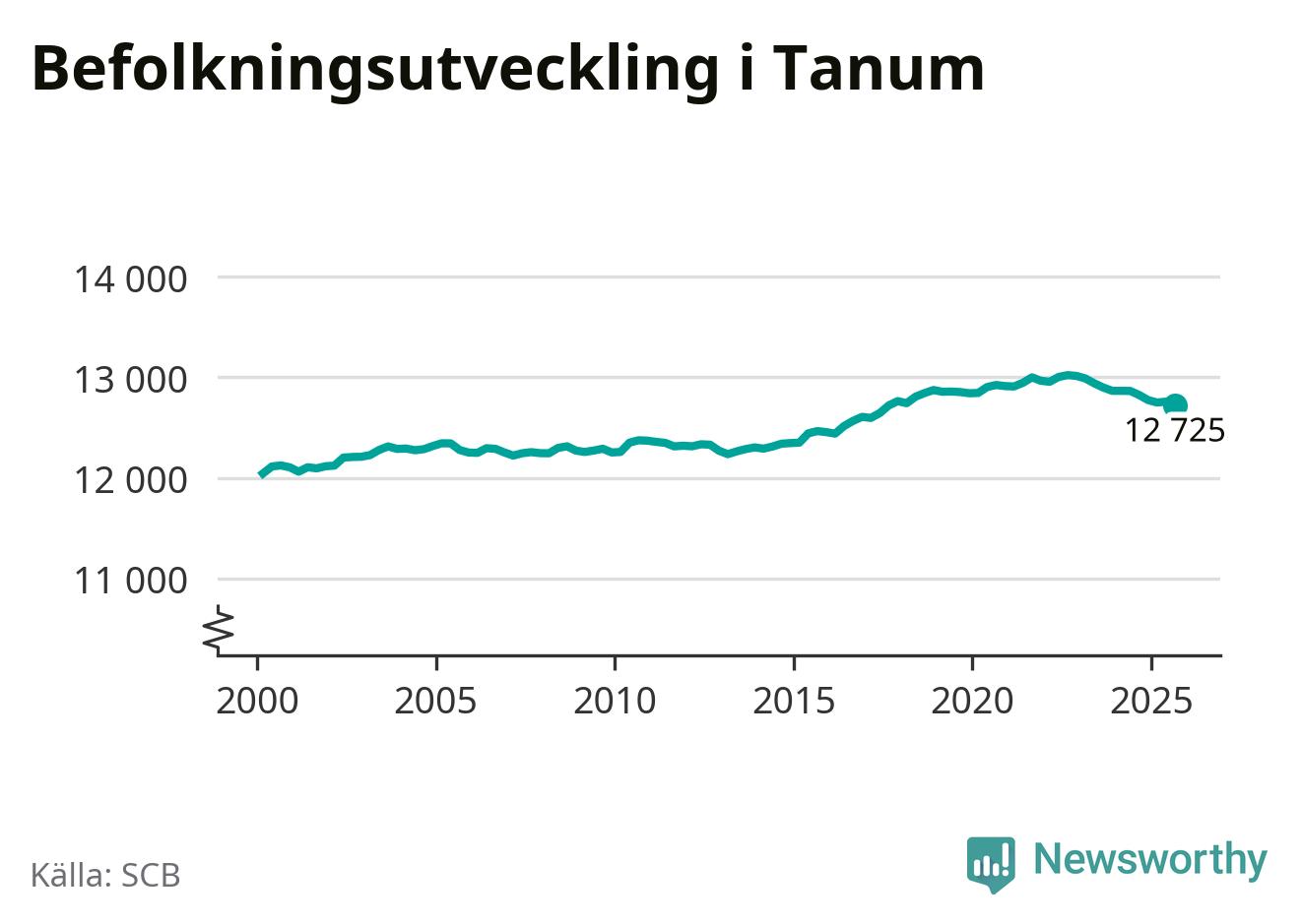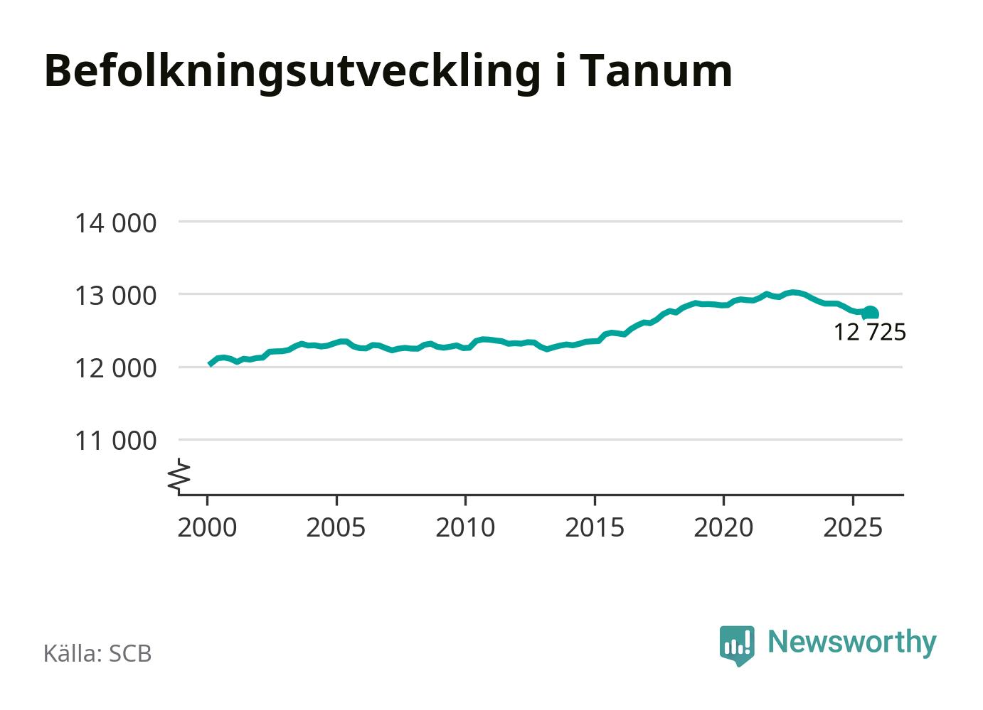 Jämfört med för ett år sedan har befolkningen i Tanum minskat med ungefär 100 personer – vilket motsvarar en nedgång på 0,8 procent. Sedan millennieskiftet har folkmängden ökat med runt 680 personer, eller 6 procent.