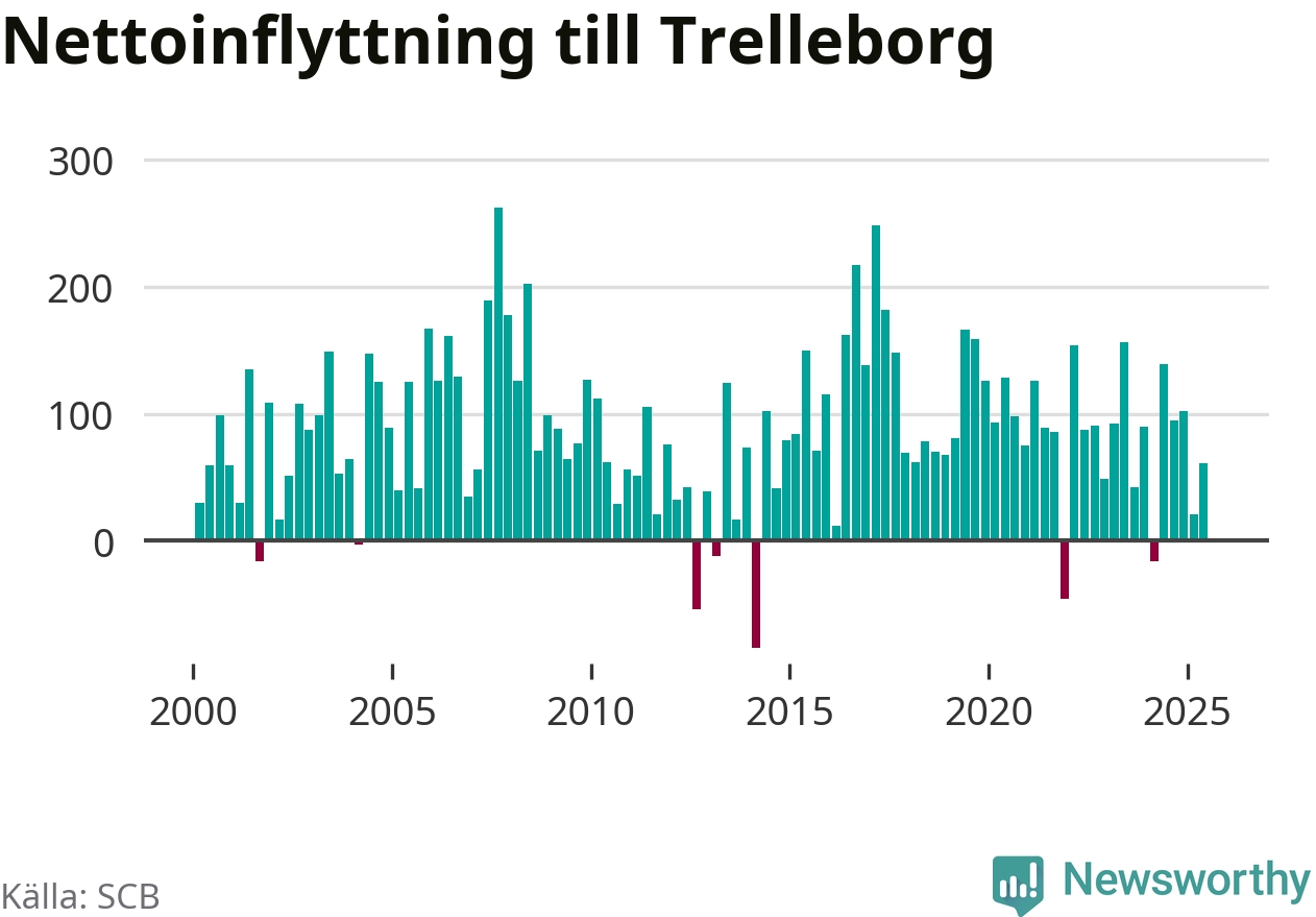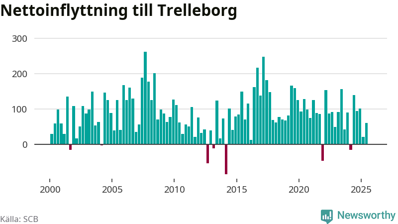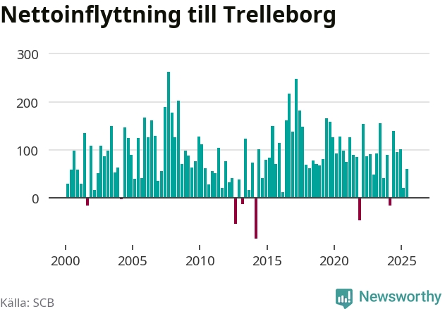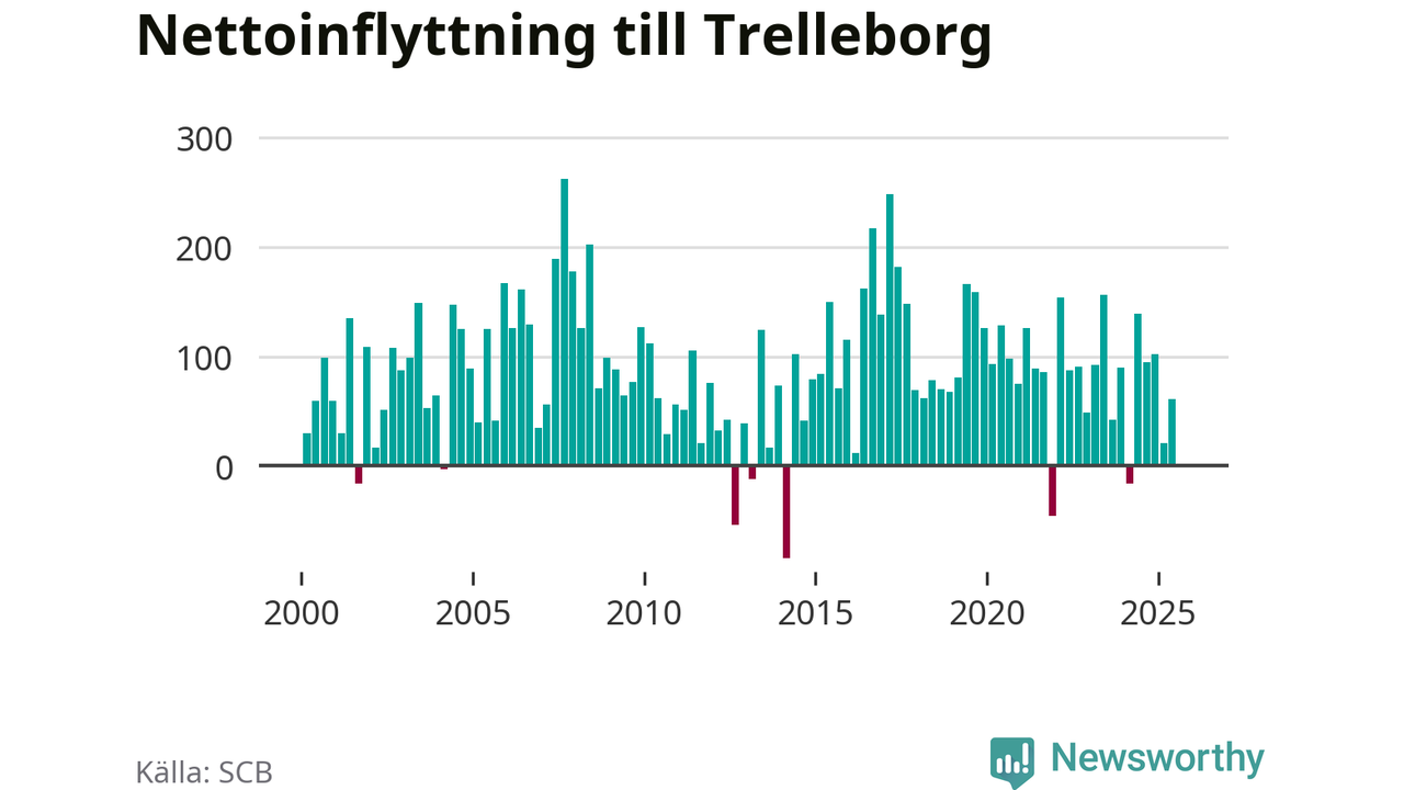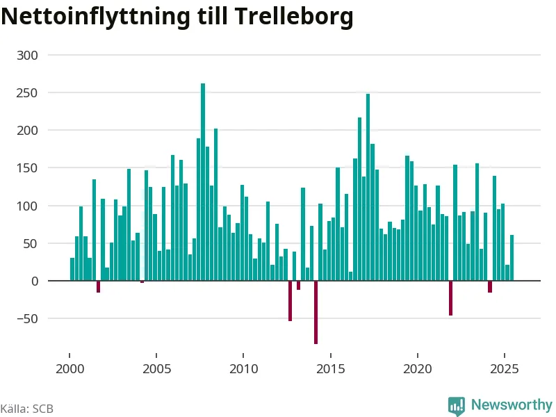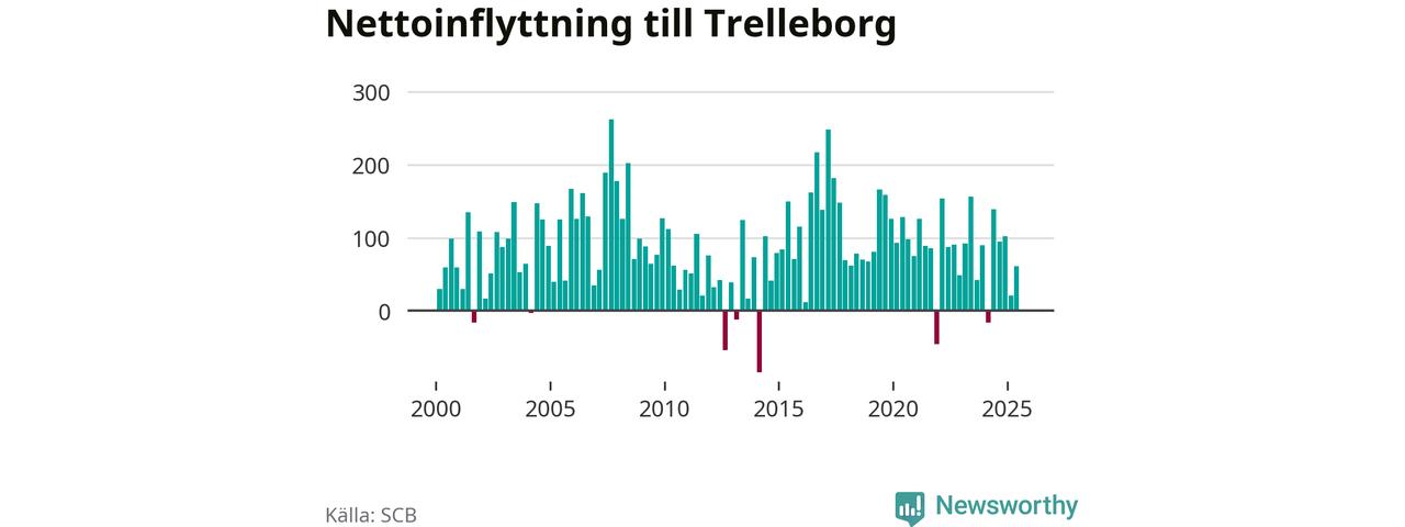 Under tredje kvartalet 2025 flyttade 642 personer till kommunen medan 643 personer flyttade därifrån. Det är historiskt sett en stor utflyttning under ett kvartal. Skillnaden mellan antalet in- och utflyttade är så liten att den lika gärna kan bero på SCB:s slumpmässiga brus. Sedan seklets början har Trelleborg haft ett positivt flyttnetto under nästan alla kvartal.