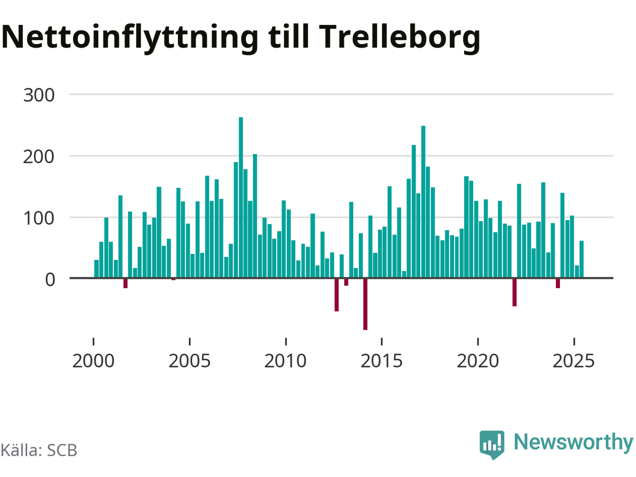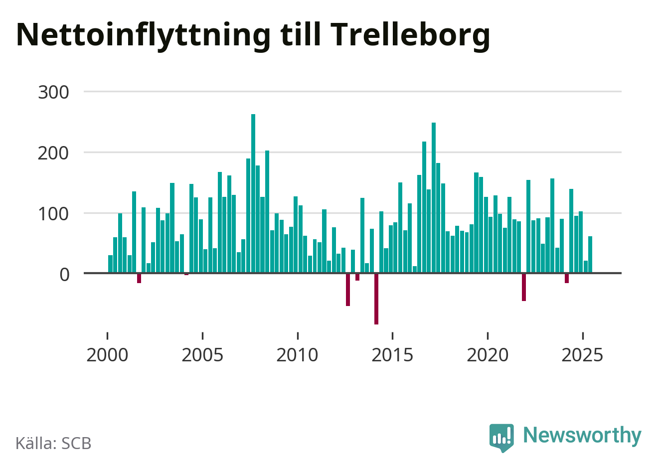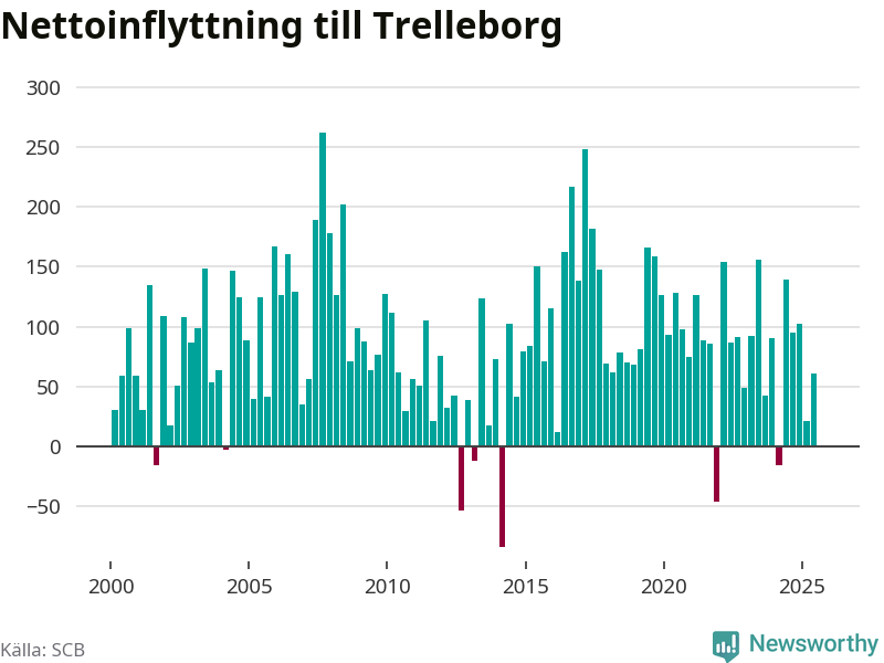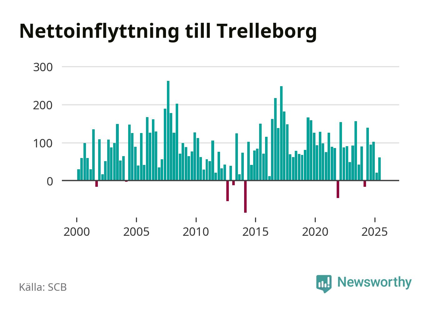 Under tredje kvartalet 2025 flyttade 642 personer till kommunen medan 643 personer flyttade därifrån. Det är historiskt sett en stor utflyttning under ett kvartal. Skillnaden mellan antalet in- och utflyttade är så liten att den lika gärna kan bero på SCB:s slumpmässiga brus. Sedan seklets början har Trelleborg haft ett positivt flyttnetto under nästan alla kvartal.