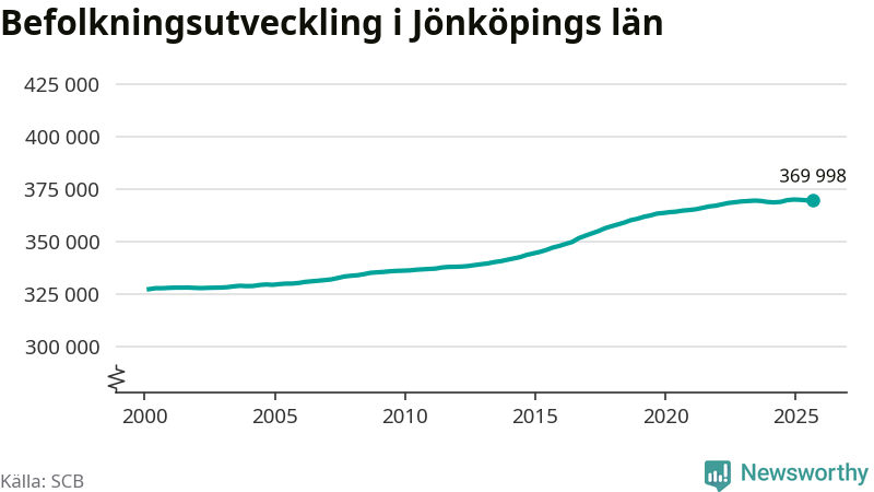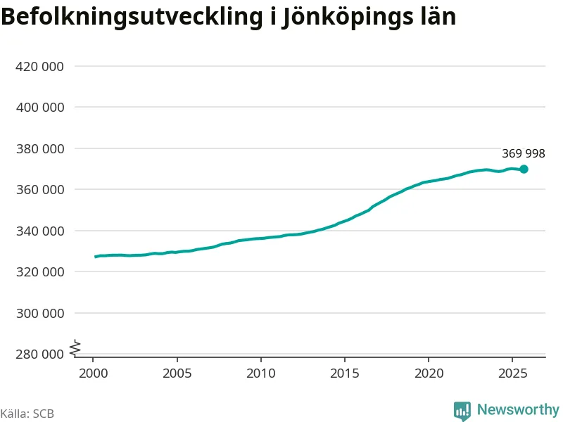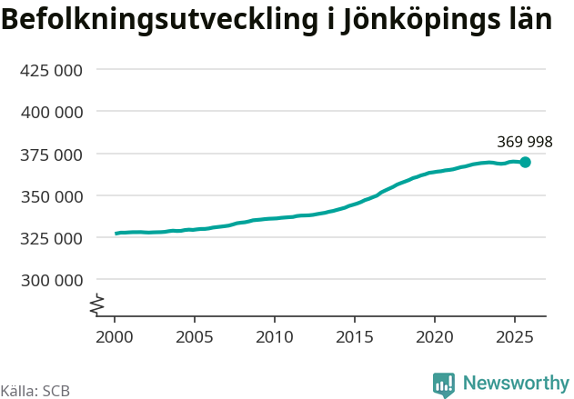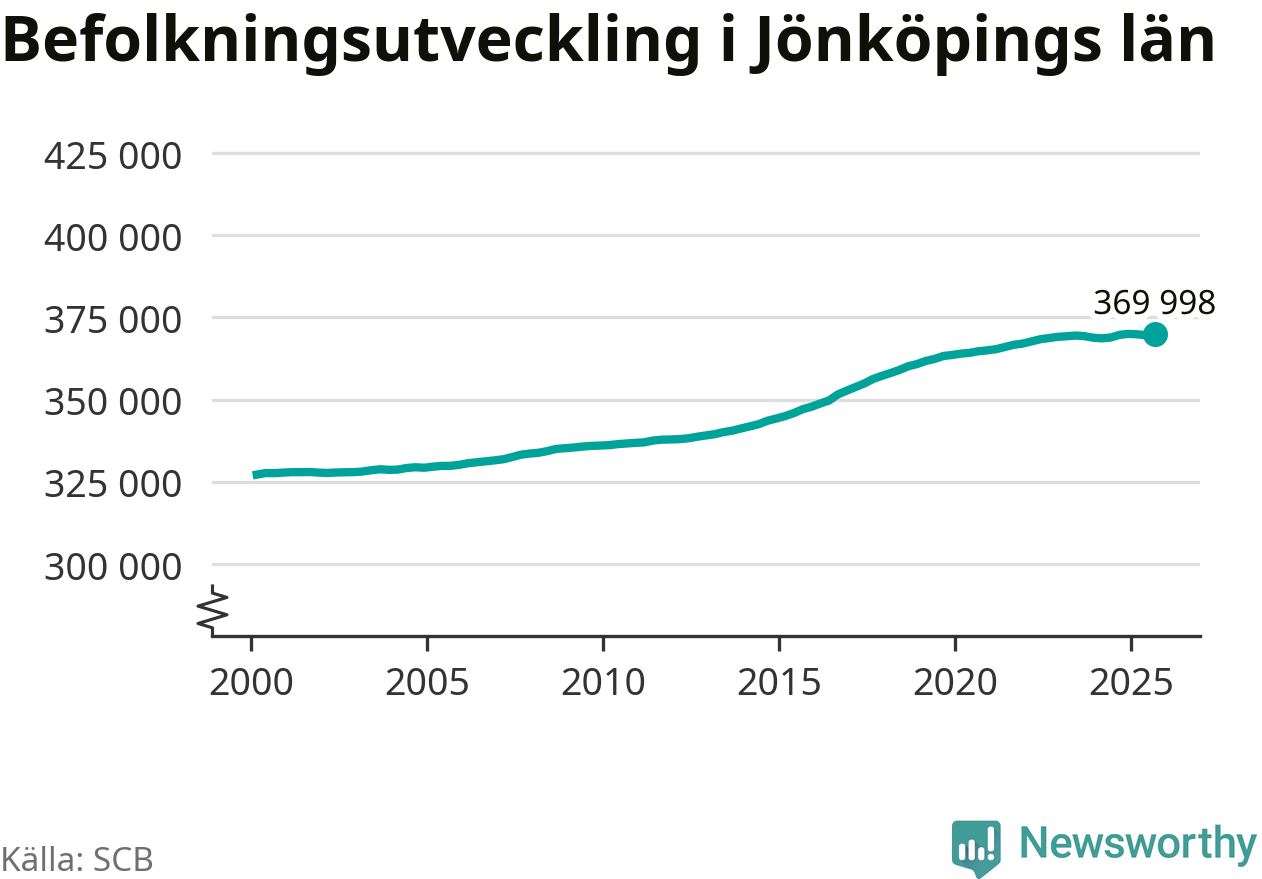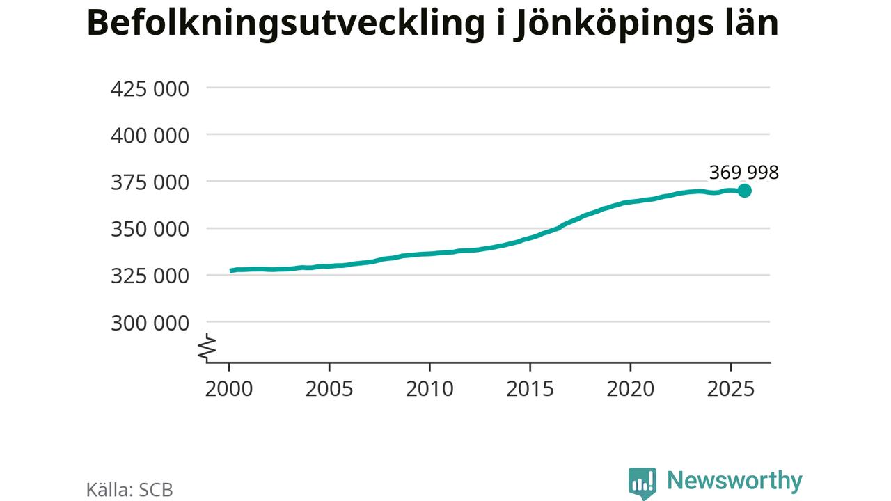 Befolkningen ökade i Jönköpings län under det tredje kvartalet 2025. Den 30 september bodde enligt SCB:s senaste siffror 369 998 personer i länet, vilket är 375 fler än i slutet av andra kvartalet.