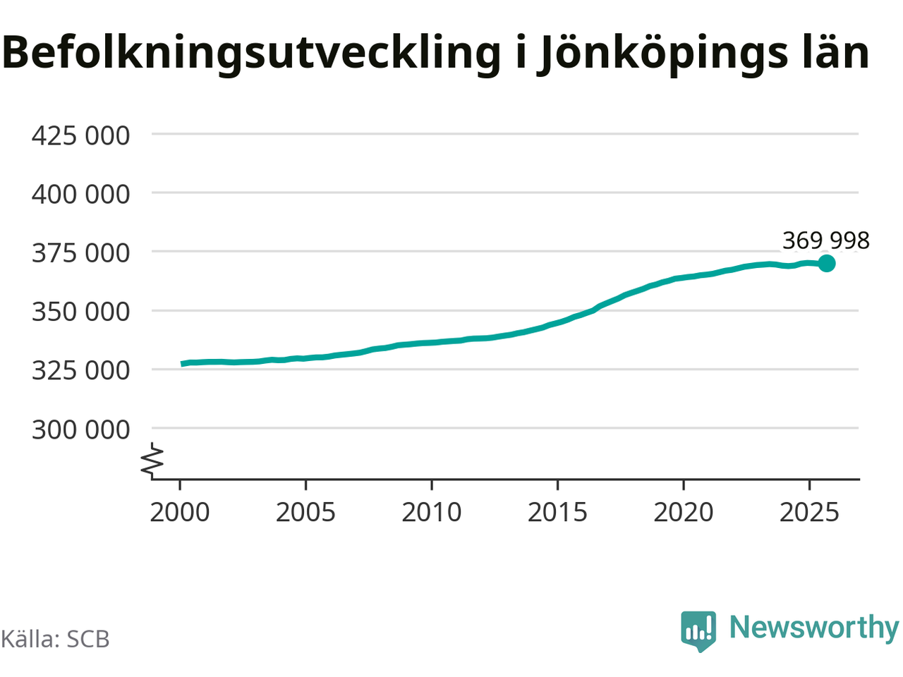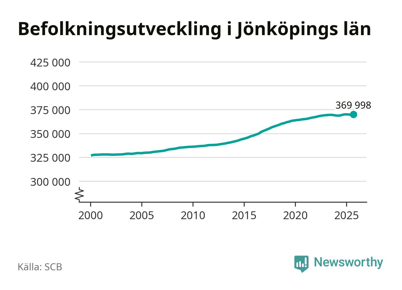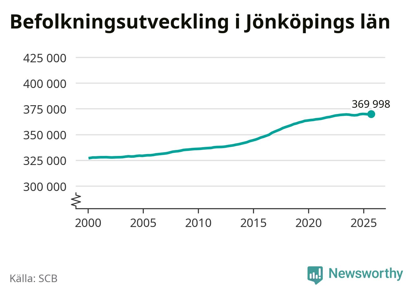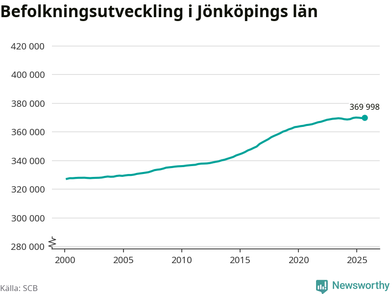 Jämfört med för ett år sedan har befolkningen i Jönköpings län ökat med ungefär 280 personer. Sedan millennieskiftet har folkmängden ökat med runt 42 790 personer, eller 13 procent.