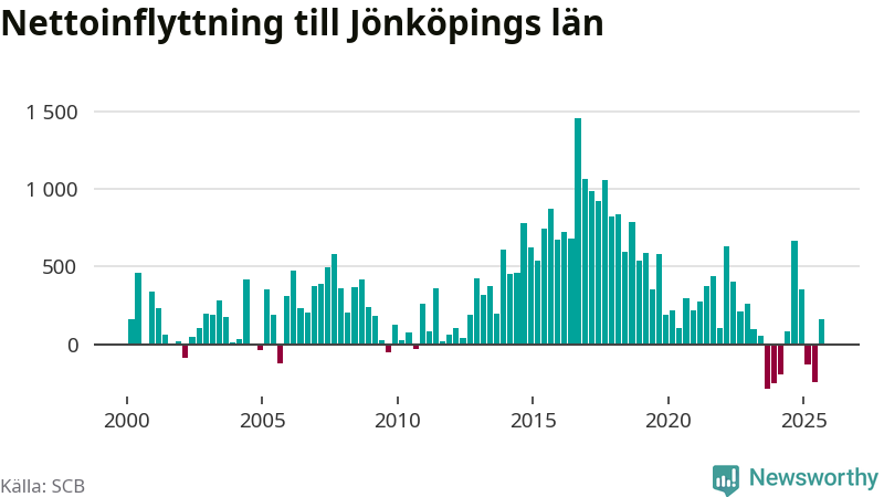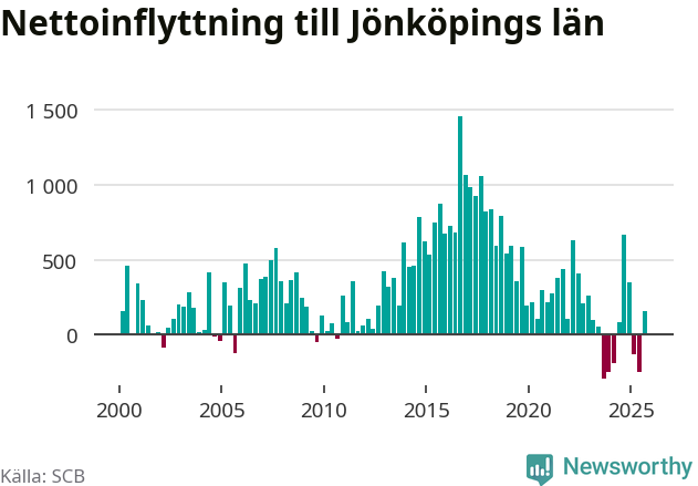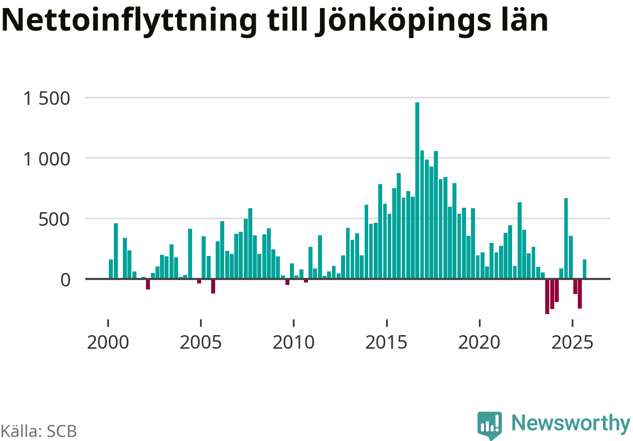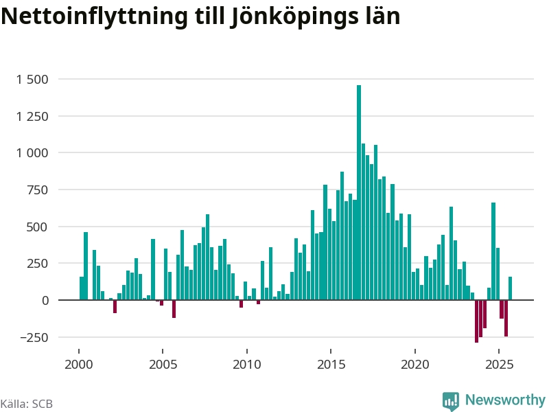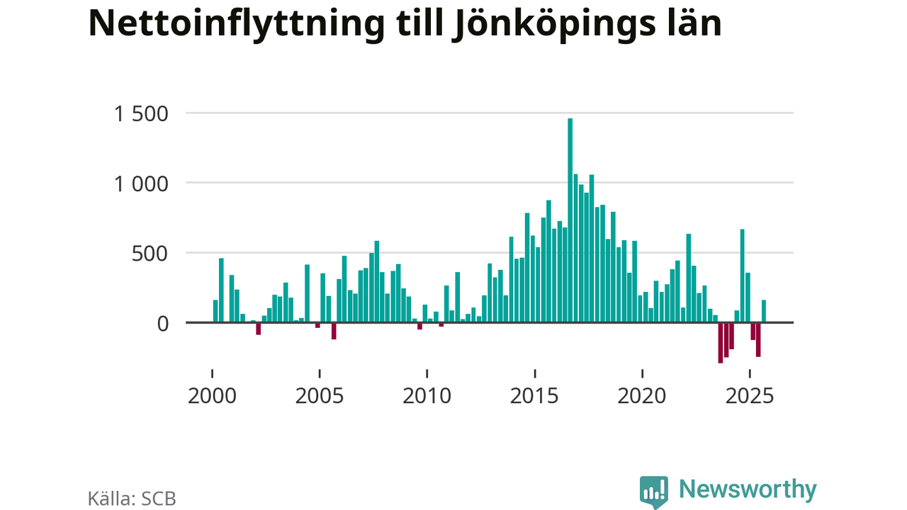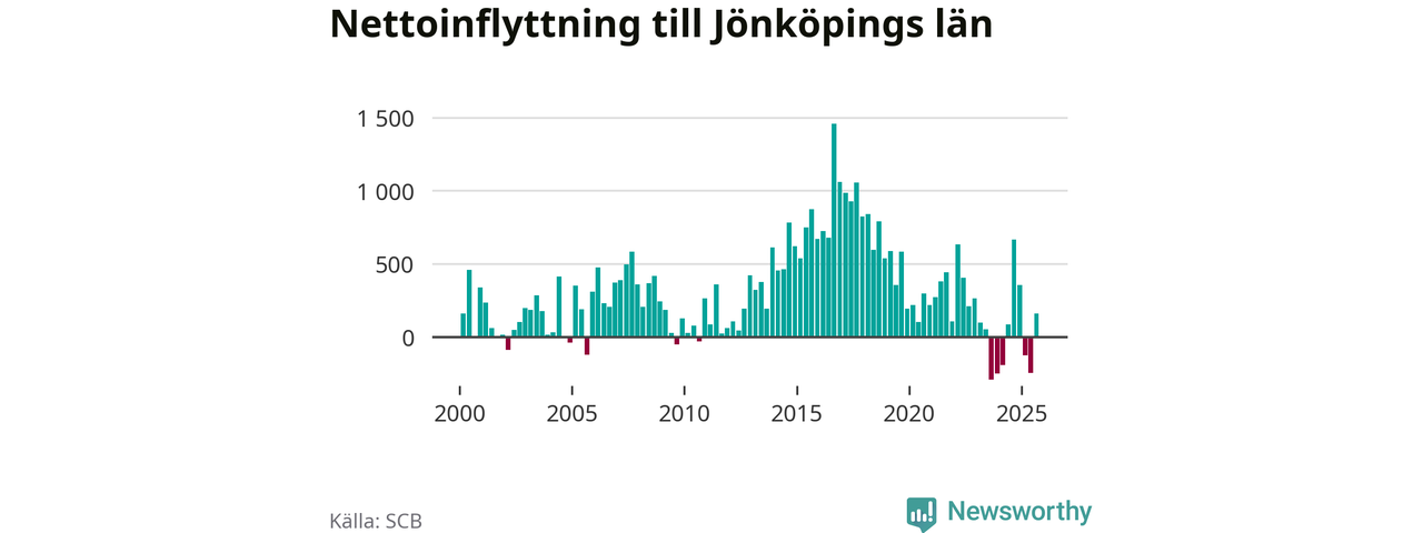 Under tredje kvartalet 2025 flyttade 4 179 personer till länet medan 4 018 personer flyttade därifrån. Det är historiskt sett en stor inflyttning under ett kvartal – men samtidigt var utflyttningen relativt stor. Sedan seklets början har Jönköpings län haft ett positivt flyttnetto under nästan alla kvartal, inklusive det senaste kvartalet.
