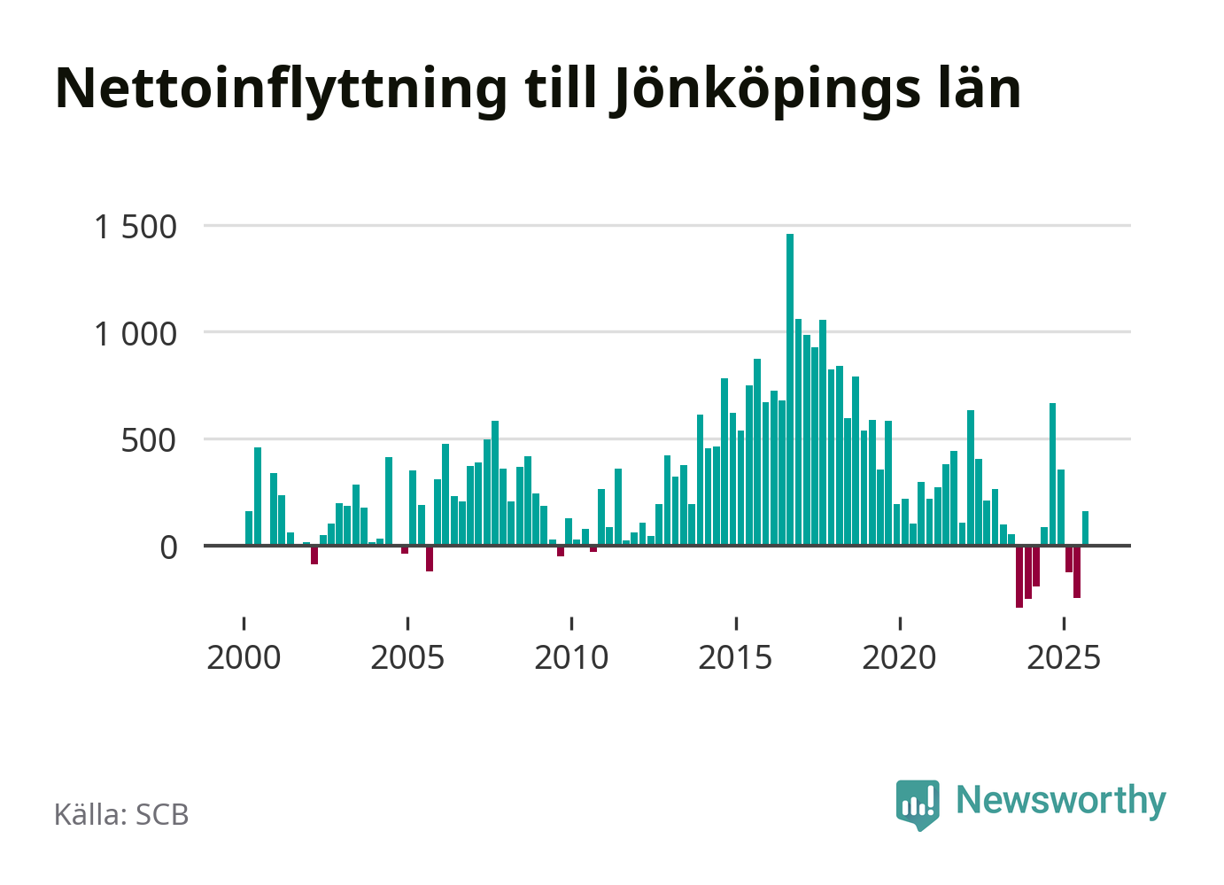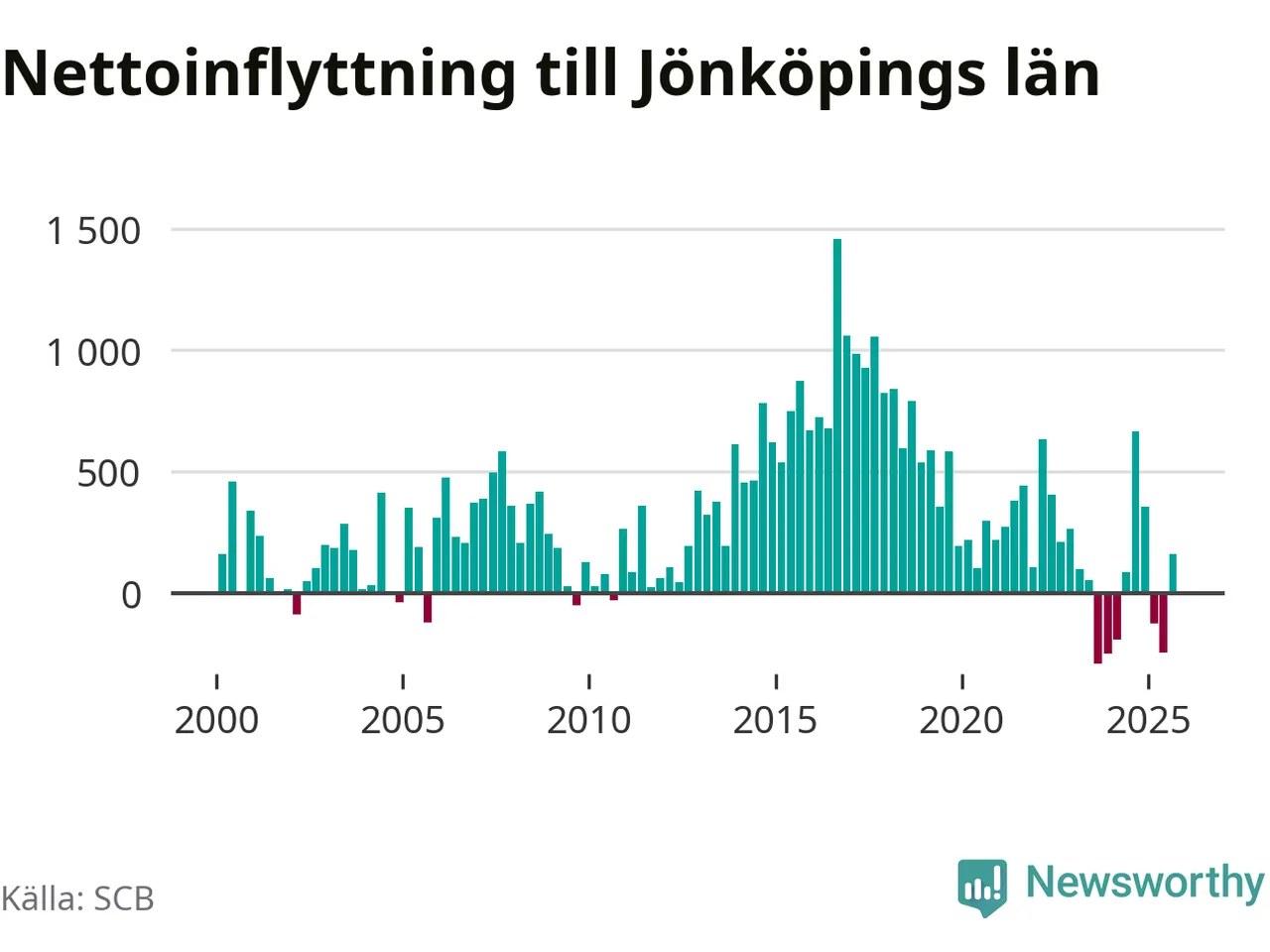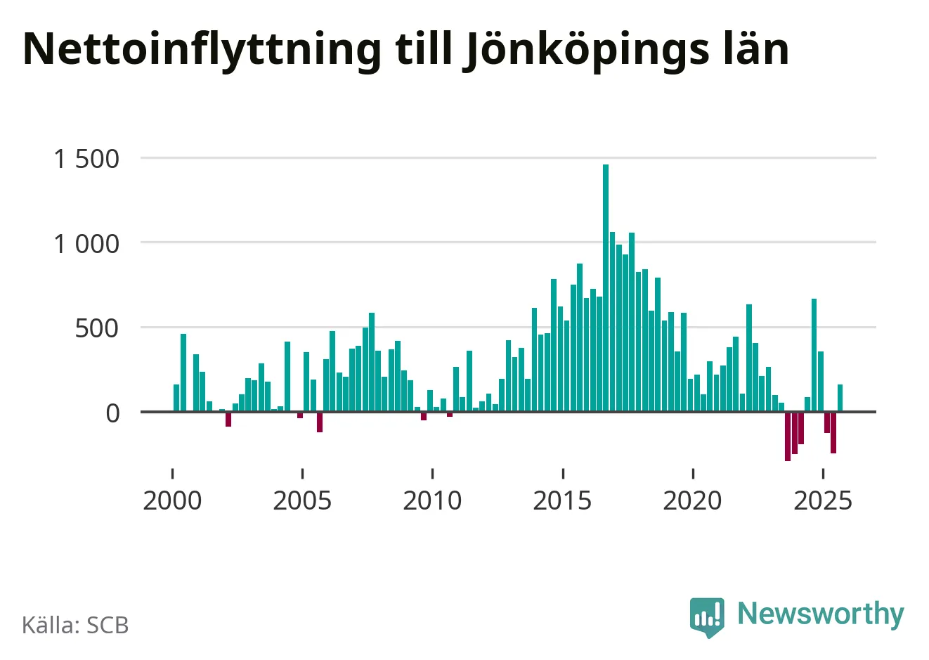Under tredje kvartalet 2025 flyttade 4 179 personer till länet medan 4 018 personer flyttade därifrån. Det är historiskt sett en stor inflyttning under ett kvartal – men samtidigt var utflyttningen relativt stor. Sedan seklets början har Jönköpings län haft ett positivt flyttnetto under nästan alla kvartal, inklusive det senaste kvartalet.