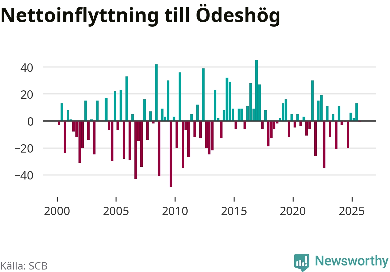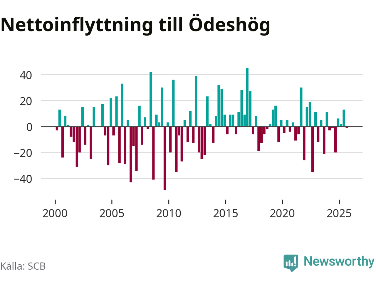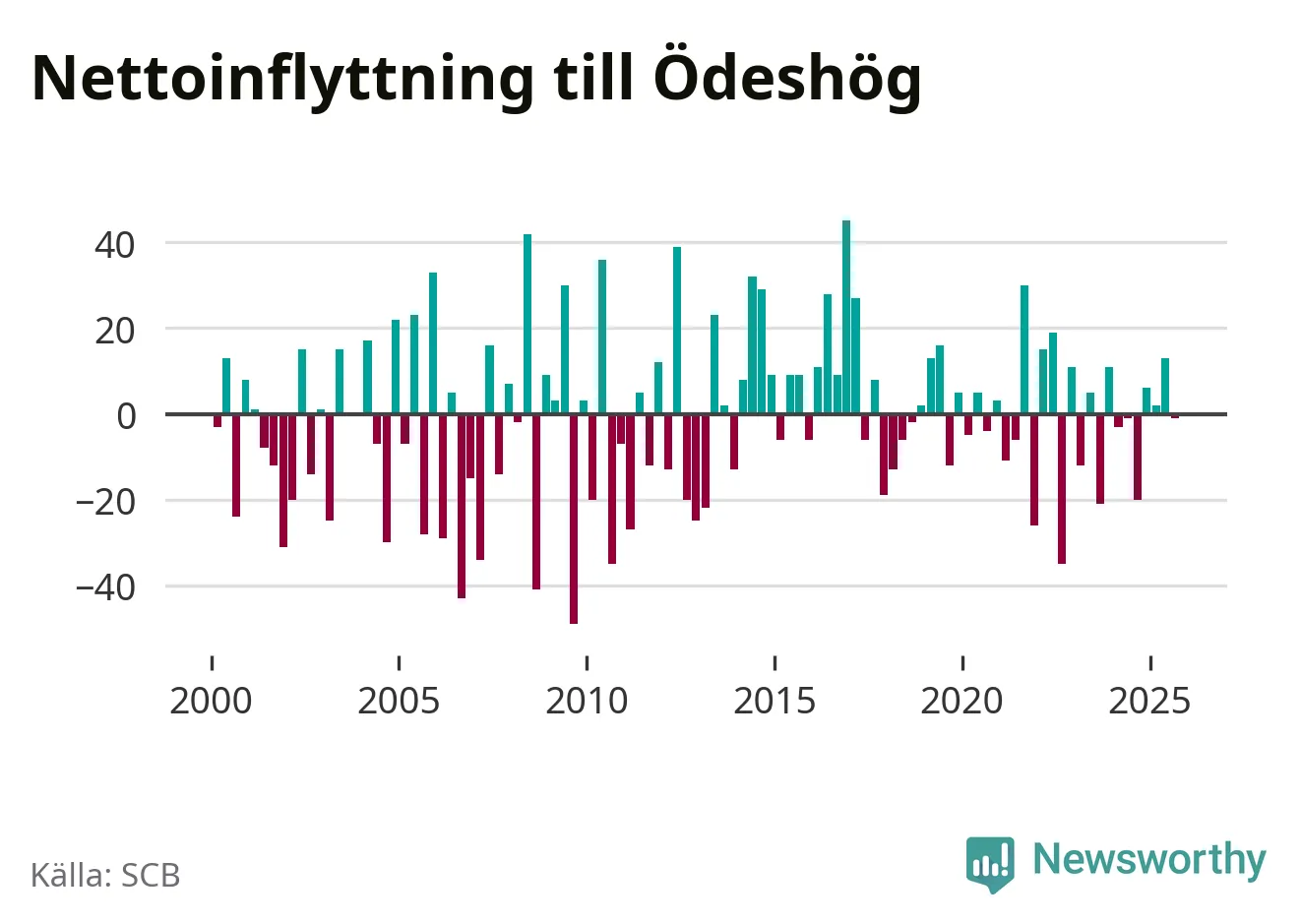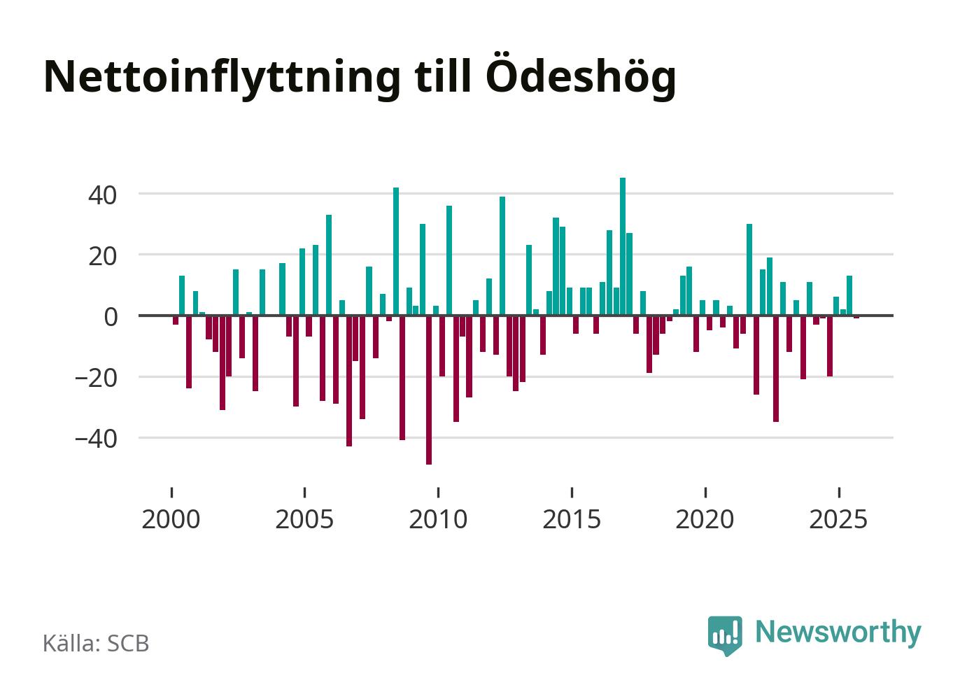 Under tredje kvartalet 2025 flyttade 76 personer till kommunen medan 77 personer flyttade därifrån. Skillnaden mellan antalet in- och utflyttade är så liten att den lika gärna kan bero på SCB:s slumpmässiga brus. Sedan seklets början har Ödeshög haft ungefär lika många kvartal med positivt flyttnetto som negativt.