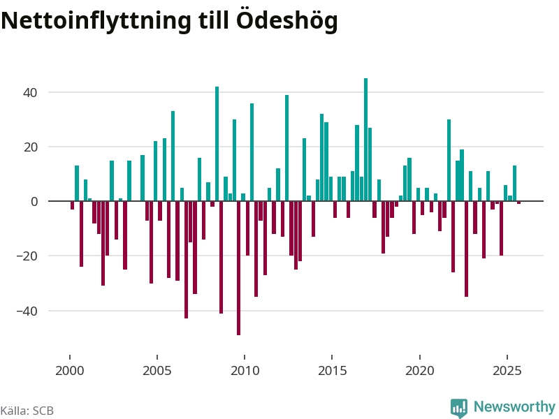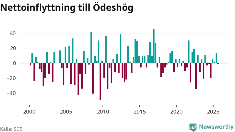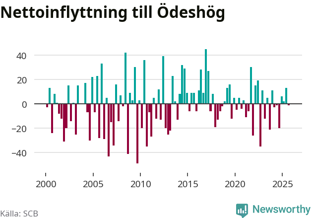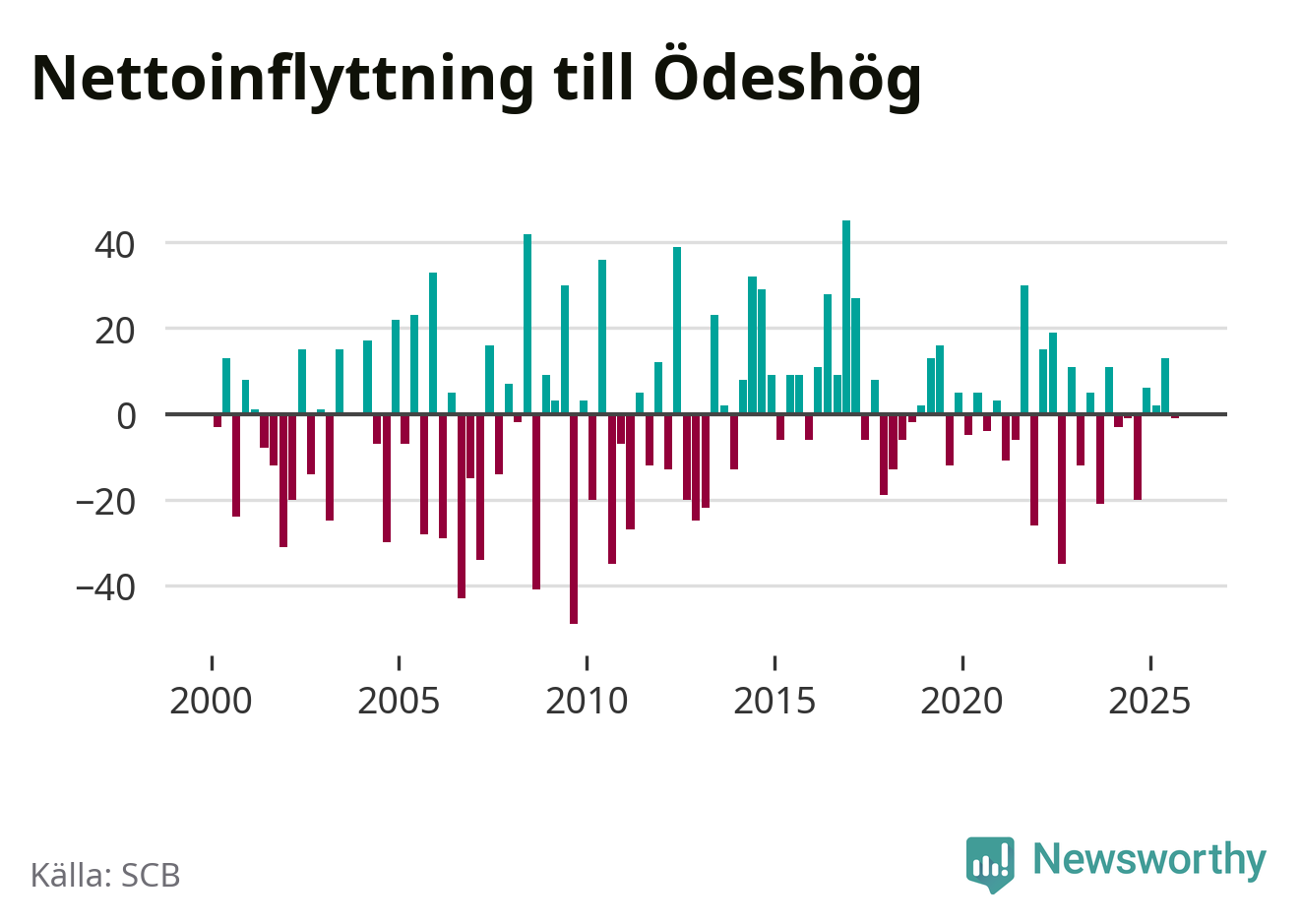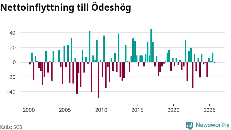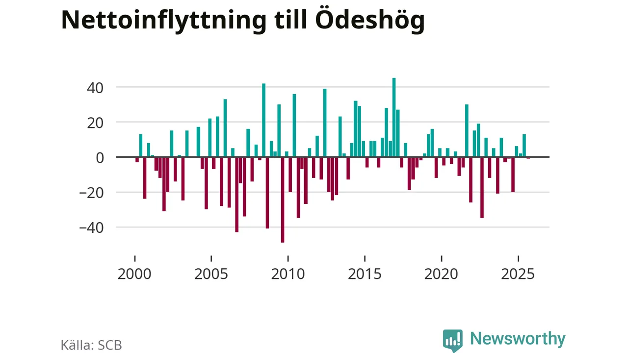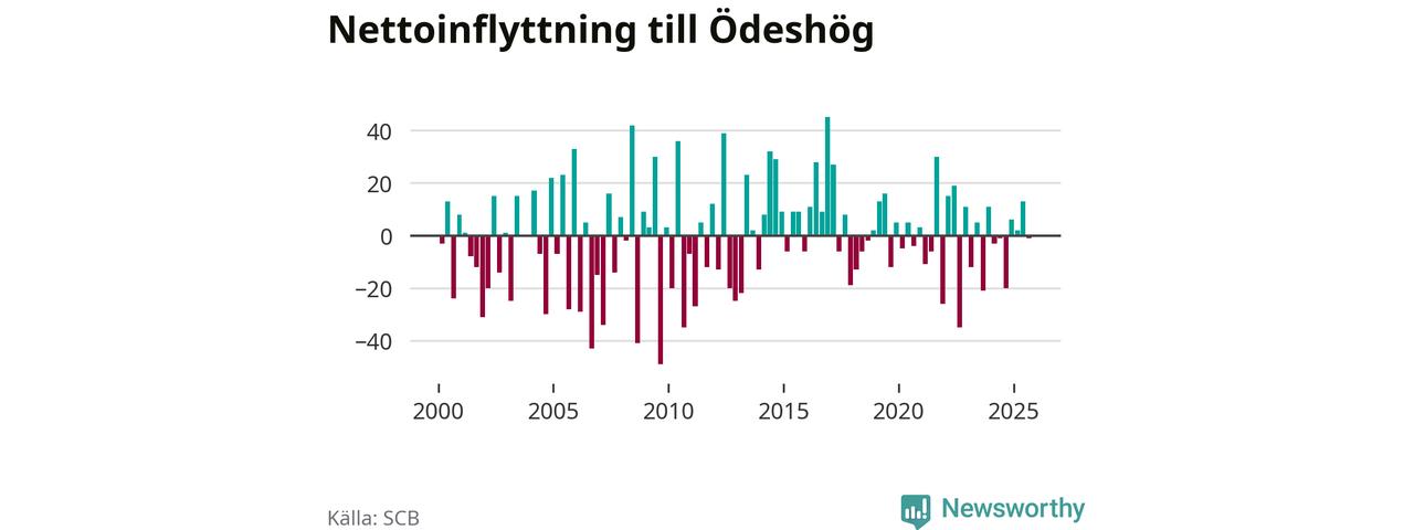 Under tredje kvartalet 2025 flyttade 76 personer till kommunen medan 77 personer flyttade därifrån. Skillnaden mellan antalet in- och utflyttade är så liten att den lika gärna kan bero på SCB:s slumpmässiga brus. Sedan seklets början har Ödeshög haft ungefär lika många kvartal med positivt flyttnetto som negativt.