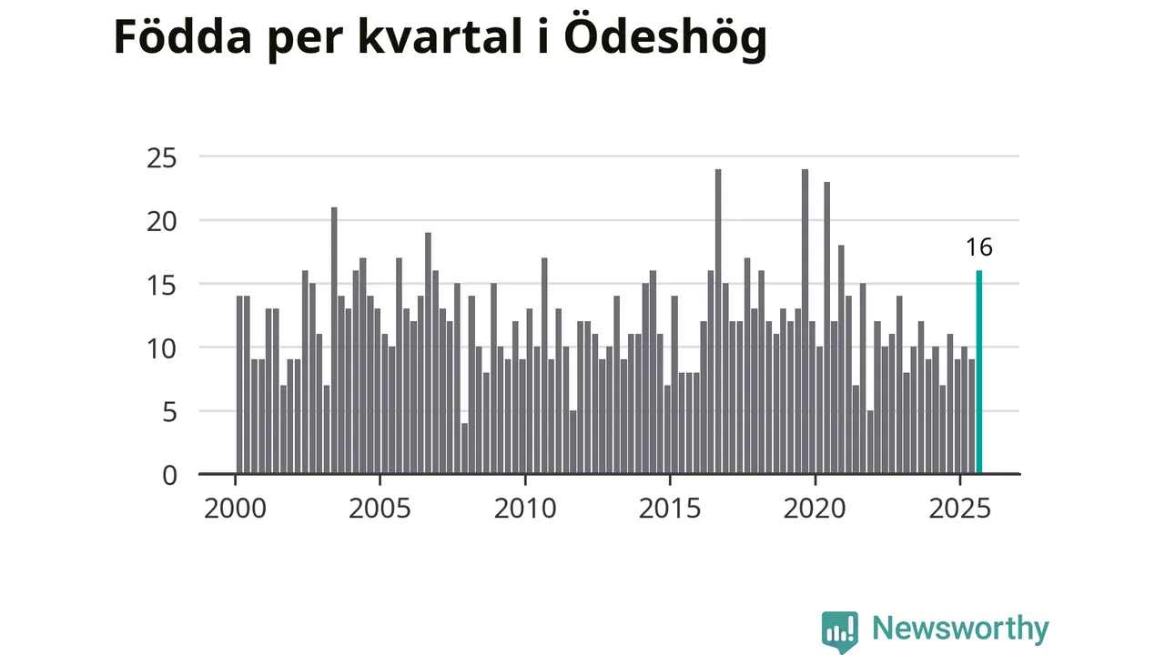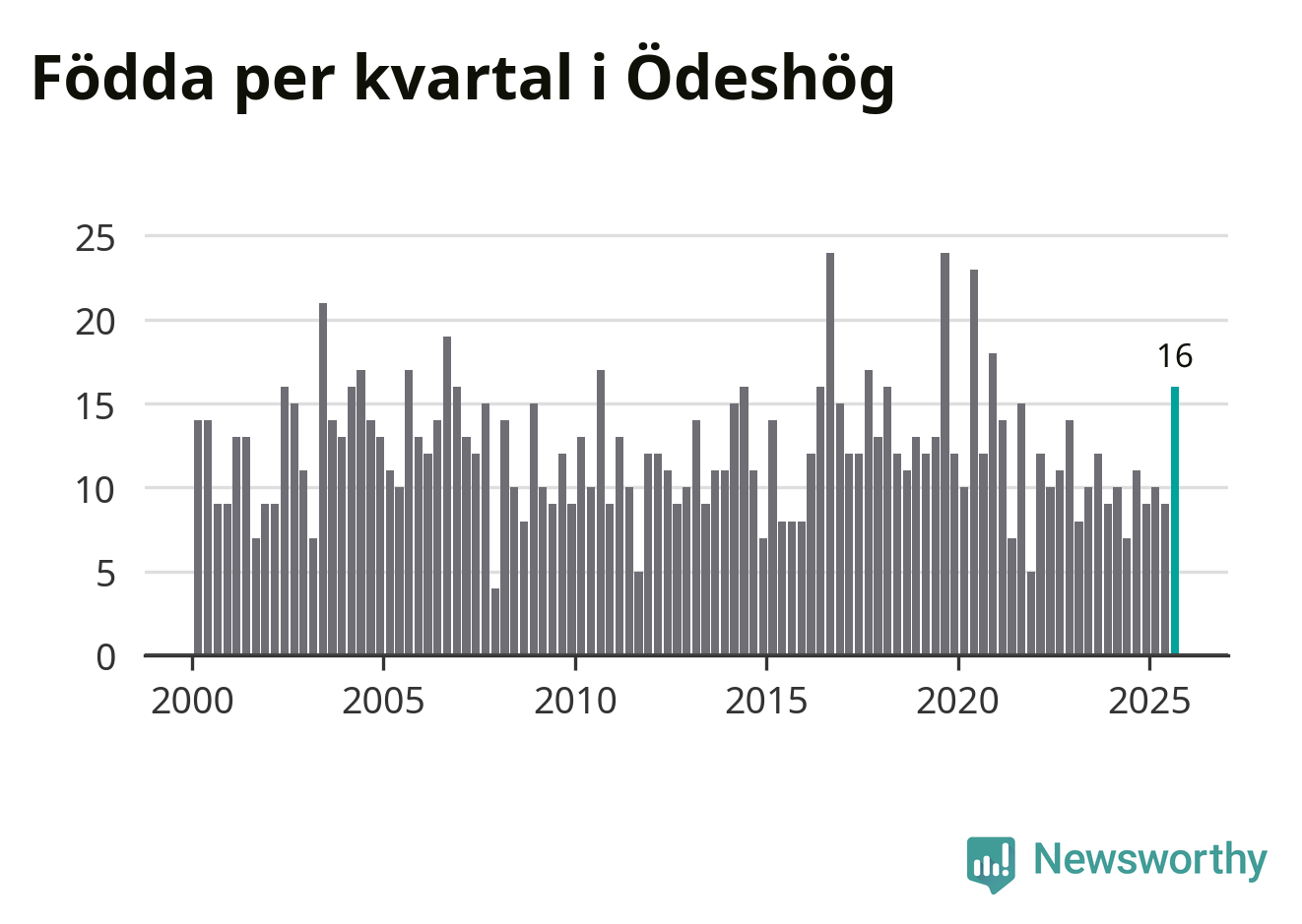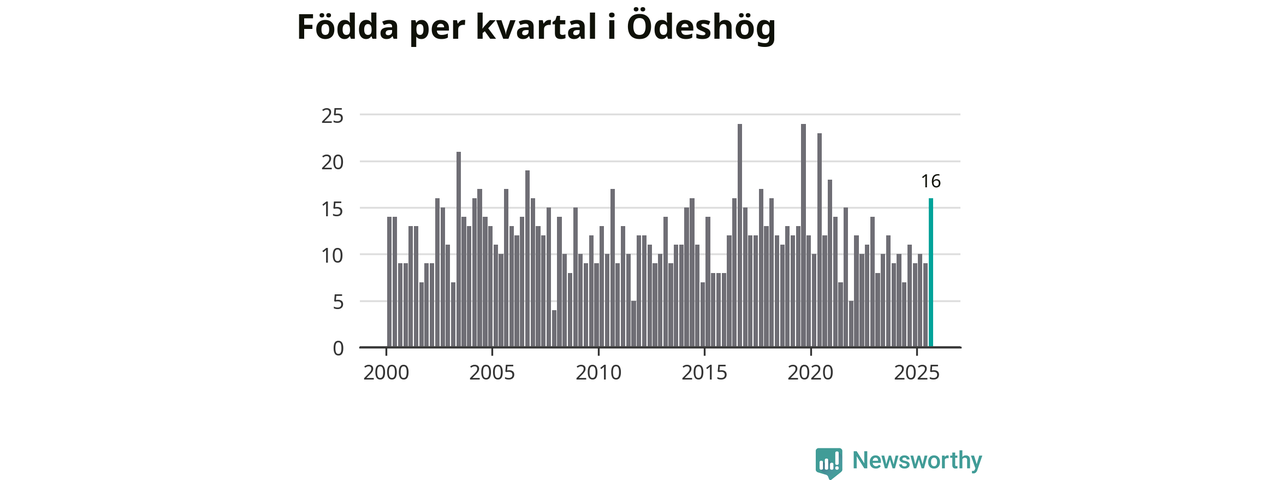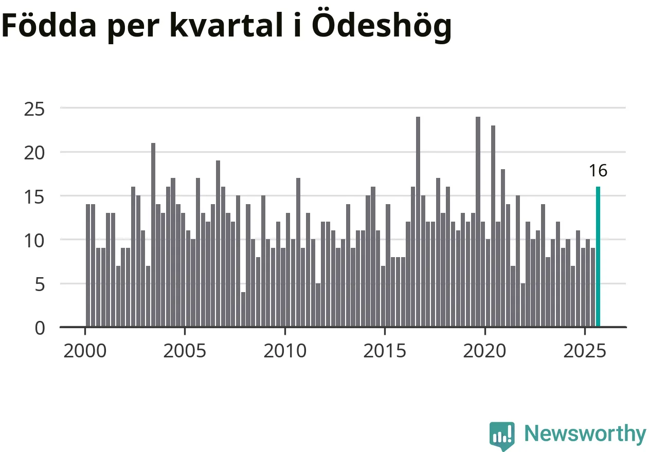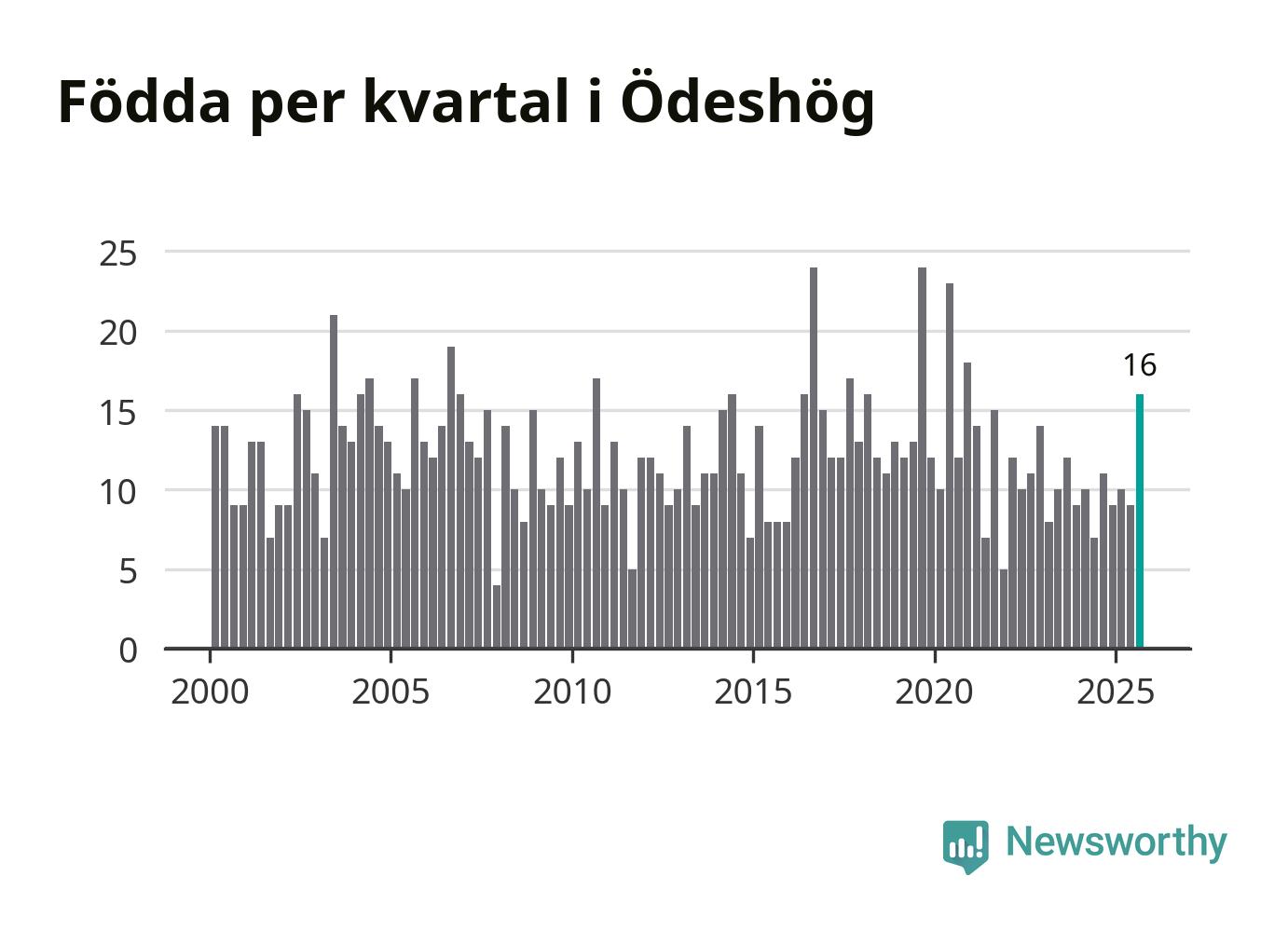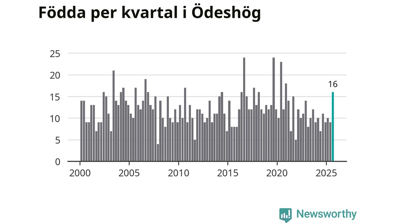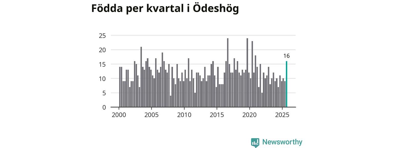 Enligt SCB:s siffror föddes 16 barn i Ödeshög under det senaste kvartalet, vilket är en relativt hög siffra historiskt sett. Samtidigt avled 19 personer. Skillnaden mellan antal födda och döda är så liten att det inte går att säga om det beror på något annat än SCB:s röjandeskydd. Kommunen har oftast haft negativt födelsenetto tidigare.