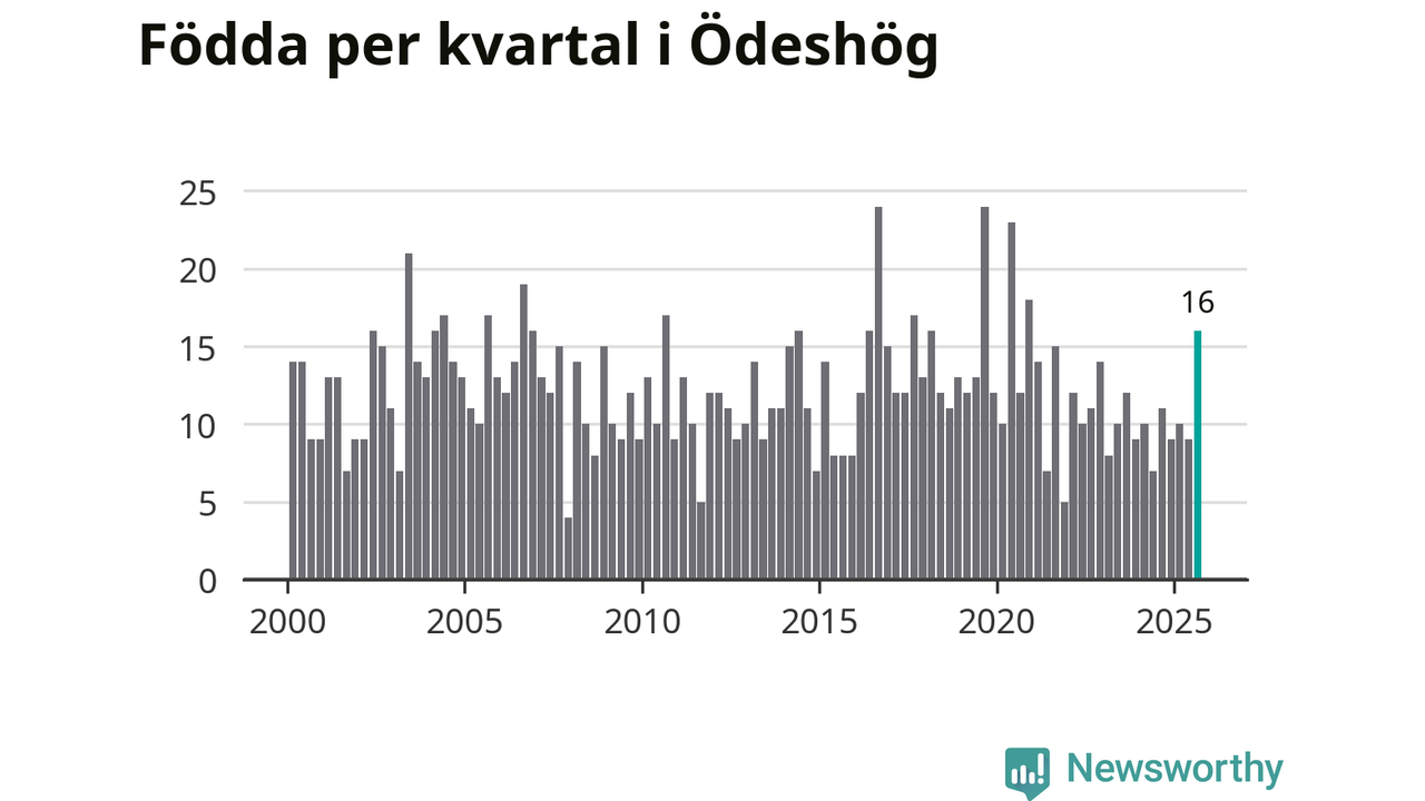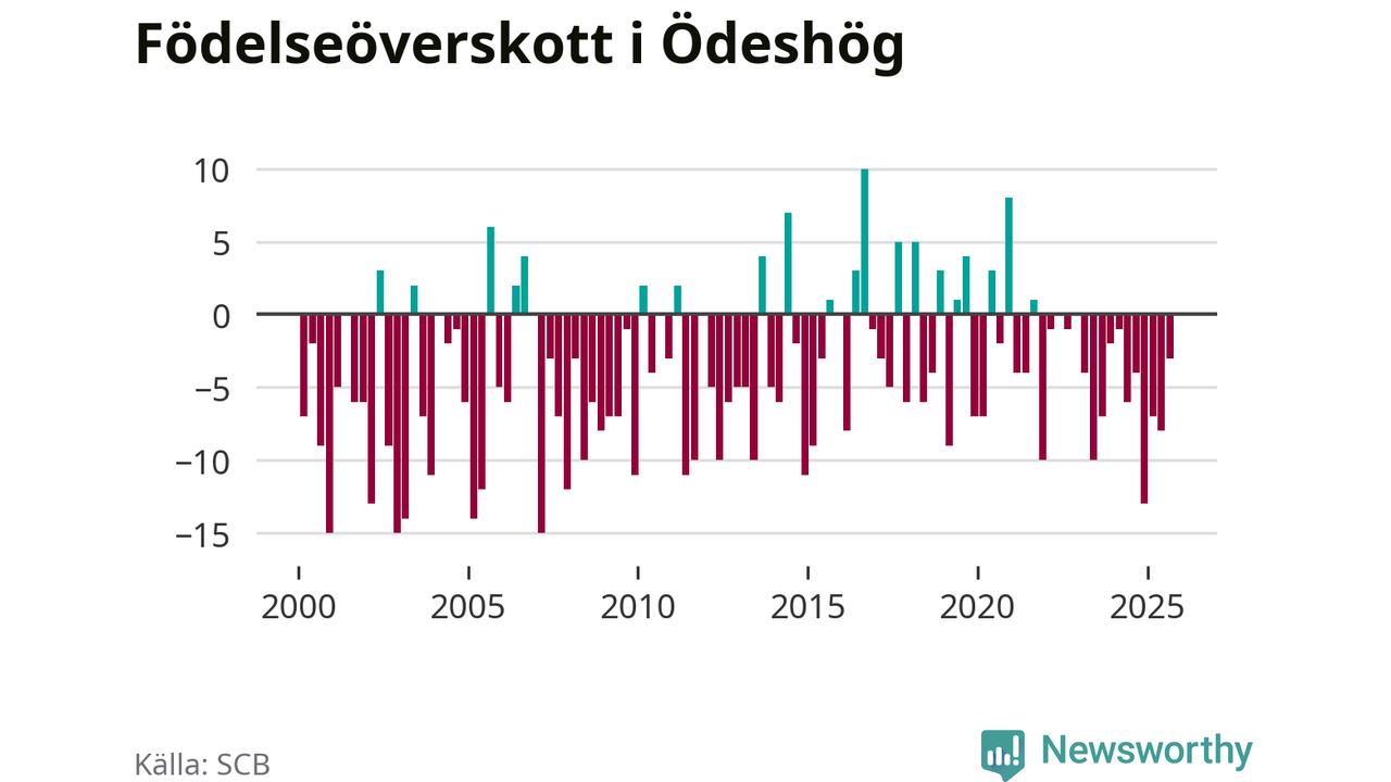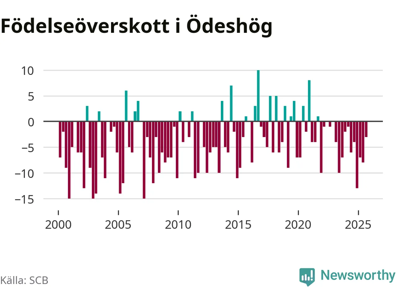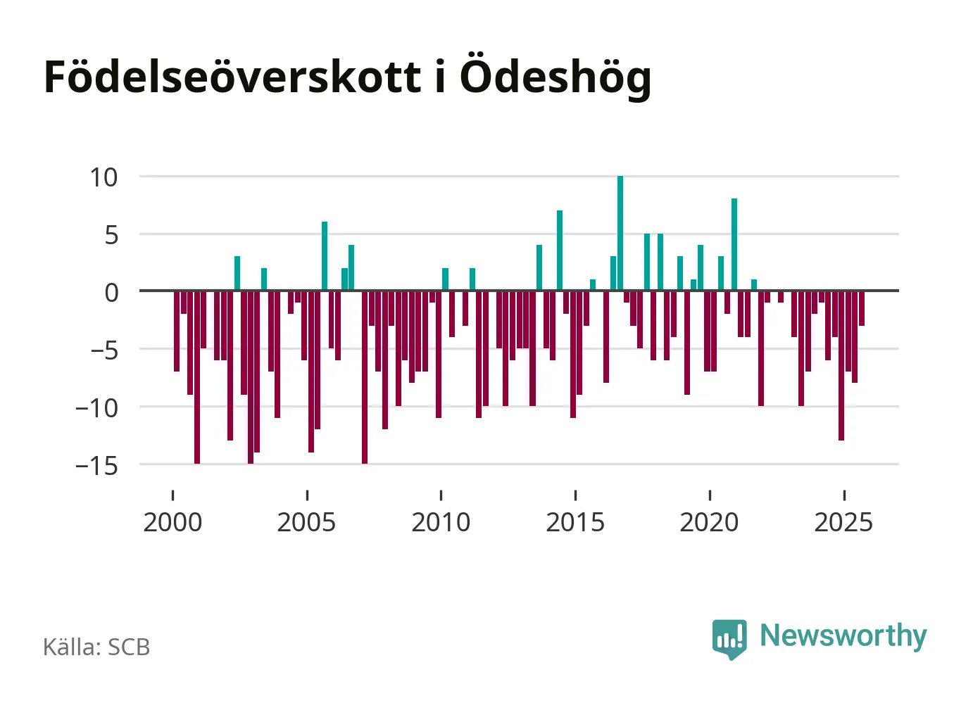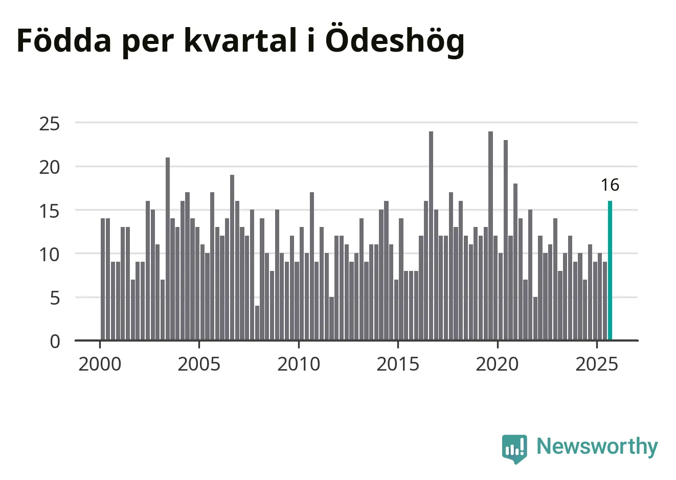 Enligt SCB:s siffror föddes 16 barn i Ödeshög under det senaste kvartalet, vilket är en relativt hög siffra historiskt sett. Samtidigt avled 19 personer. Skillnaden mellan antal födda och döda är så liten att det inte går att säga om det beror på något annat än SCB:s röjandeskydd. Kommunen har oftast haft negativt födelsenetto tidigare.