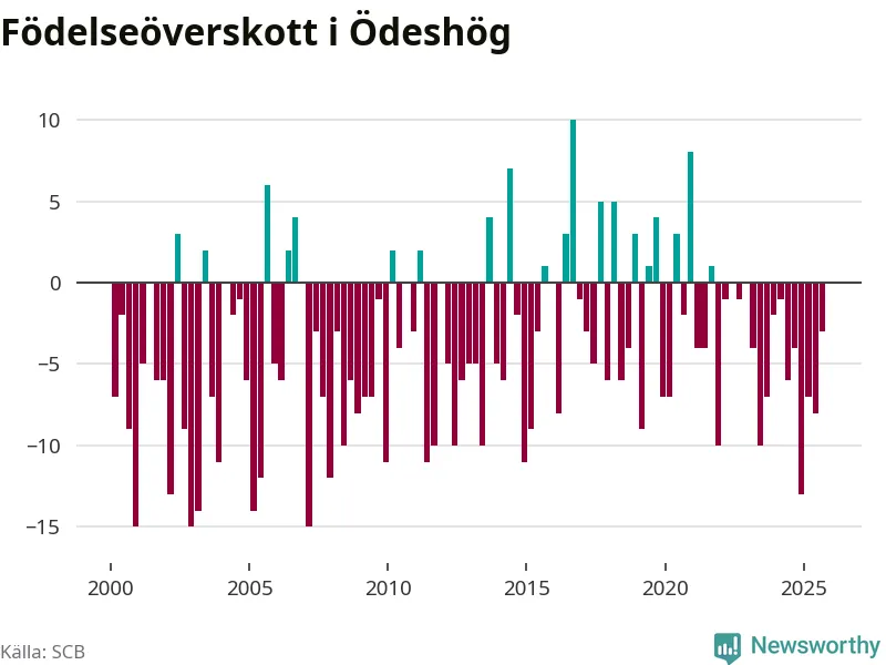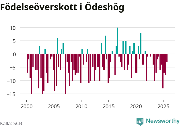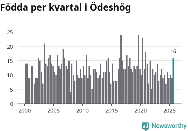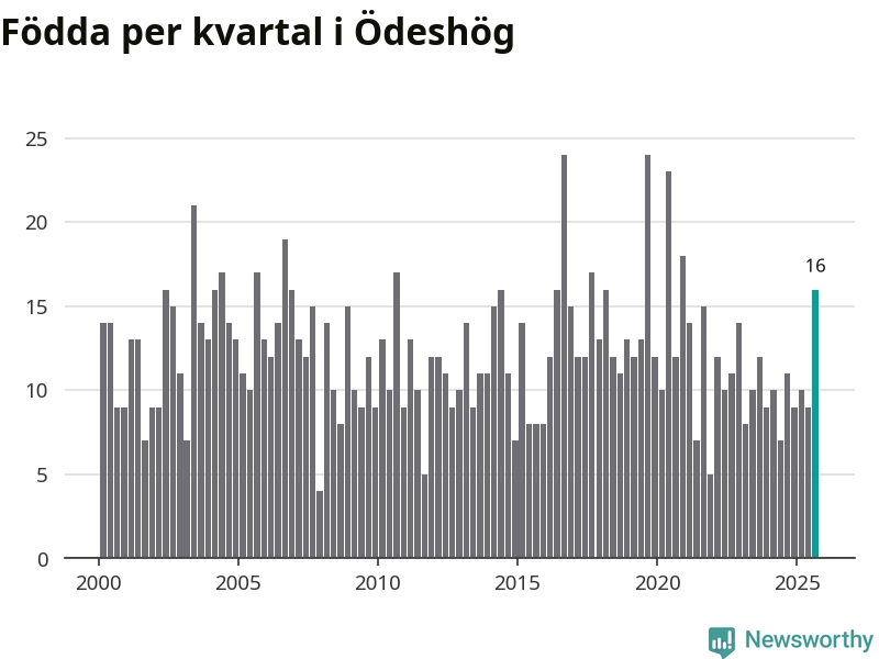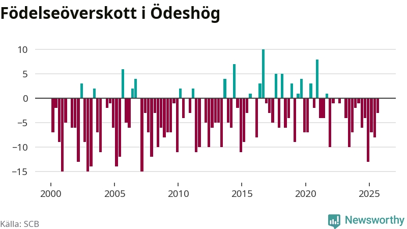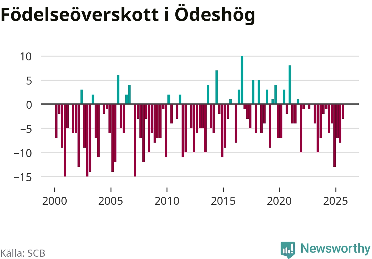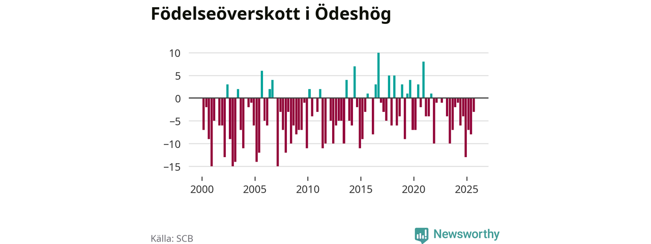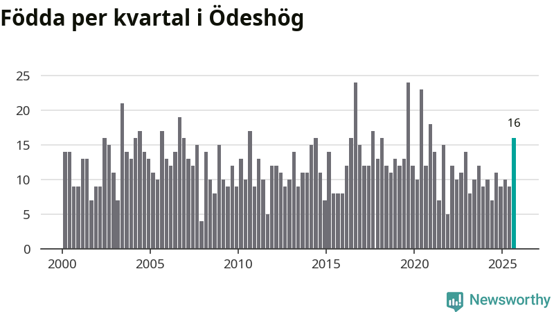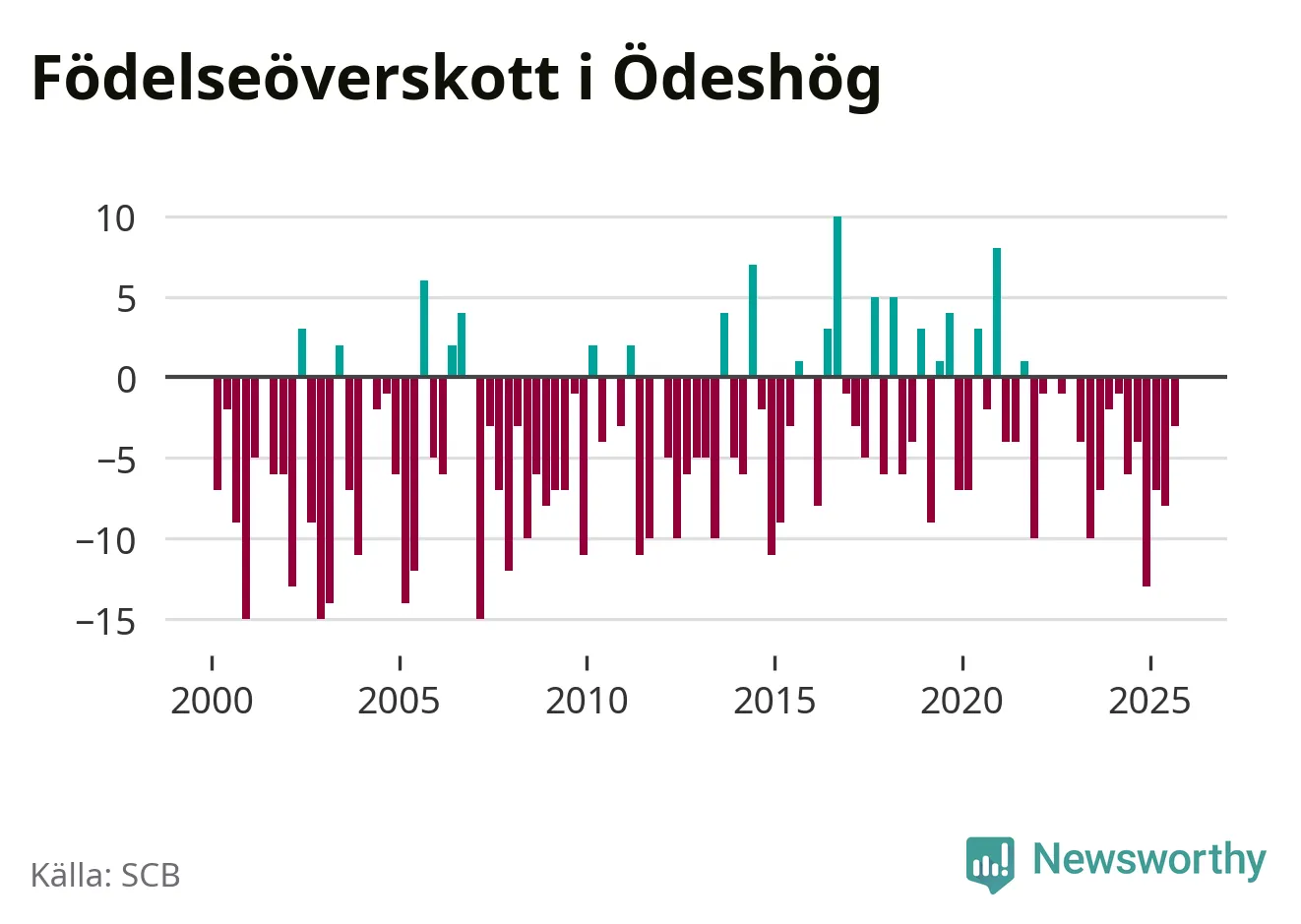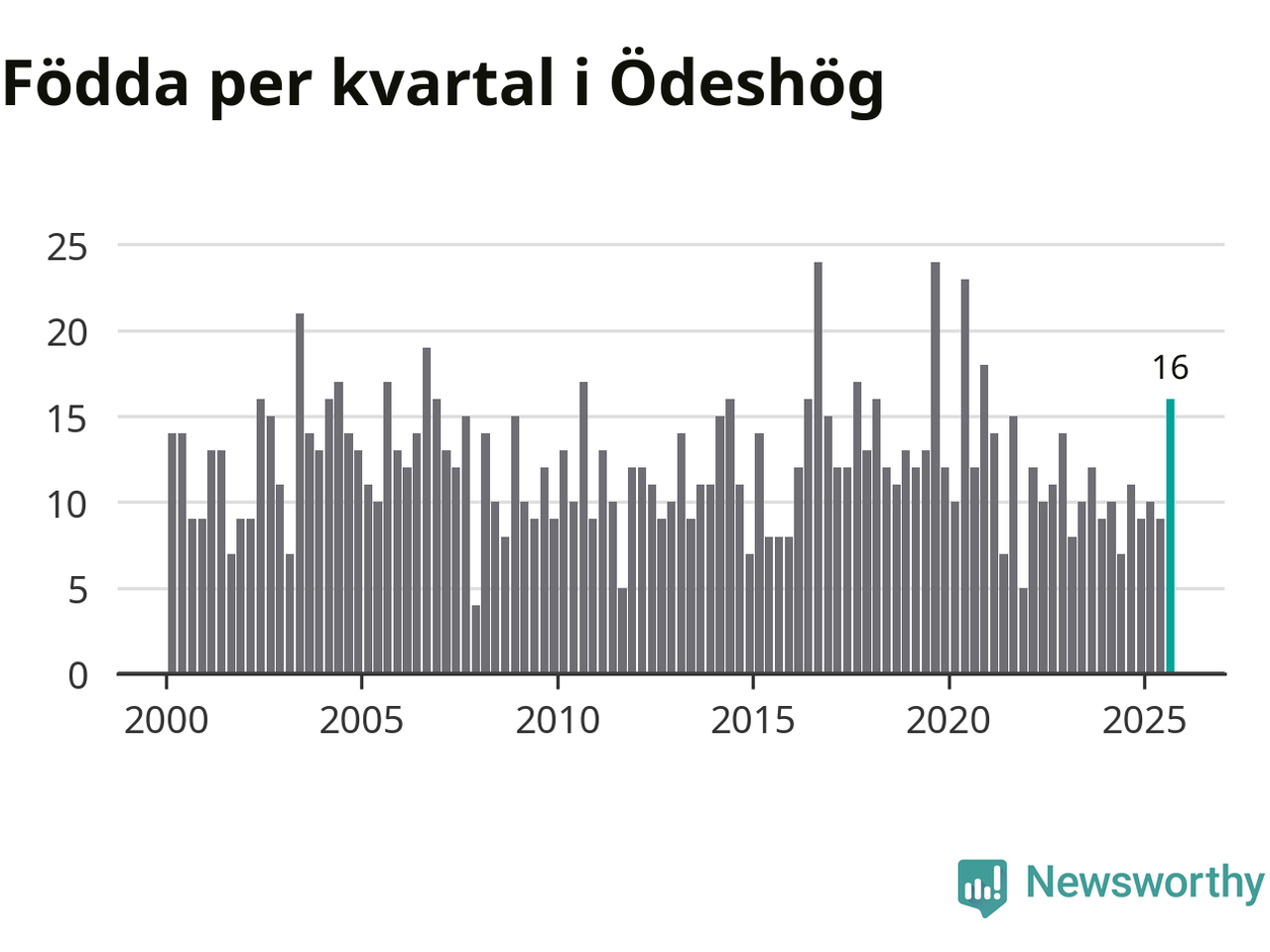 Enligt SCB:s siffror föddes 16 barn i Ödeshög under det senaste kvartalet, vilket är en relativt hög siffra historiskt sett. Samtidigt avled 19 personer. Skillnaden mellan antal födda och döda är så liten att det inte går att säga om det beror på något annat än SCB:s röjandeskydd. Kommunen har oftast haft negativt födelsenetto tidigare.