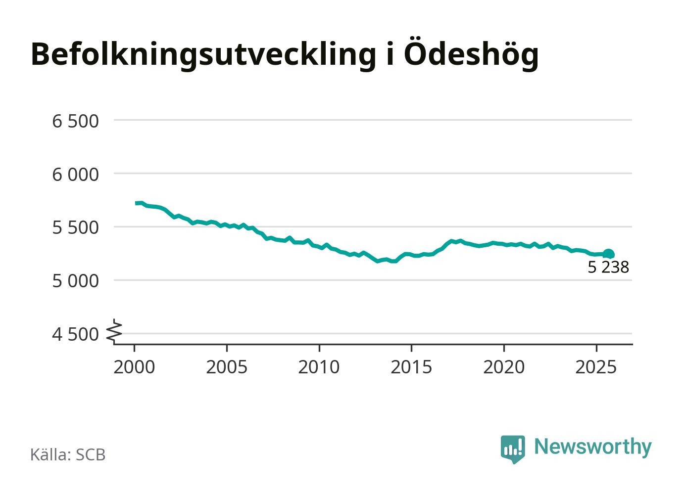 Jämfört med för ett år sedan har befolkningen i Ödeshög minskat med knappt 10 personer. Sedan millennieskiftet har folkmängden minskat med 480 personer, eller 8 procent.