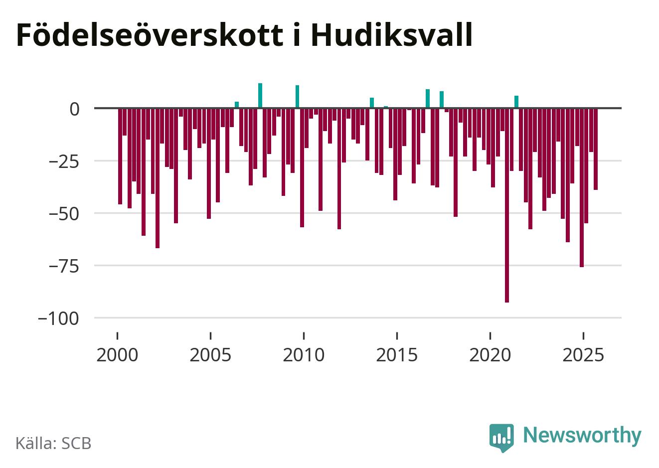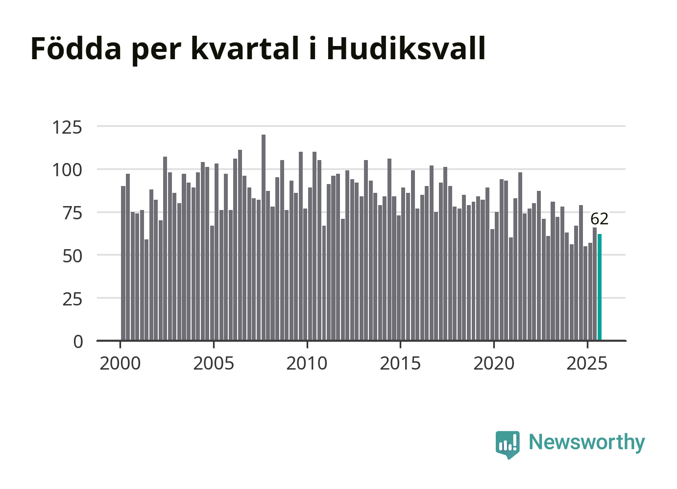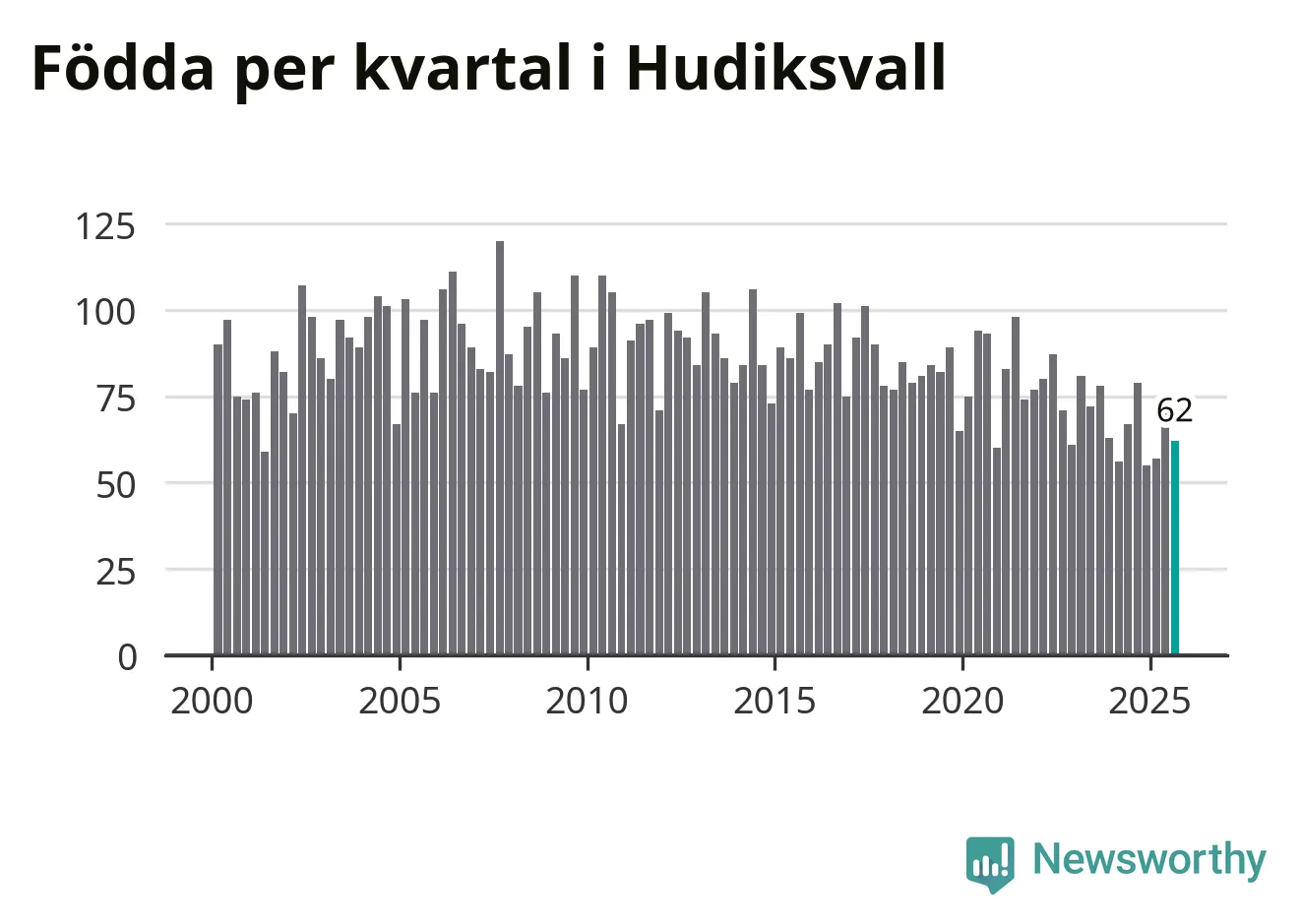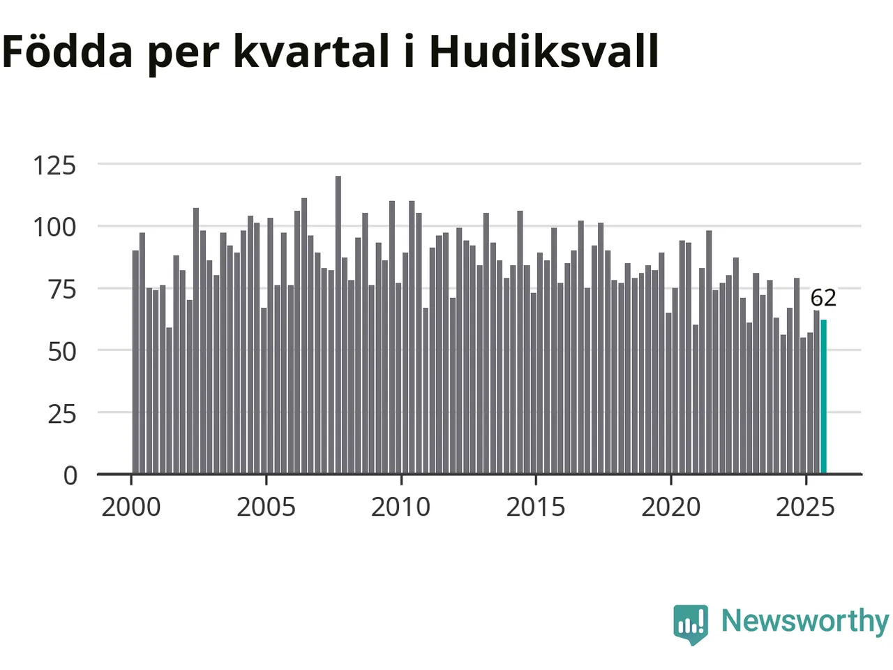 Enligt SCB:s siffror föddes 62 barn i Hudiksvall under det senaste kvartalet. Samtidigt avled 101 personer. Hudiksvall hade alltså ett negativt födelsenetto, vilket kommunen historiskt sett nästan alltid har haft.