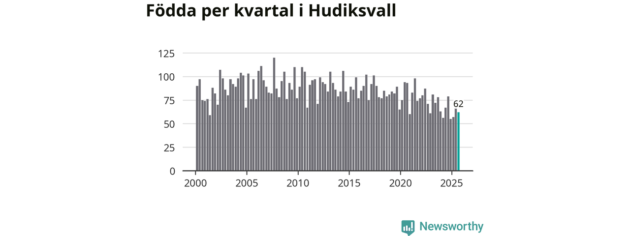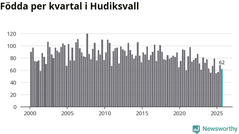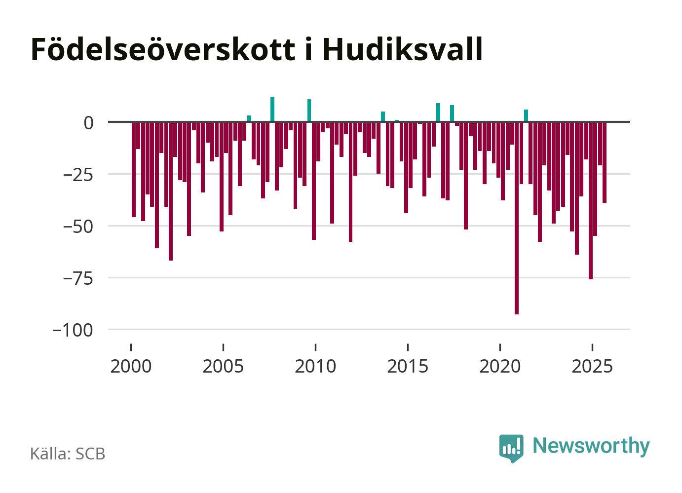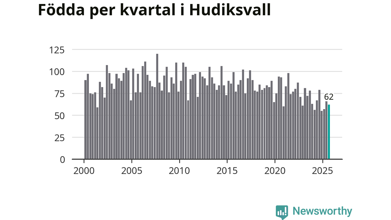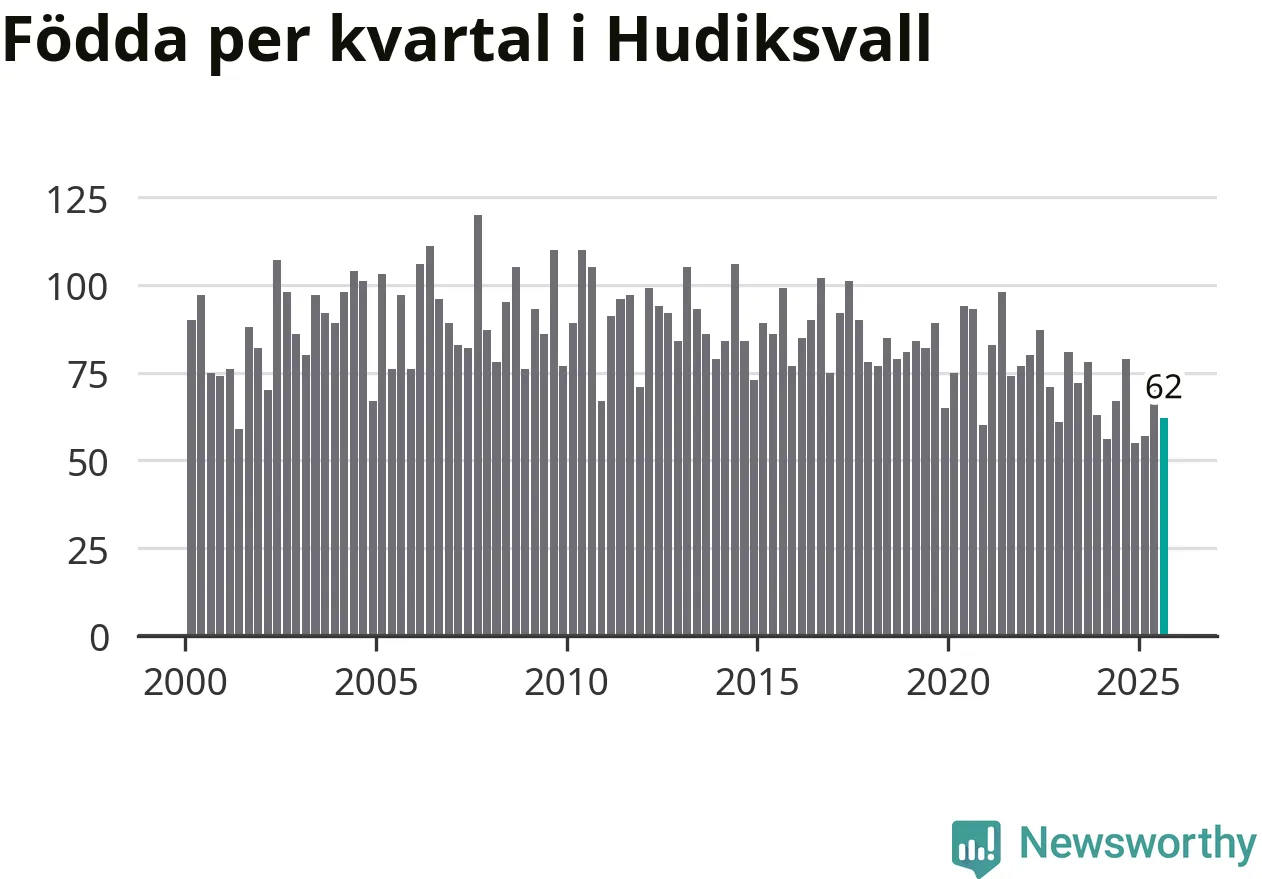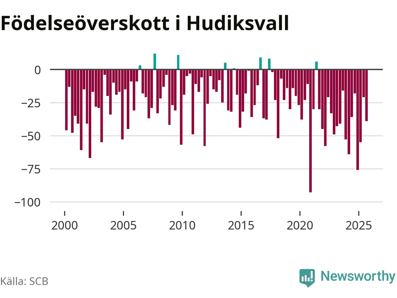 Enligt SCB:s siffror föddes 62 barn i Hudiksvall under det senaste kvartalet. Samtidigt avled 101 personer. Hudiksvall hade alltså ett negativt födelsenetto, vilket kommunen historiskt sett nästan alltid har haft.