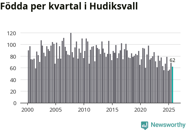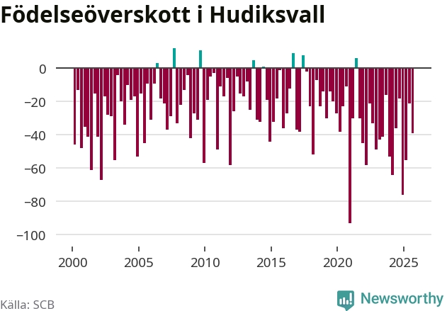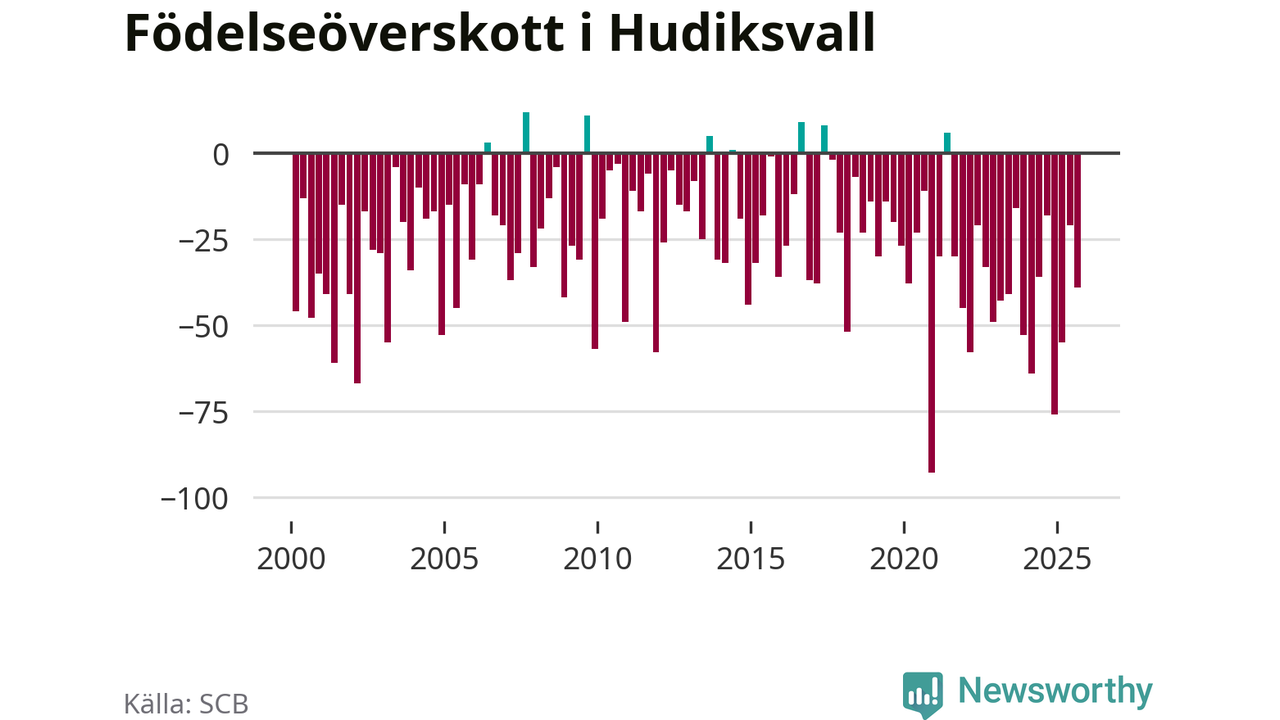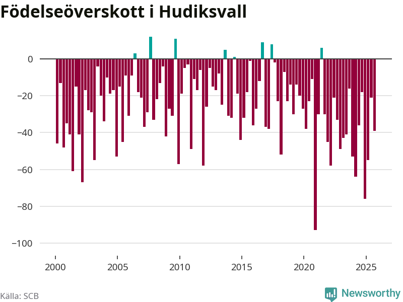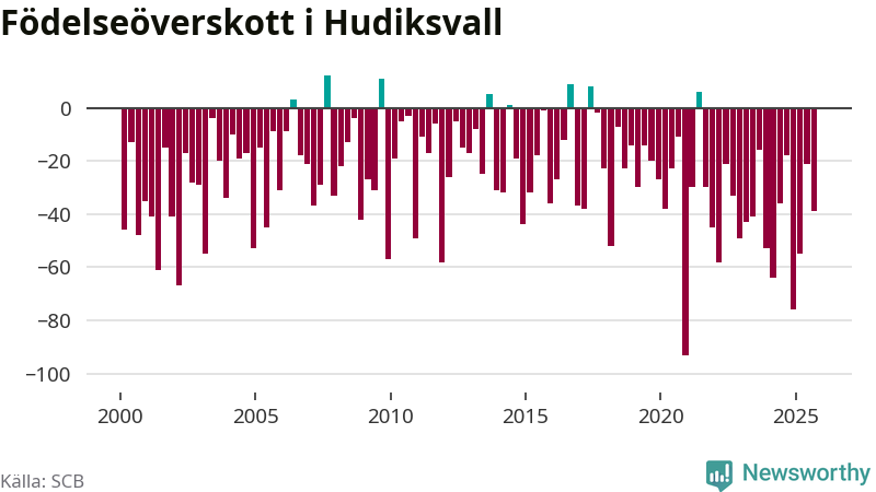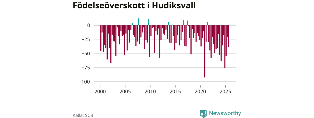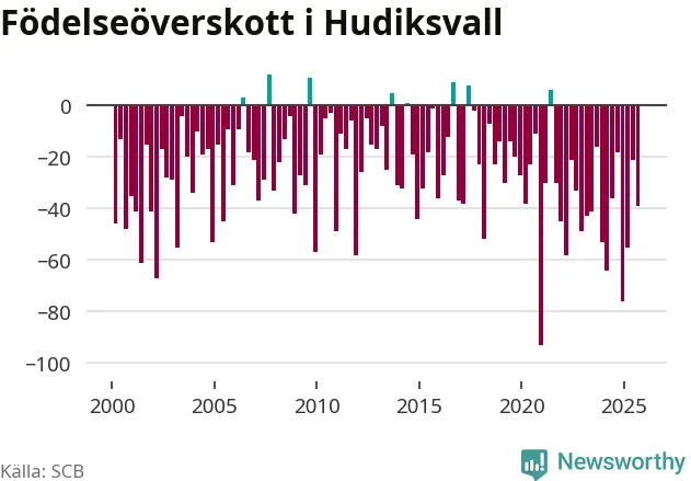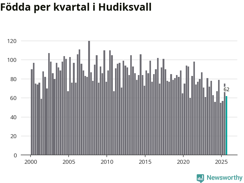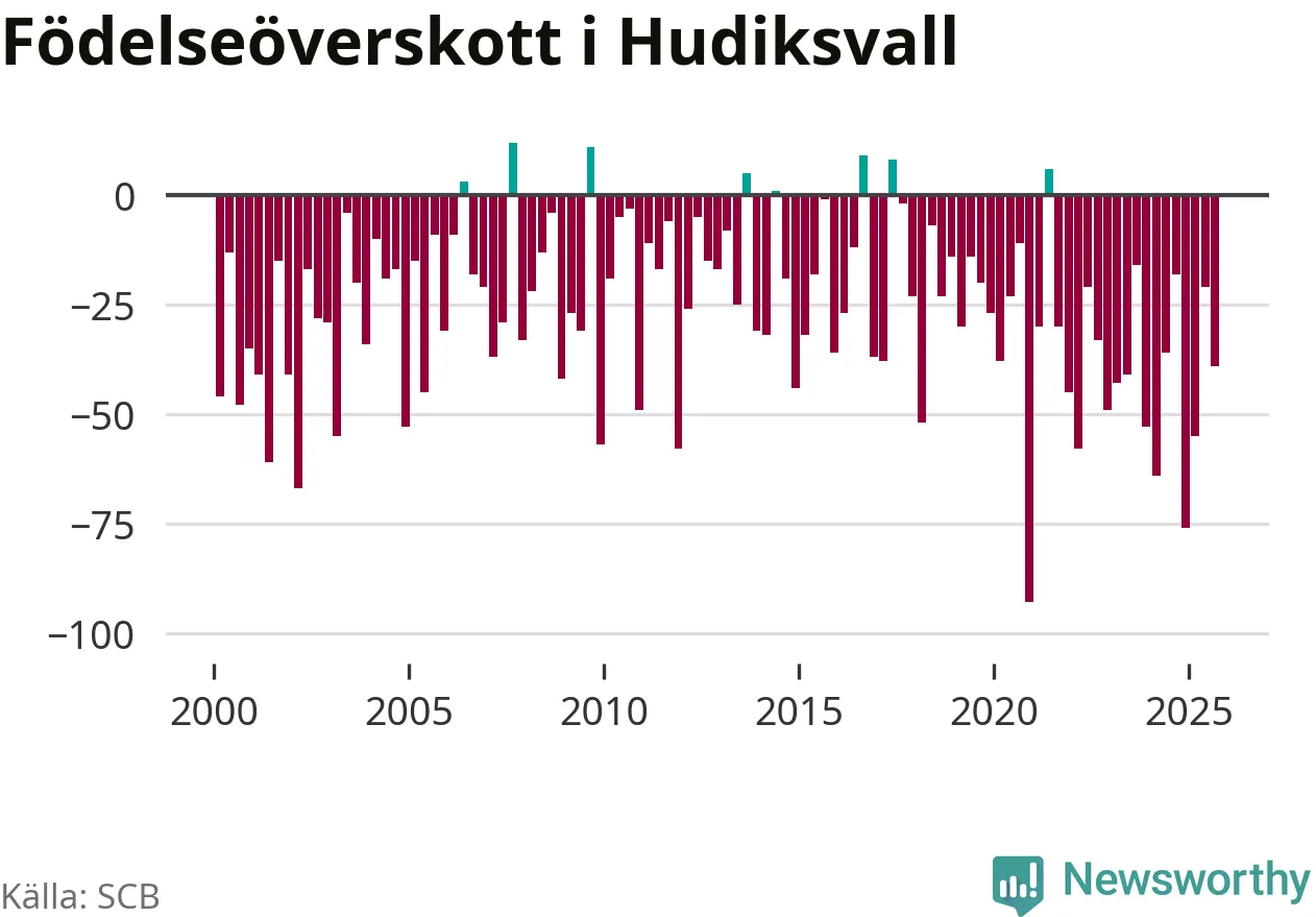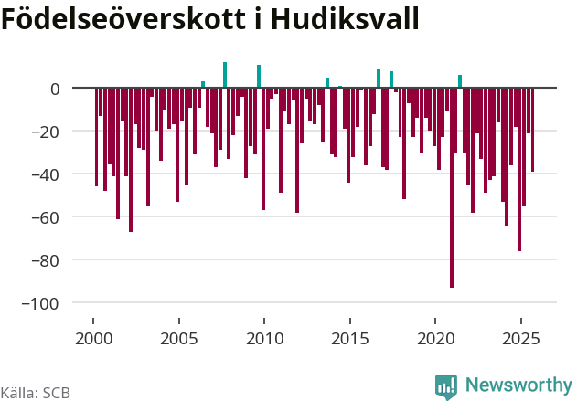 Enligt SCB:s siffror föddes 62 barn i Hudiksvall under det senaste kvartalet. Samtidigt avled 101 personer. Hudiksvall hade alltså ett negativt födelsenetto, vilket kommunen historiskt sett nästan alltid har haft.