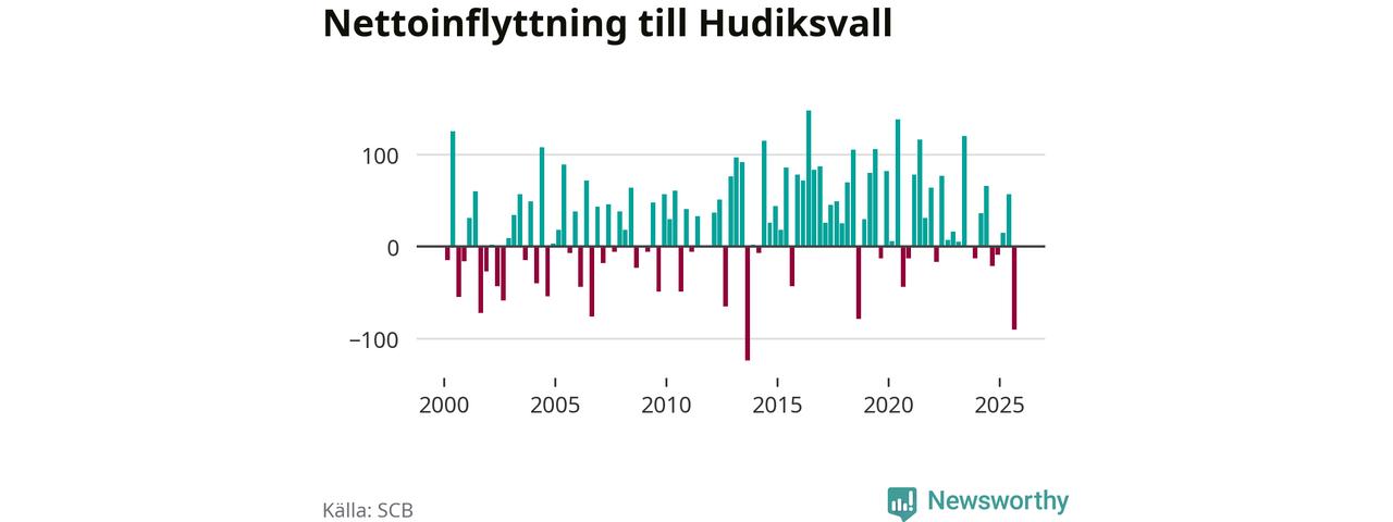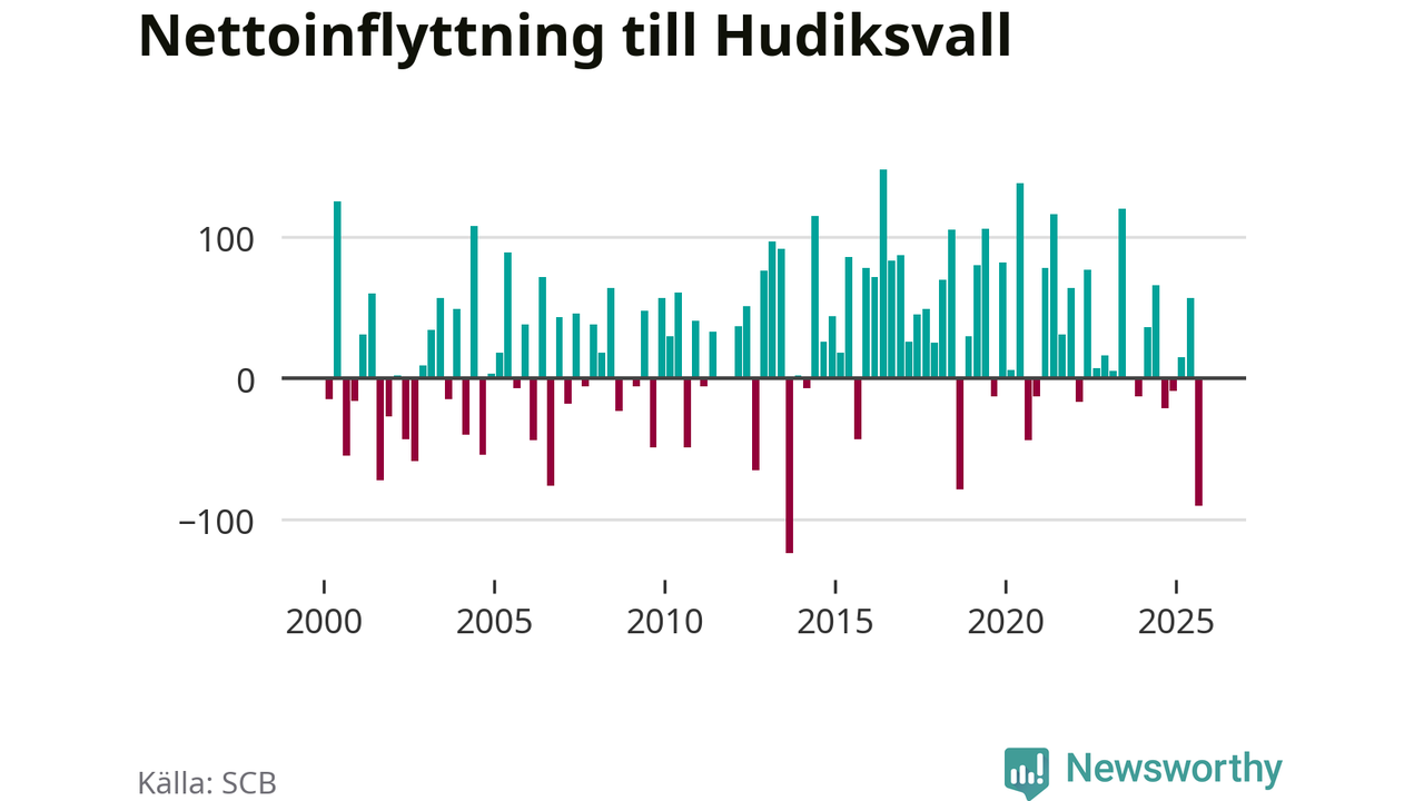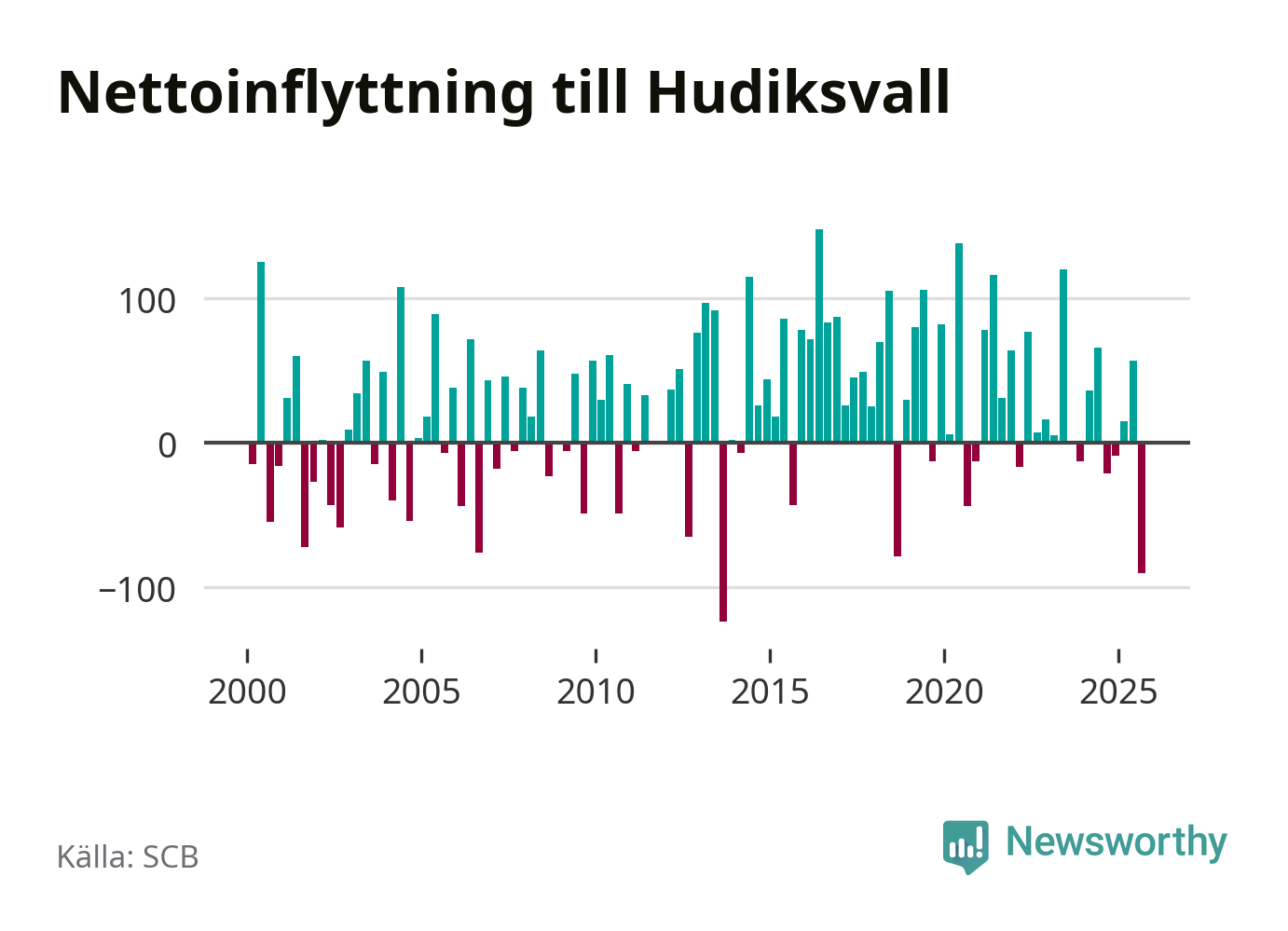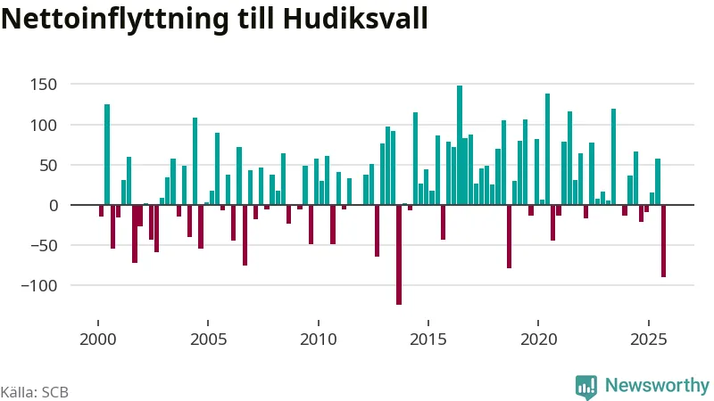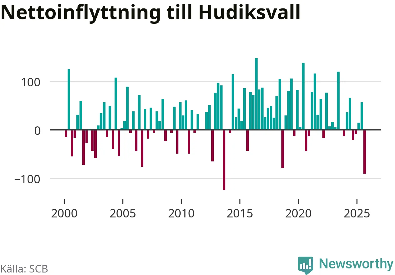 Under tredje kvartalet 2025 flyttade 372 personer till kommunen medan 462 personer flyttade därifrån. Det är historiskt sett en stor utflyttning under ett kvartal. Sedan seklets början har Hudiksvall oftast haft ett positivt flyttnetto.