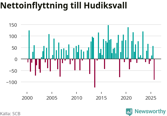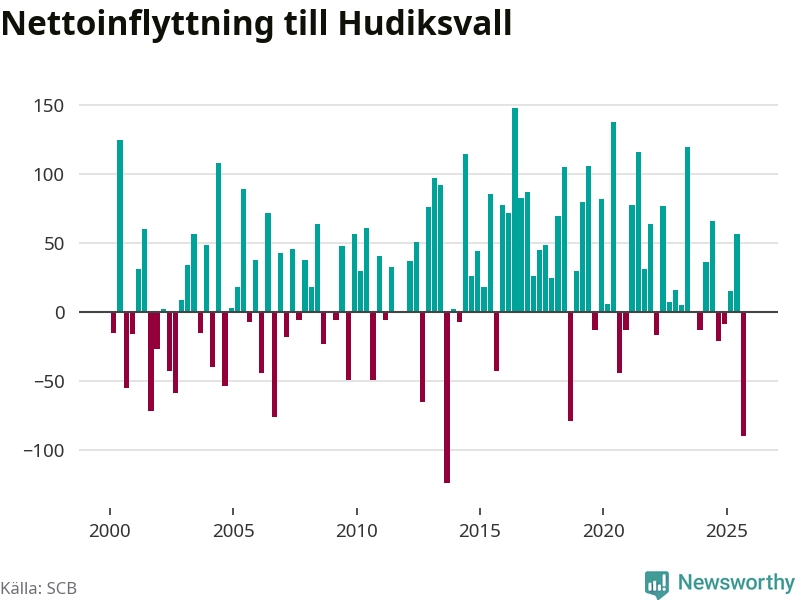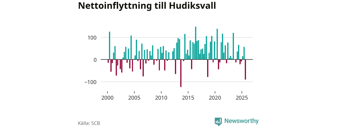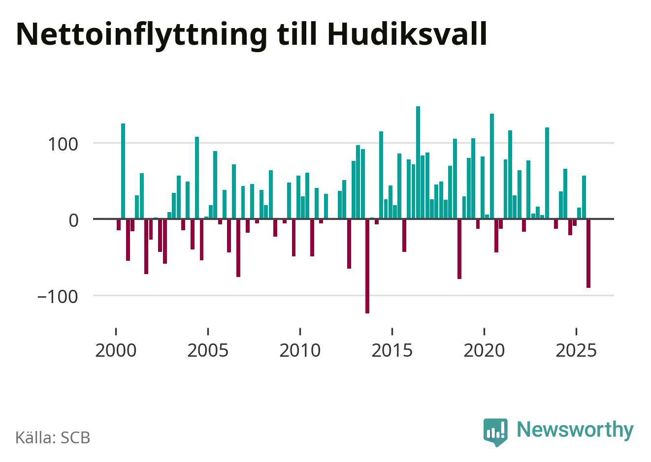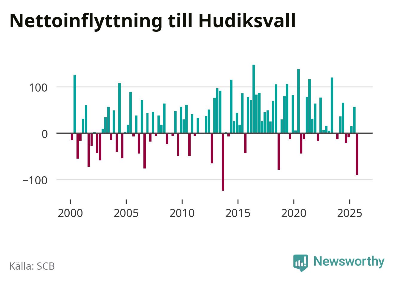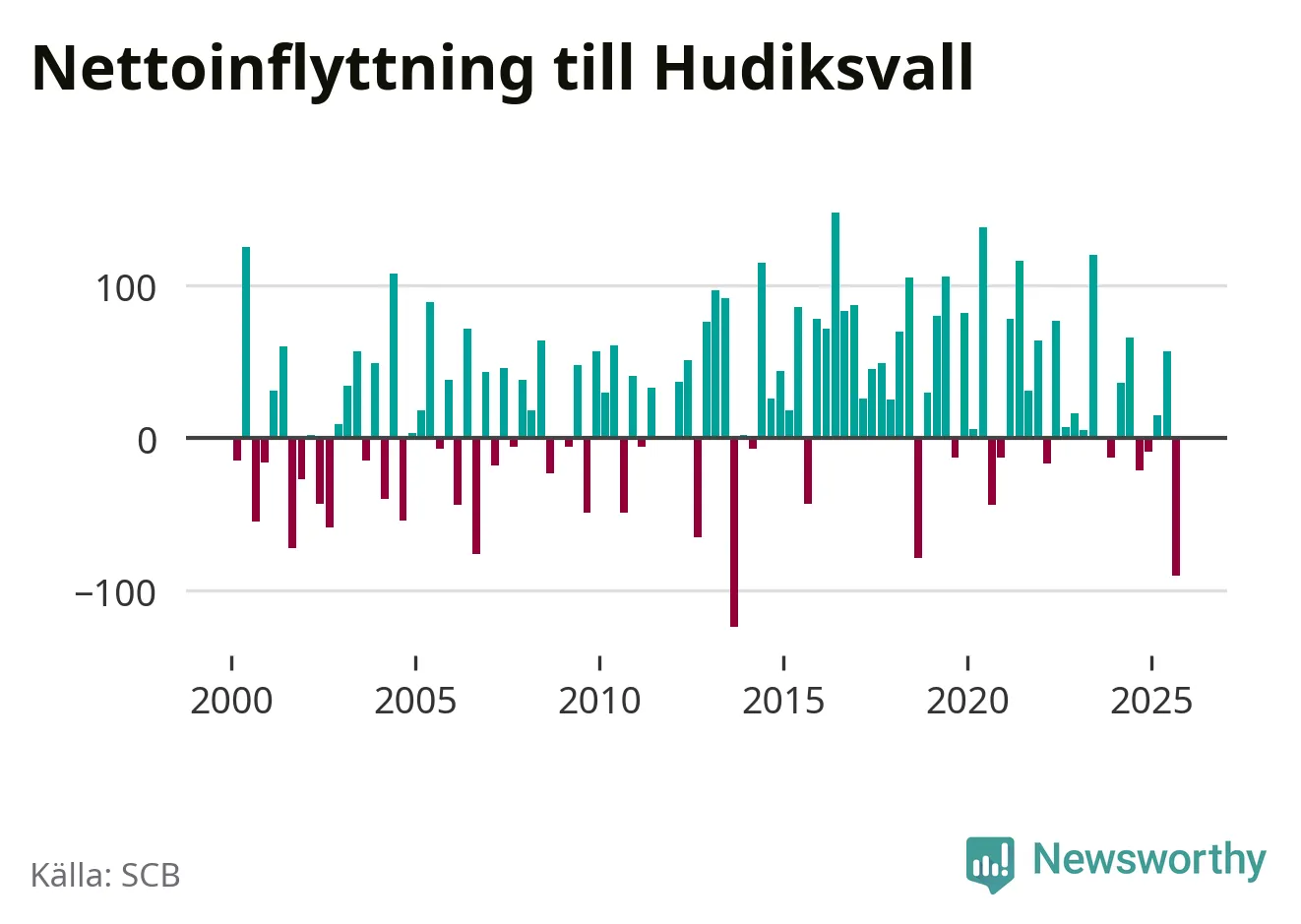 Under tredje kvartalet 2025 flyttade 372 personer till kommunen medan 462 personer flyttade därifrån. Det är historiskt sett en stor utflyttning under ett kvartal. Sedan seklets början har Hudiksvall oftast haft ett positivt flyttnetto.