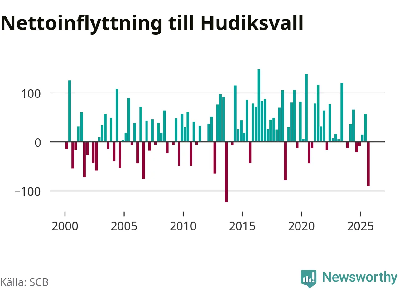Under det tredje kvartalet 2025 minskade befolkningen med i Hudiksvalls kommun 122 personer, visar nya siffror från SCB. Det är den största minskningen under ett enskilt kvartal sedan åtminstone sekelskiftet.