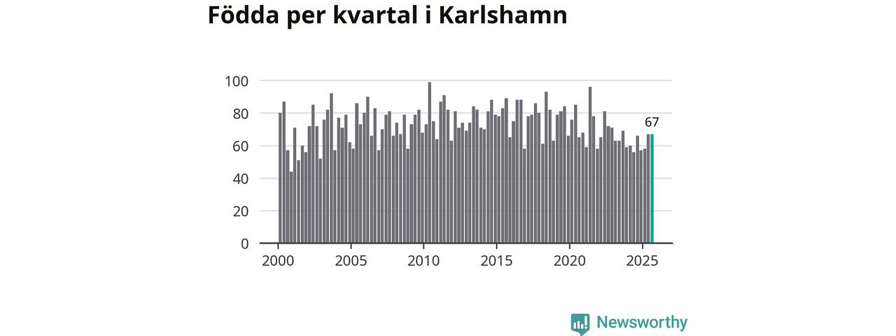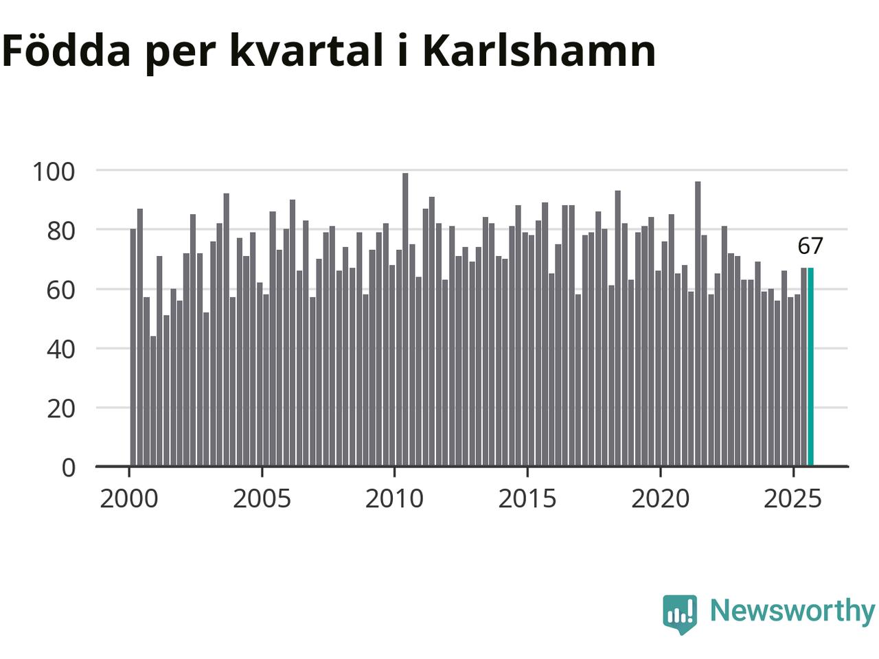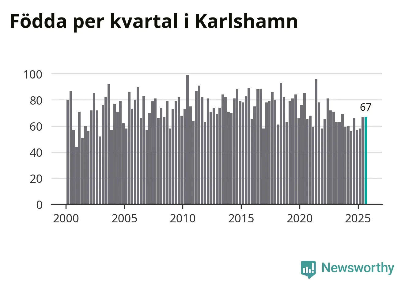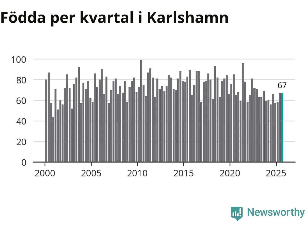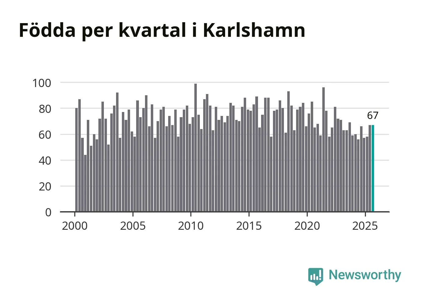 Enligt SCB:s siffror föddes 67 barn i Karlshamn under det senaste kvartalet. Samtidigt avled 86 personer. Karlshamn hade alltså ett negativt födelsenetto, vilket kommunen historiskt sett nästan alltid har haft.