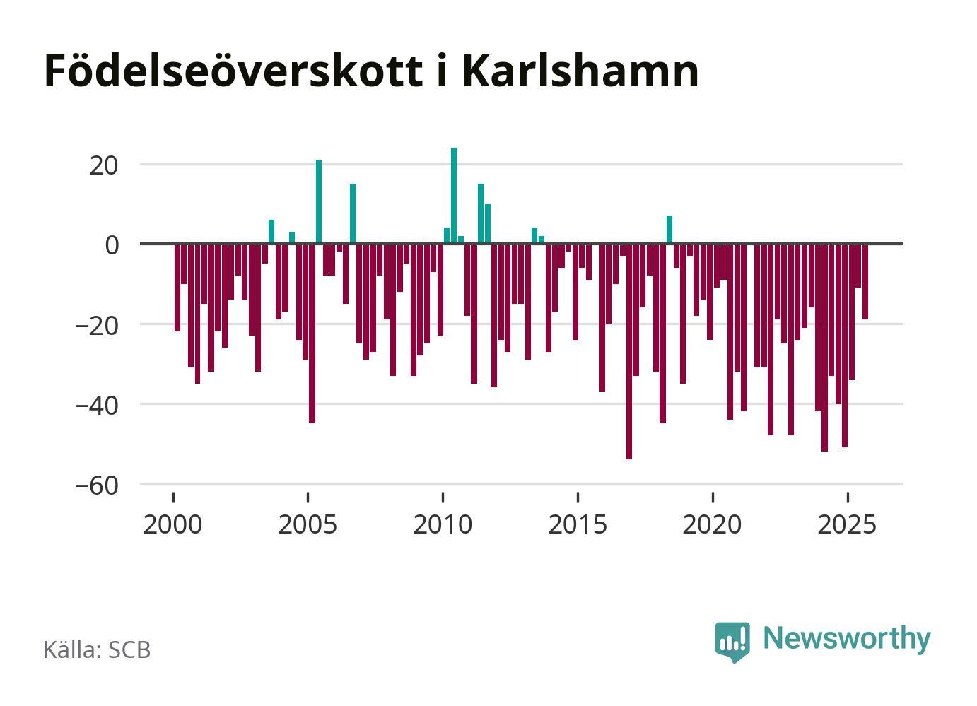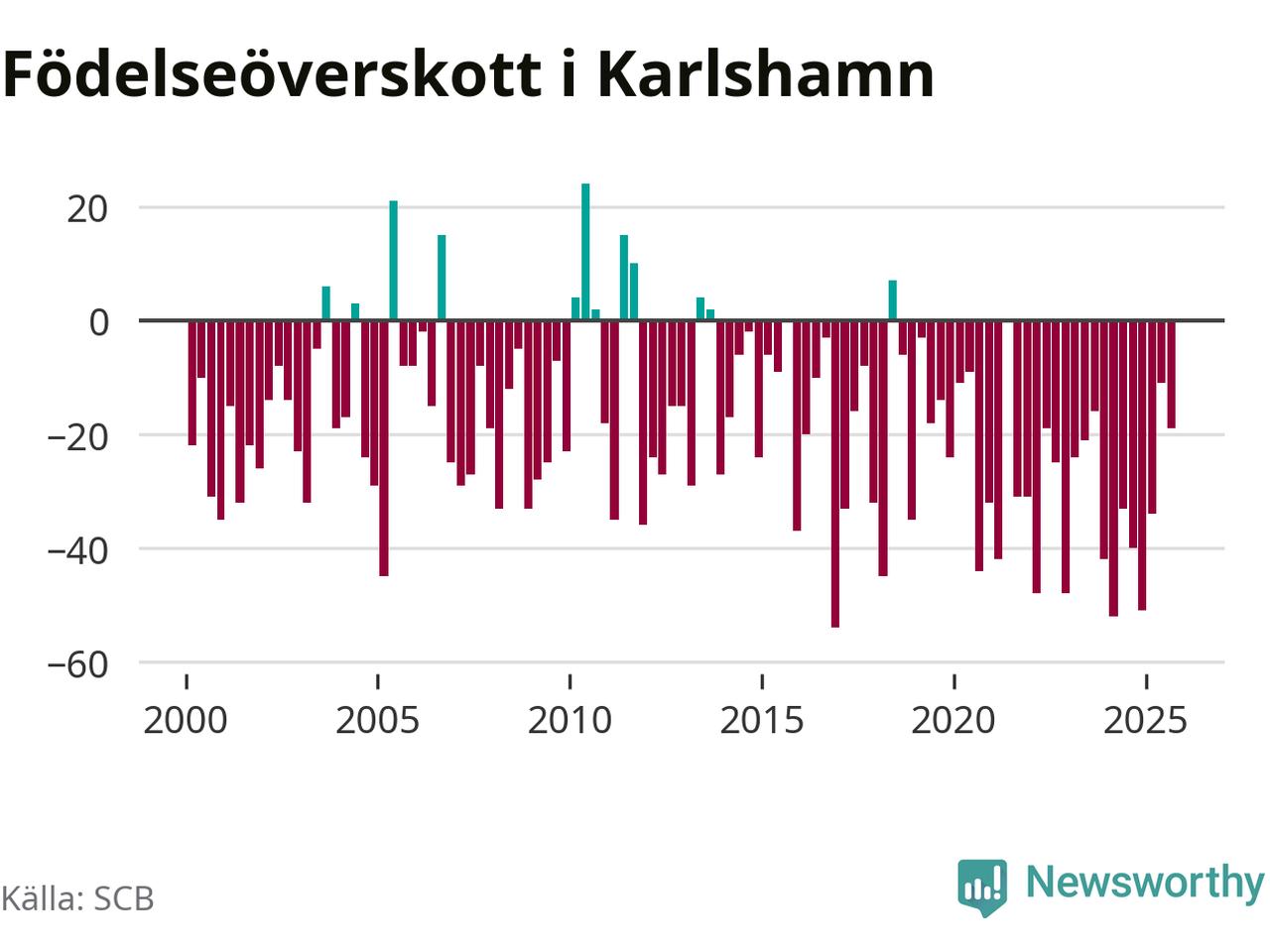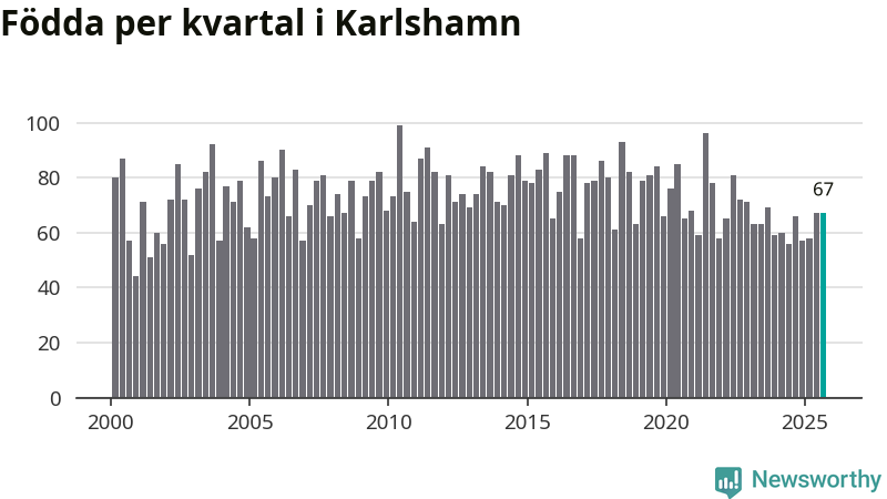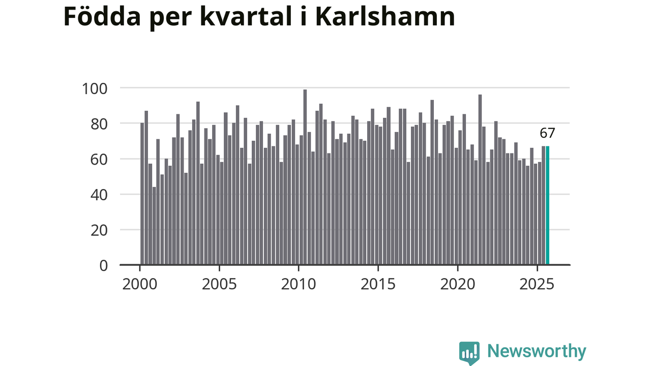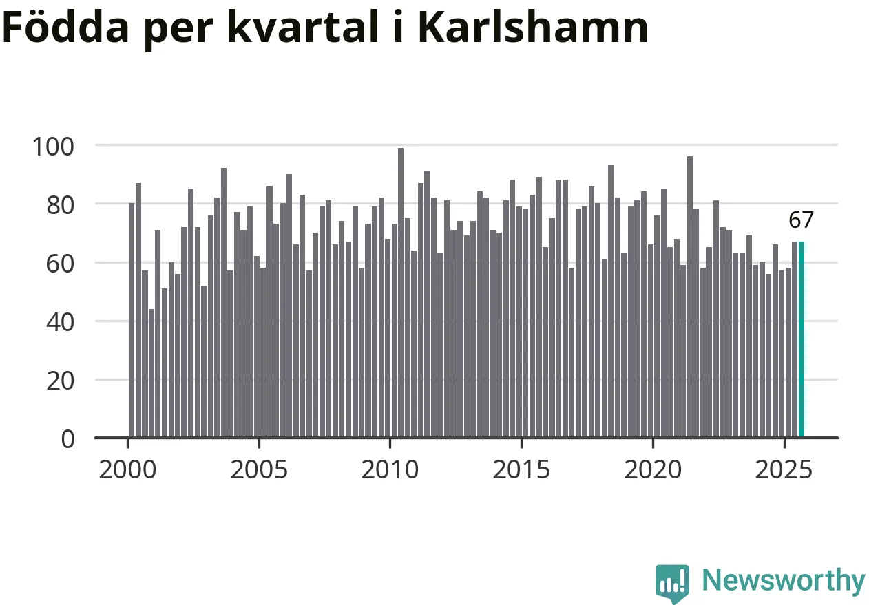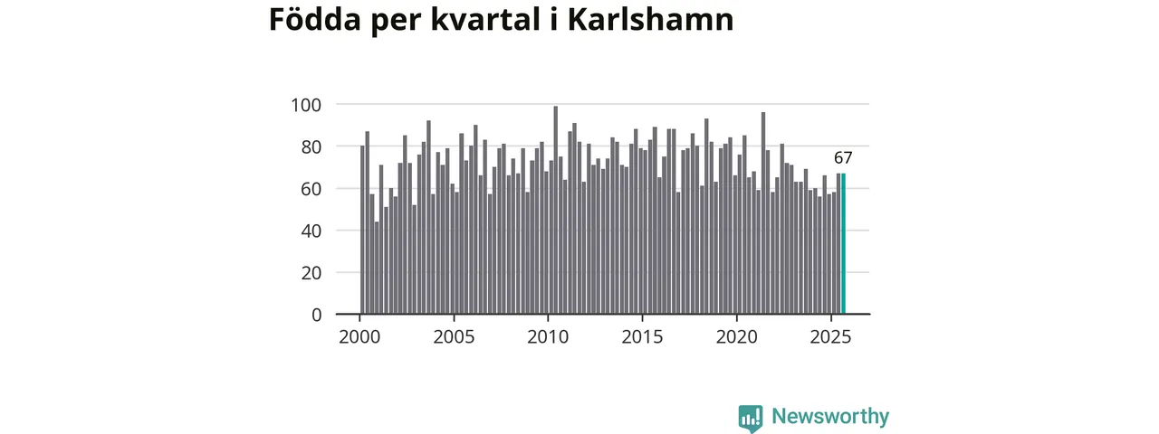 Enligt SCB:s siffror föddes 67 barn i Karlshamn under det senaste kvartalet. Samtidigt avled 86 personer. Karlshamn hade alltså ett negativt födelsenetto, vilket kommunen historiskt sett nästan alltid har haft.