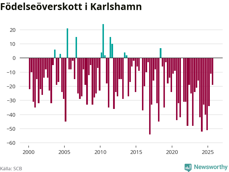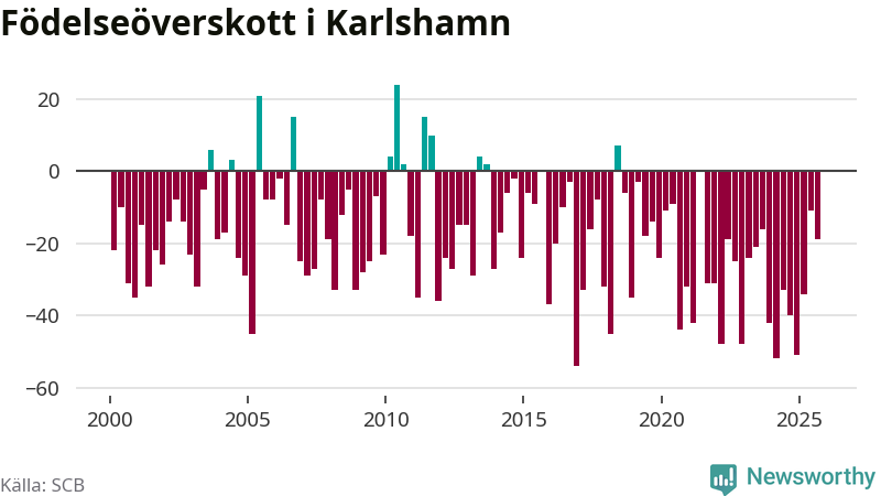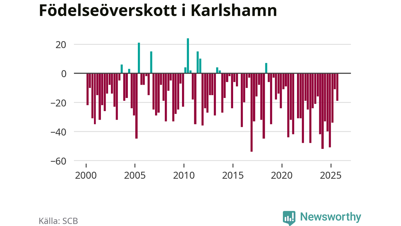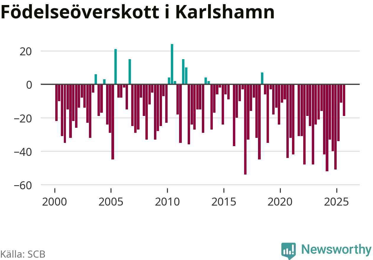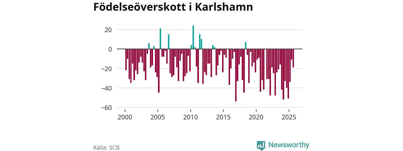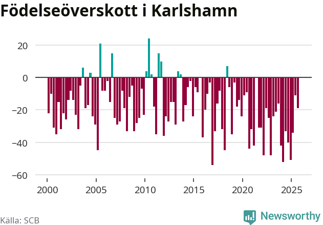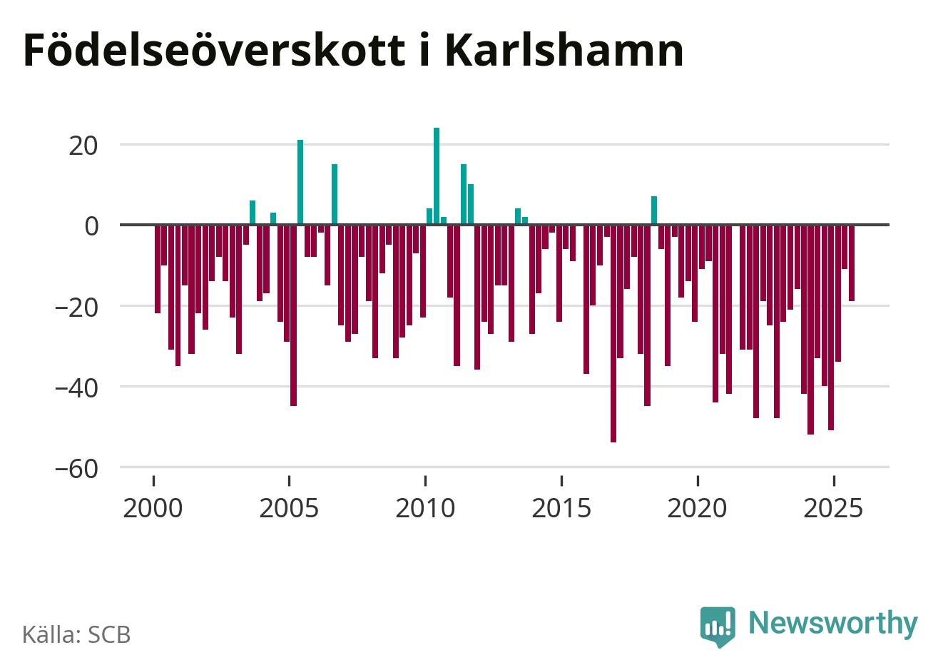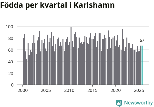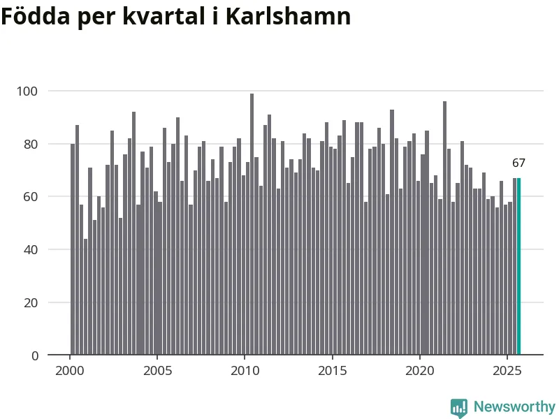 Enligt SCB:s siffror föddes 67 barn i Karlshamn under det senaste kvartalet. Samtidigt avled 86 personer. Karlshamn hade alltså ett negativt födelsenetto, vilket kommunen historiskt sett nästan alltid har haft.
