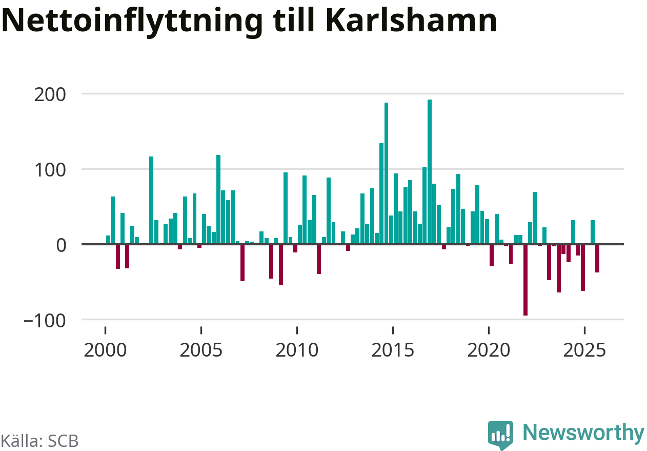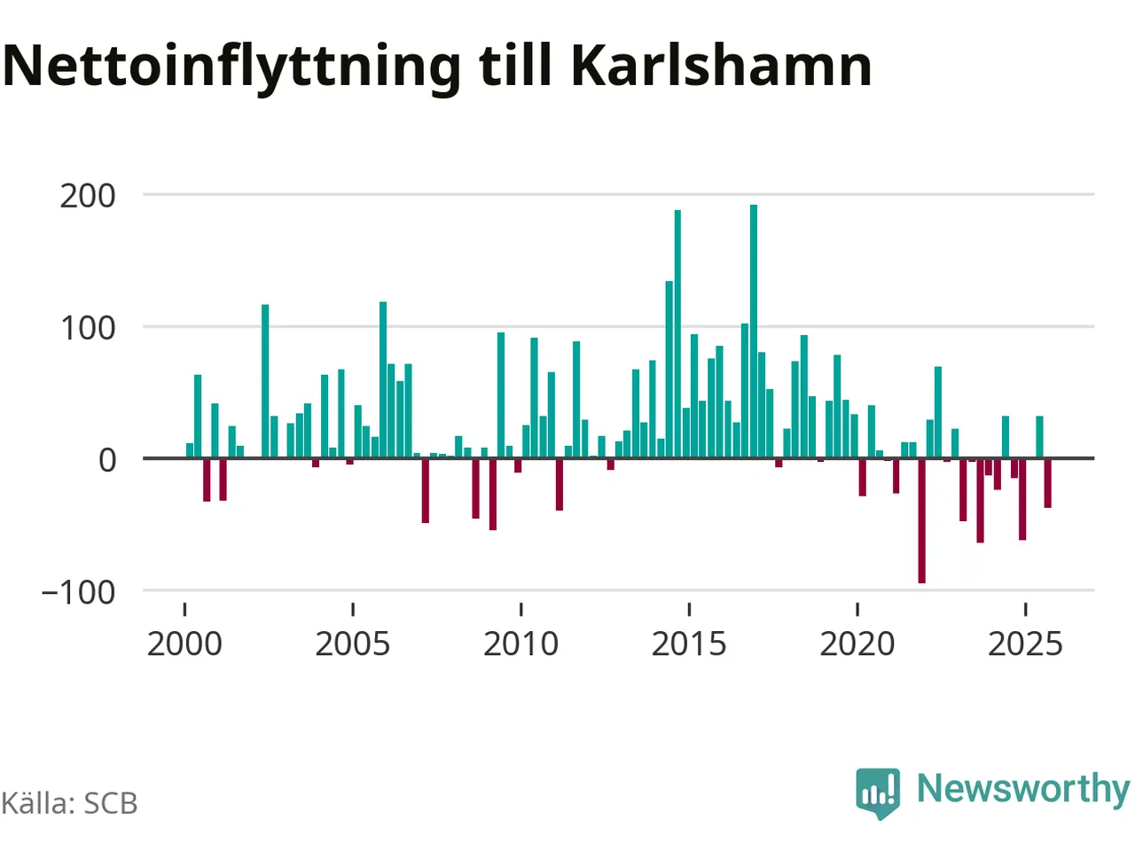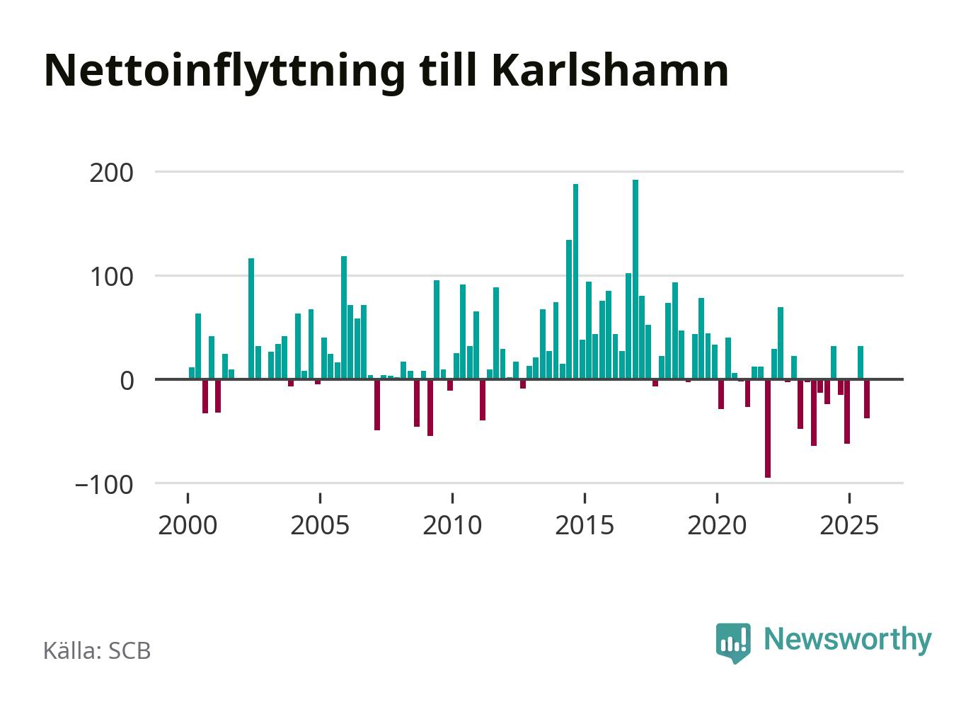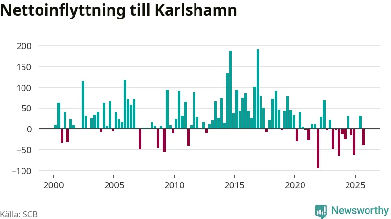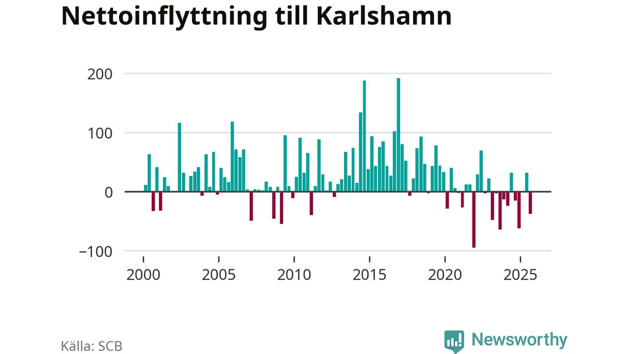 Under tredje kvartalet 2025 flyttade 392 personer till kommunen medan 430 personer flyttade därifrån. Det är historiskt sett en stor utflyttning under ett kvartal. Sedan seklets början har Karlshamn oftast haft ett positivt flyttnetto.