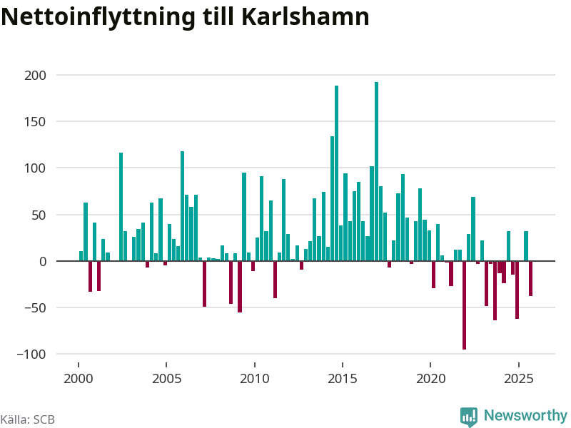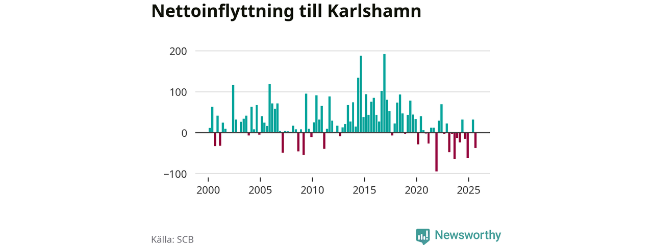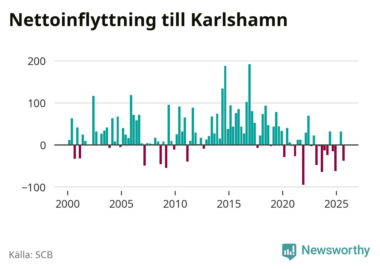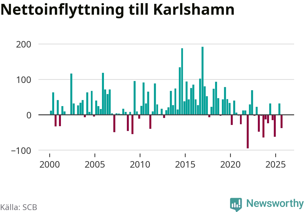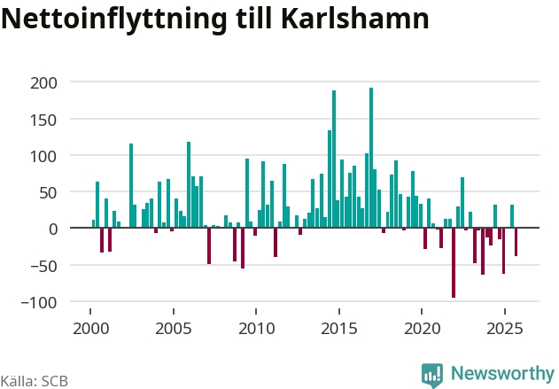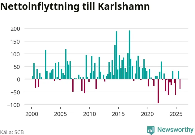 Under tredje kvartalet 2025 flyttade 392 personer till kommunen medan 430 personer flyttade därifrån. Det är historiskt sett en stor utflyttning under ett kvartal. Sedan seklets början har Karlshamn oftast haft ett positivt flyttnetto.
