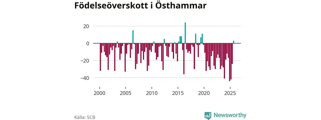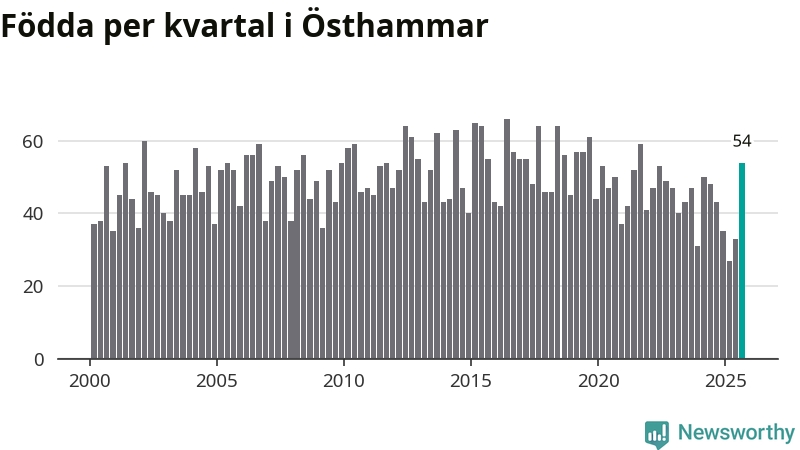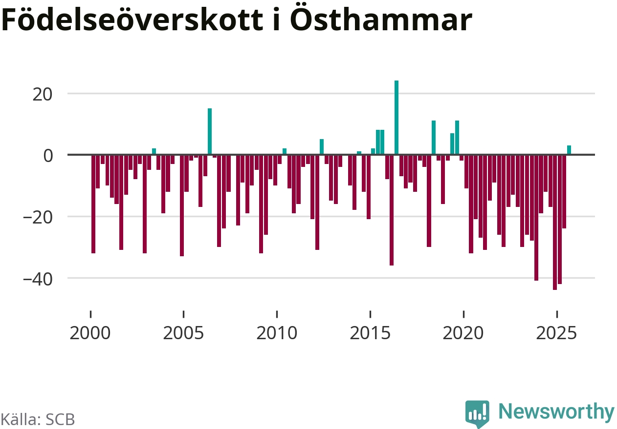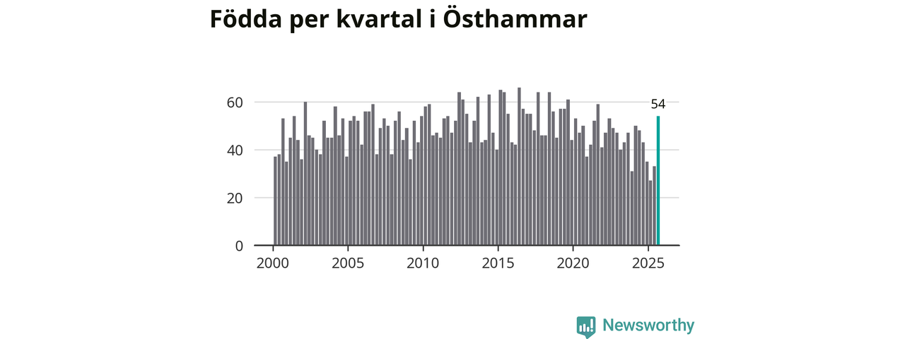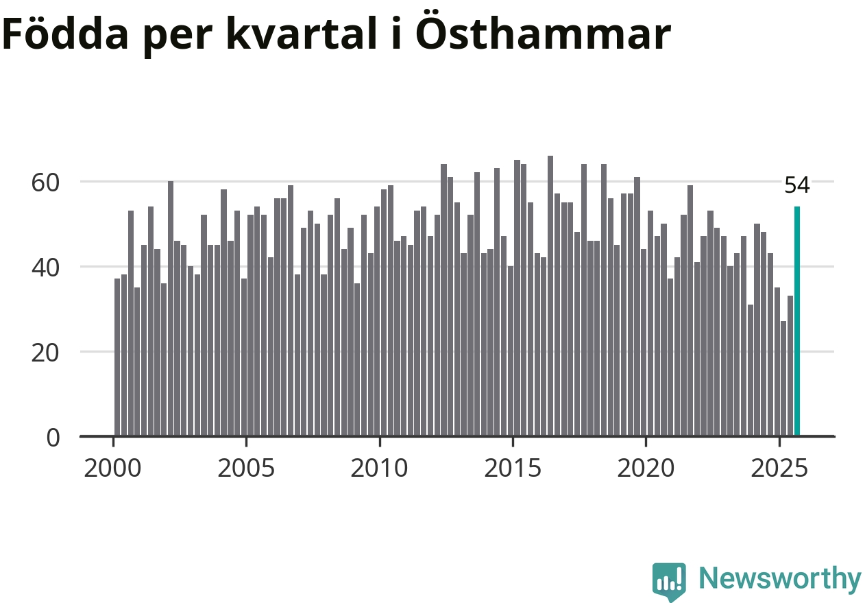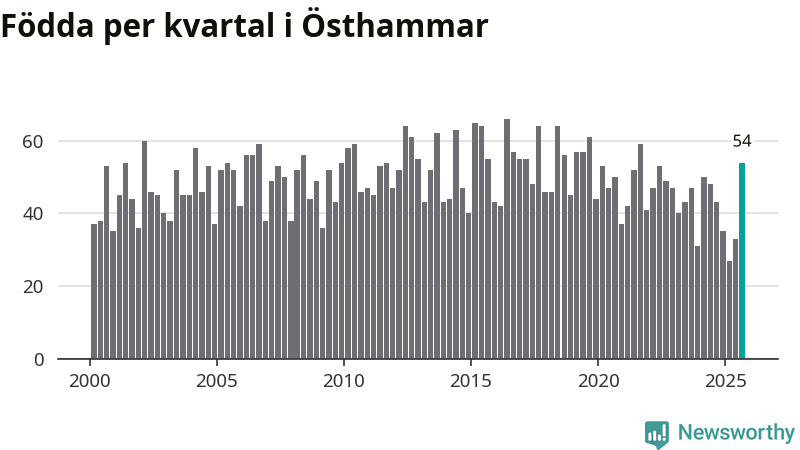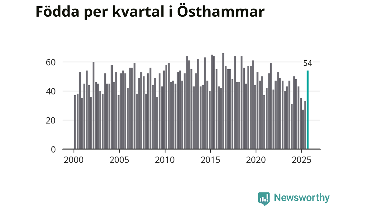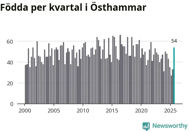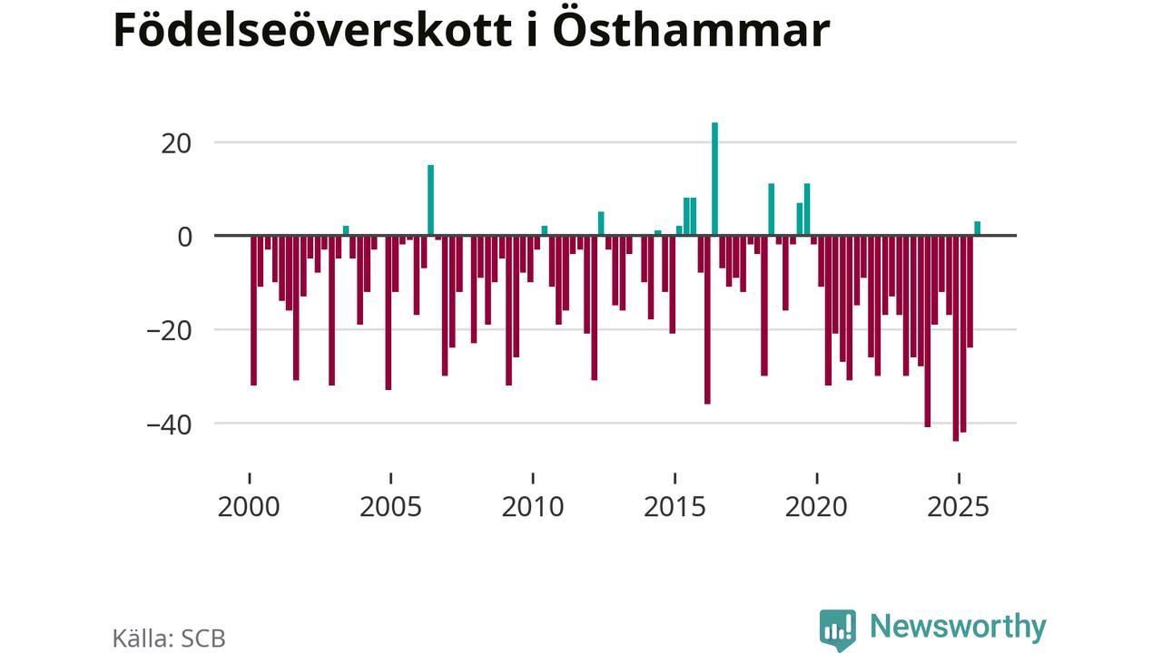 Enligt SCB:s siffror föddes 54 barn i Östhammar under det senaste kvartalet. Samtidigt avled 51 personer. Skillnaden mellan antal födda och döda är så liten att det inte går att säga om det beror på något annat än SCB:s röjandeskydd. Kommunen har nästan alltid haft negativt födelsenetto tidigare.