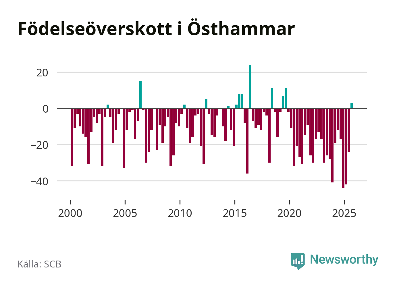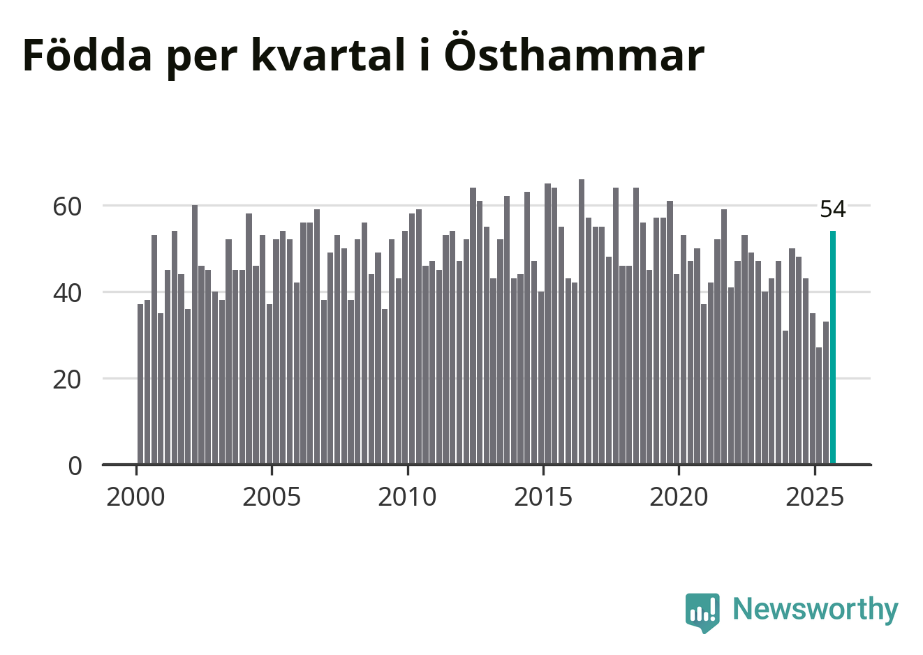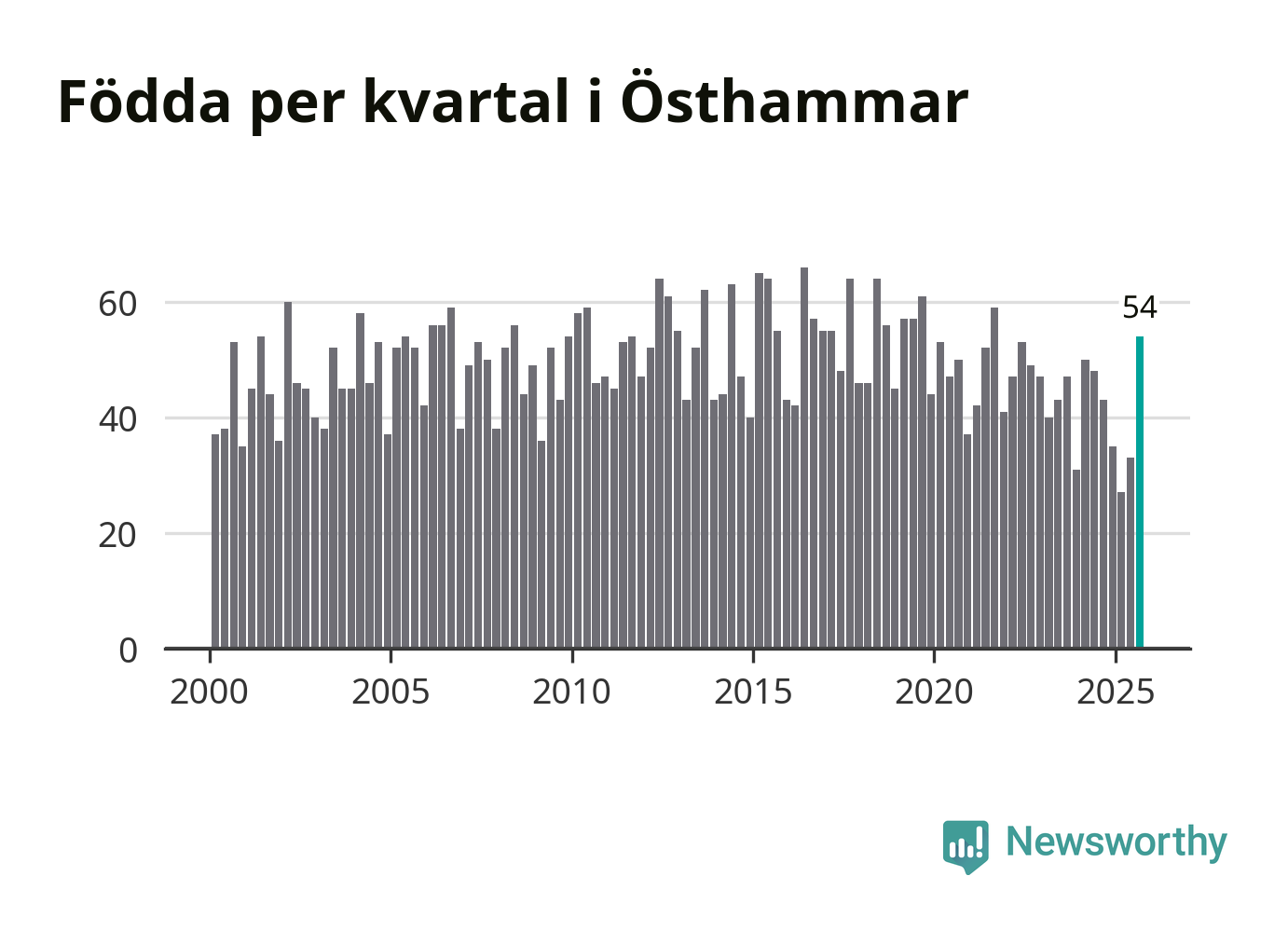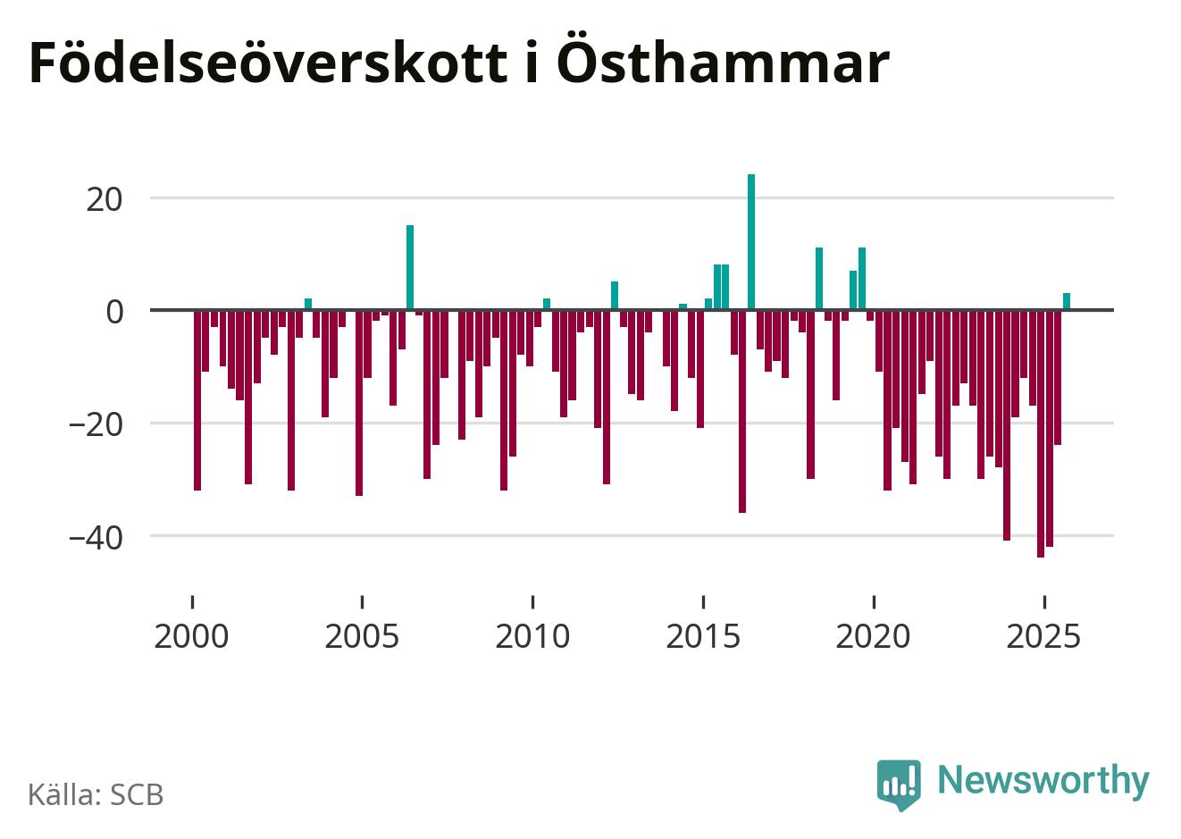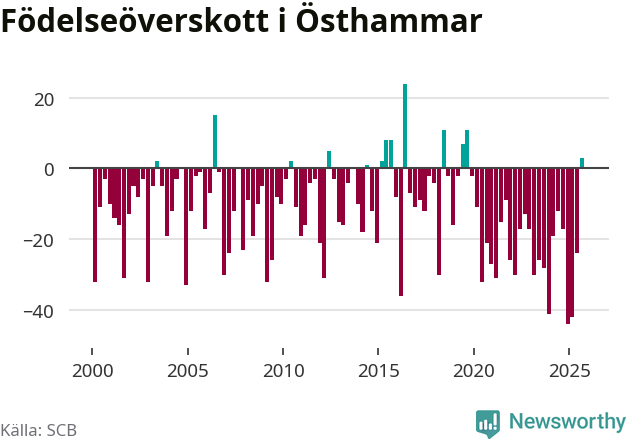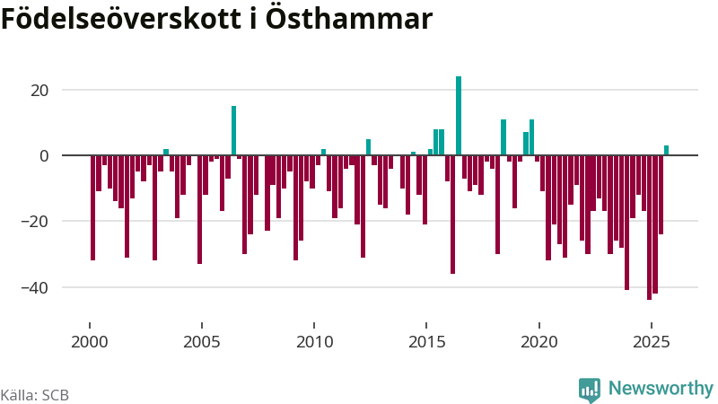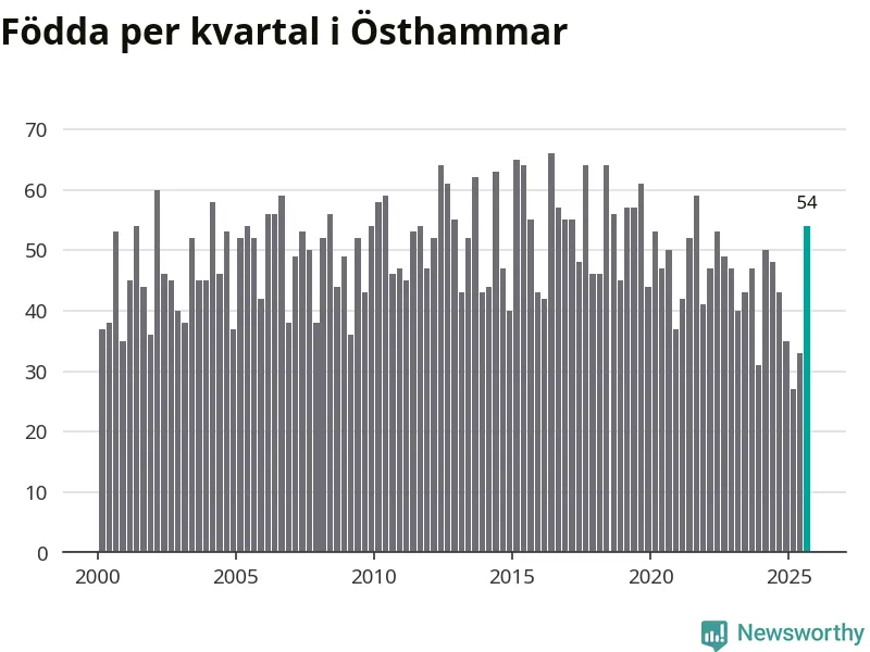 Enligt SCB:s siffror föddes 54 barn i Östhammar under det senaste kvartalet. Samtidigt avled 51 personer. Skillnaden mellan antal födda och döda är så liten att det inte går att säga om det beror på något annat än SCB:s röjandeskydd. Kommunen har nästan alltid haft negativt födelsenetto tidigare.