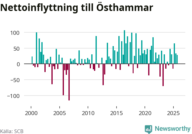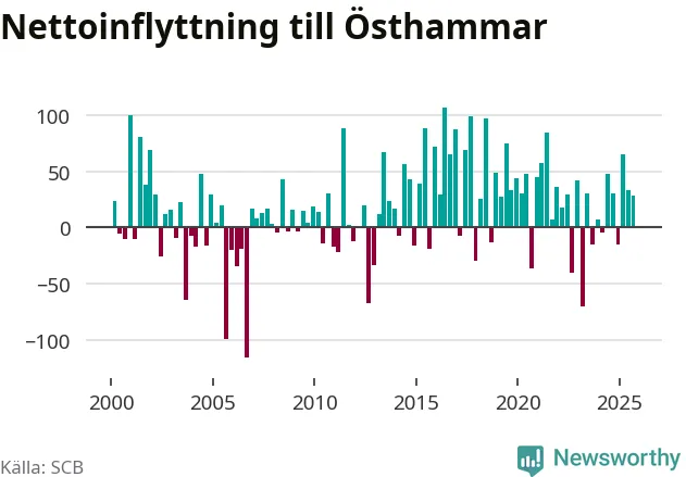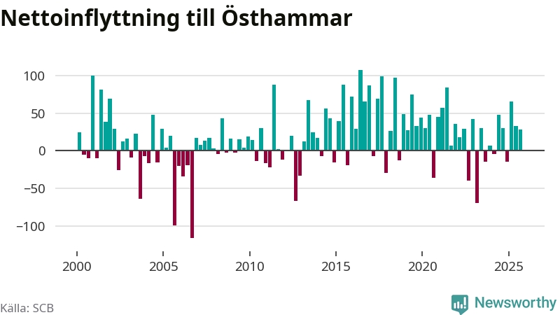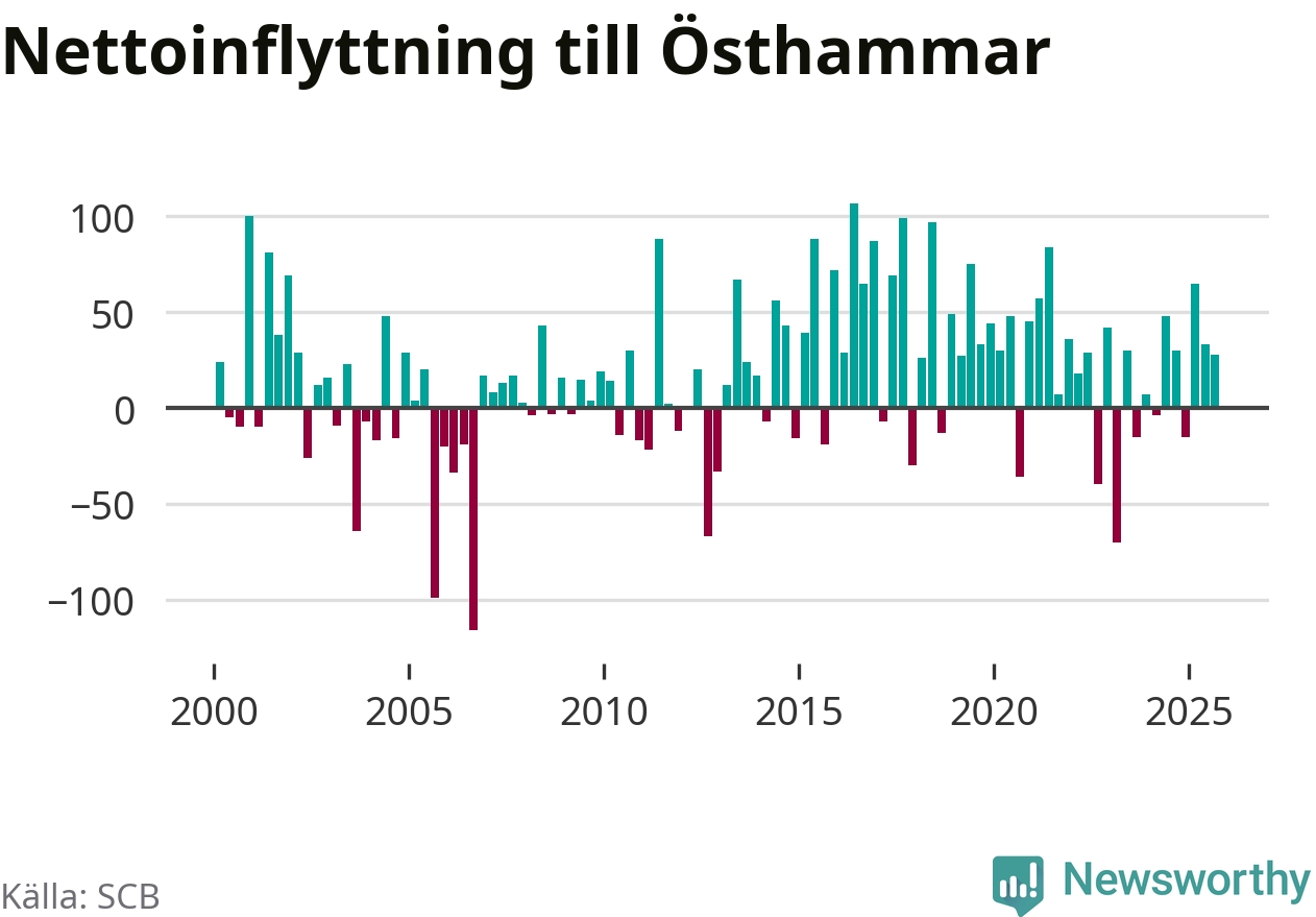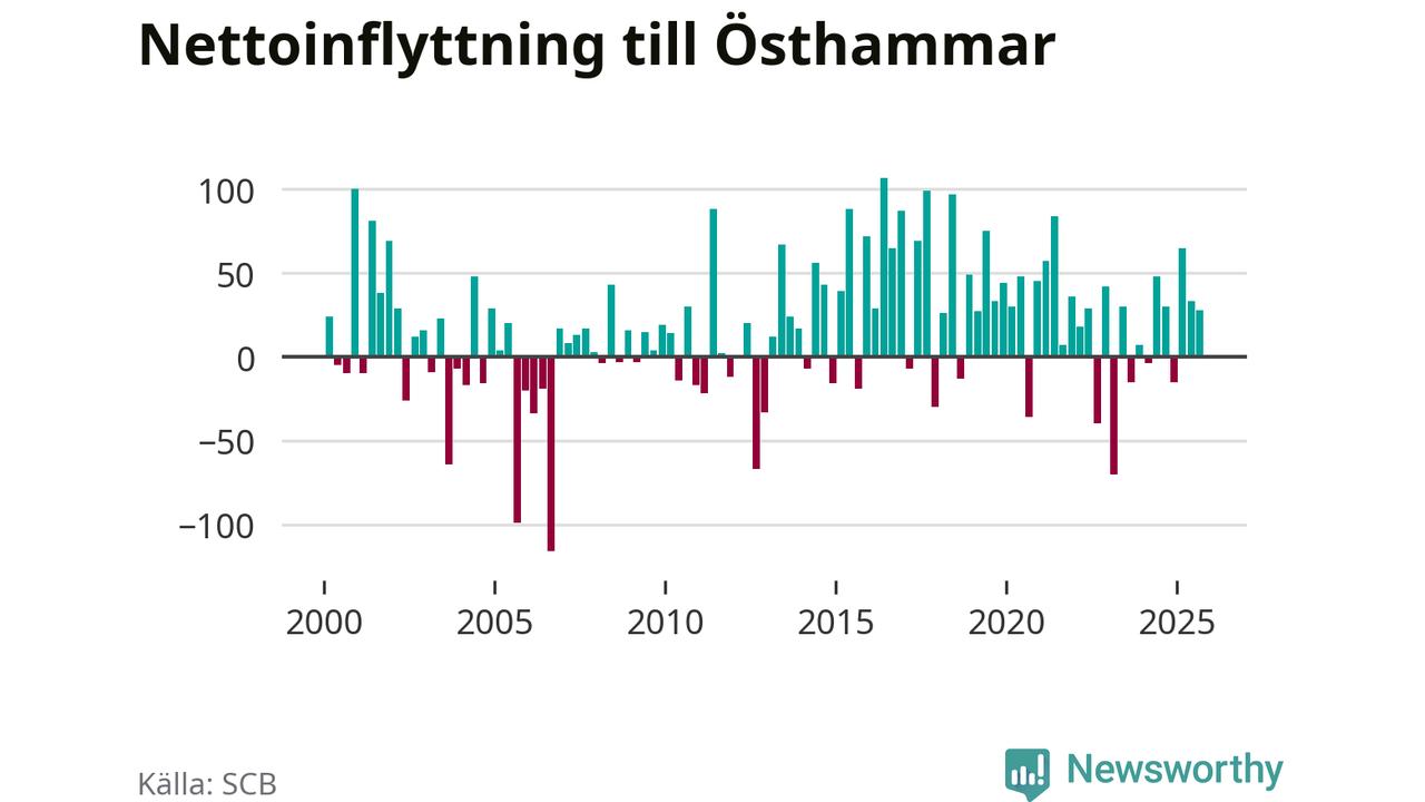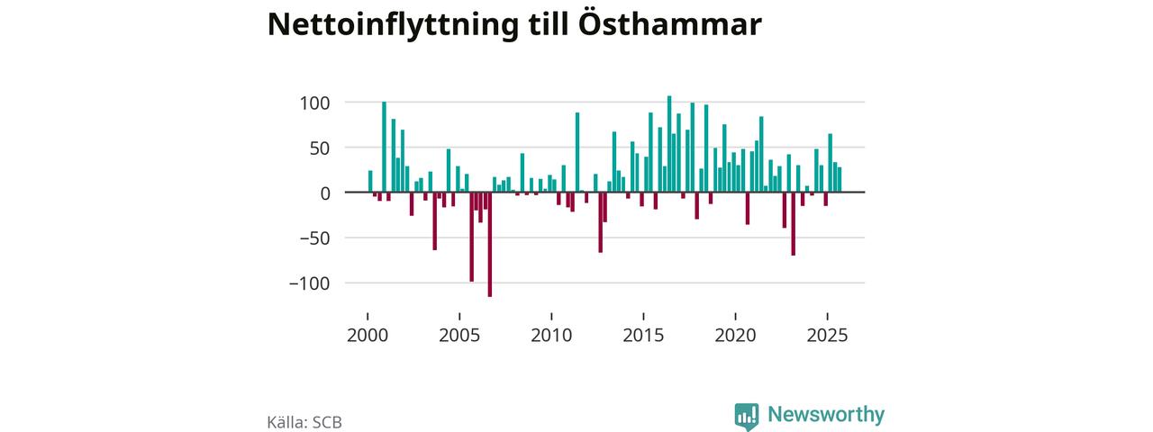 Under tredje kvartalet 2025 flyttade 303 personer till kommunen medan 275 personer flyttade därifrån. Det är historiskt sett en stor inflyttning under ett kvartal. Sedan seklets början har Östhammar oftast haft ett positivt flyttnetto, inklusive det senaste kvartalet.