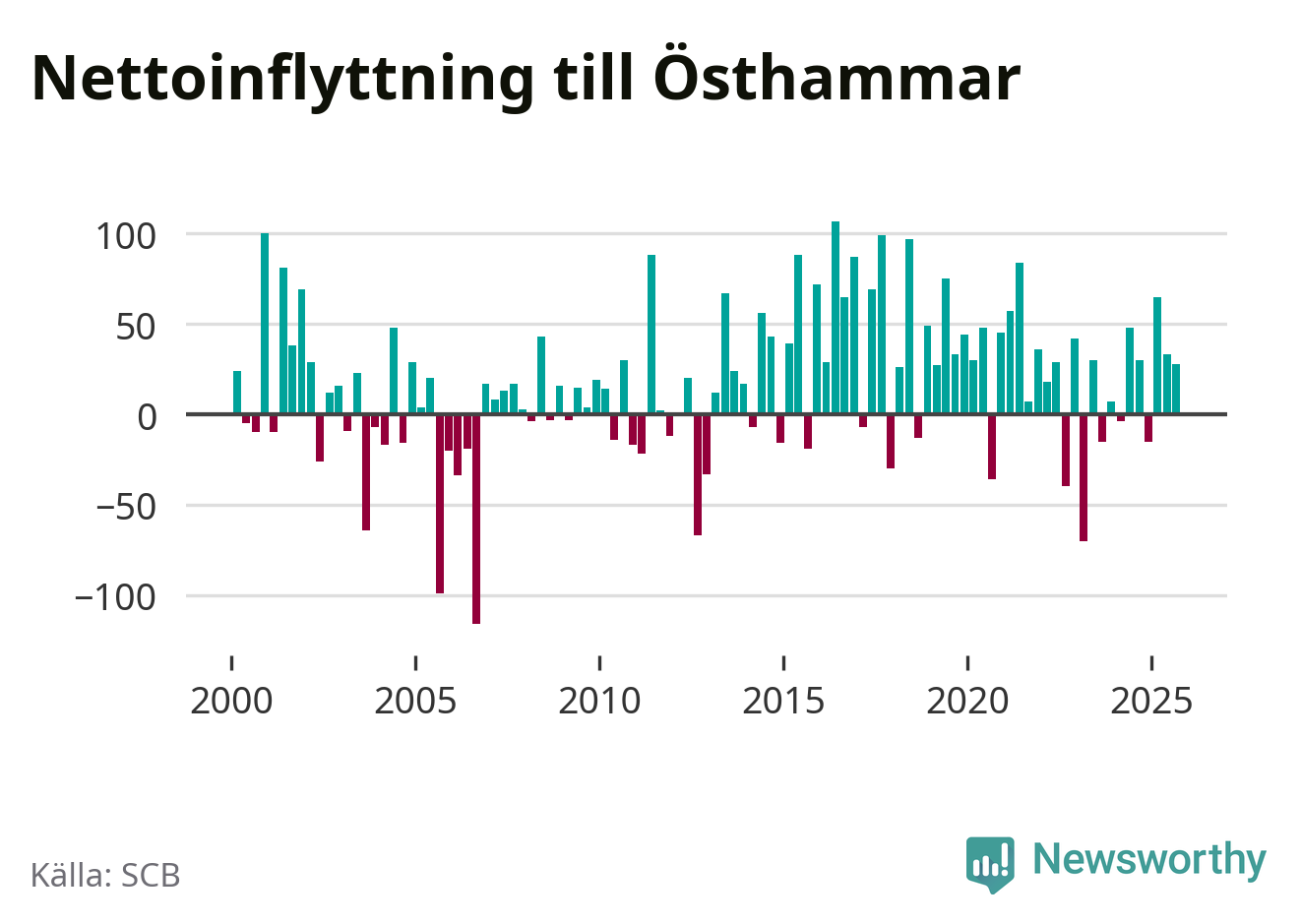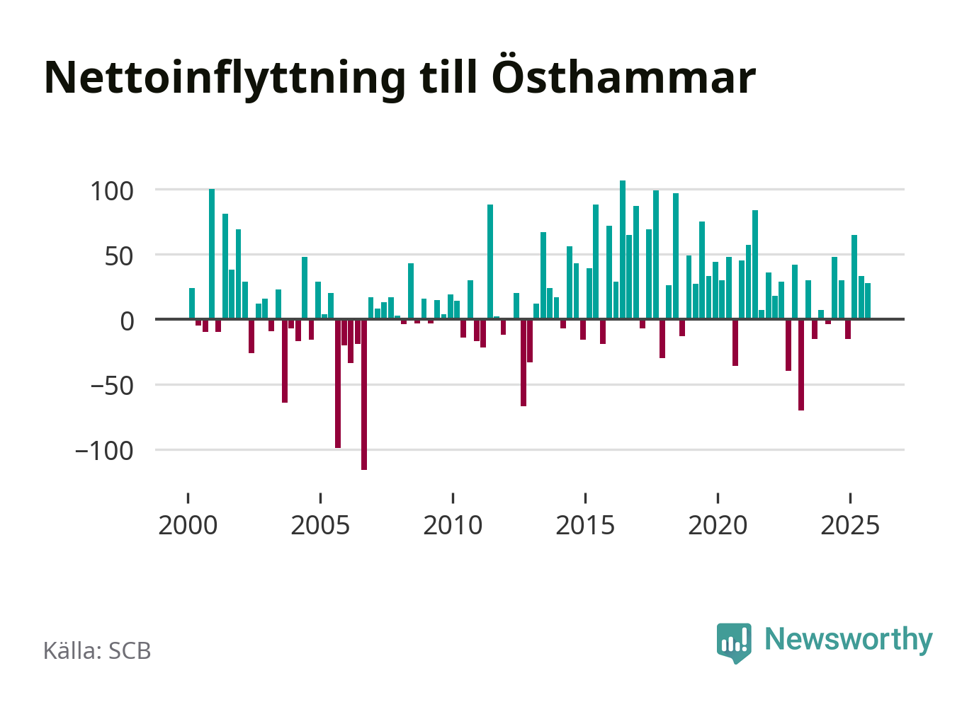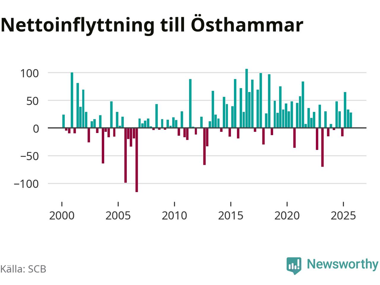 Under tredje kvartalet 2025 flyttade 303 personer till kommunen medan 275 personer flyttade därifrån. Det är historiskt sett en stor inflyttning under ett kvartal. Sedan seklets början har Östhammar oftast haft ett positivt flyttnetto, inklusive det senaste kvartalet.