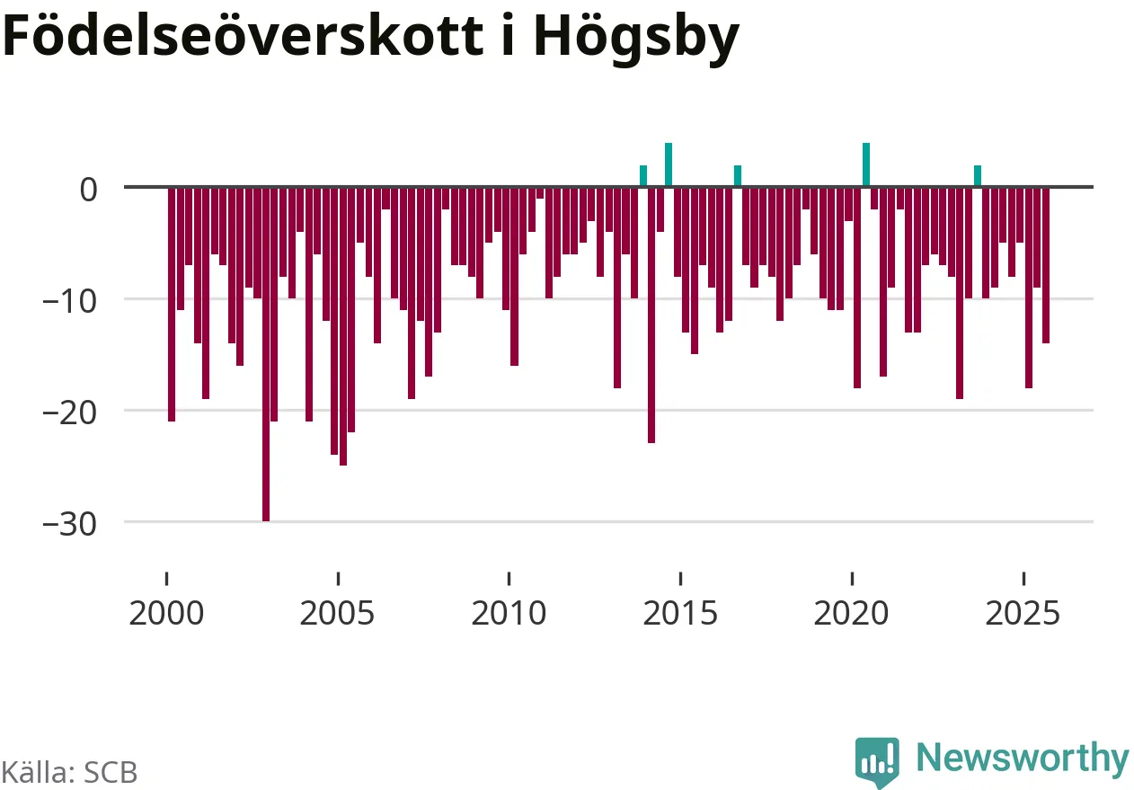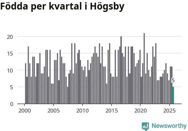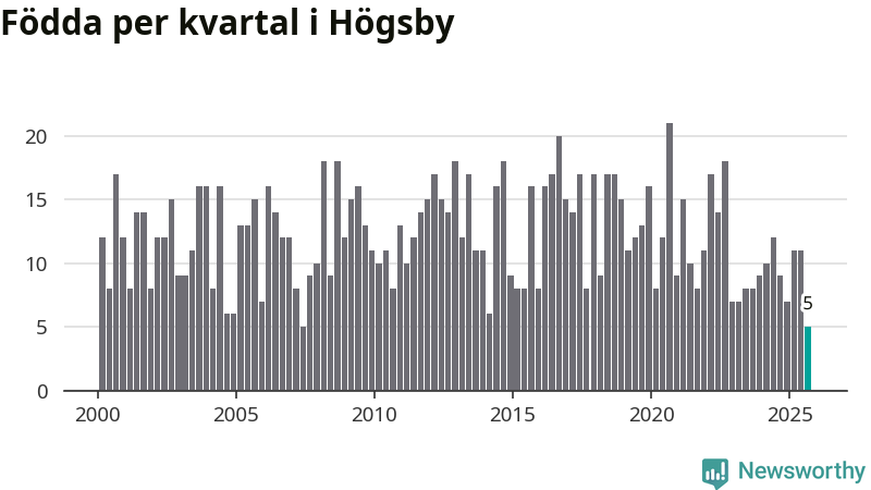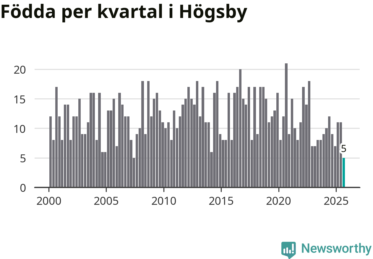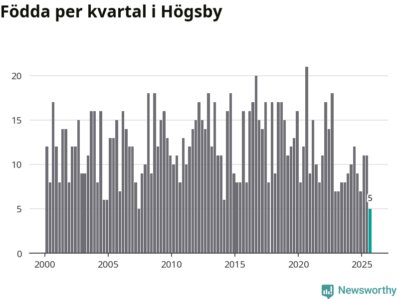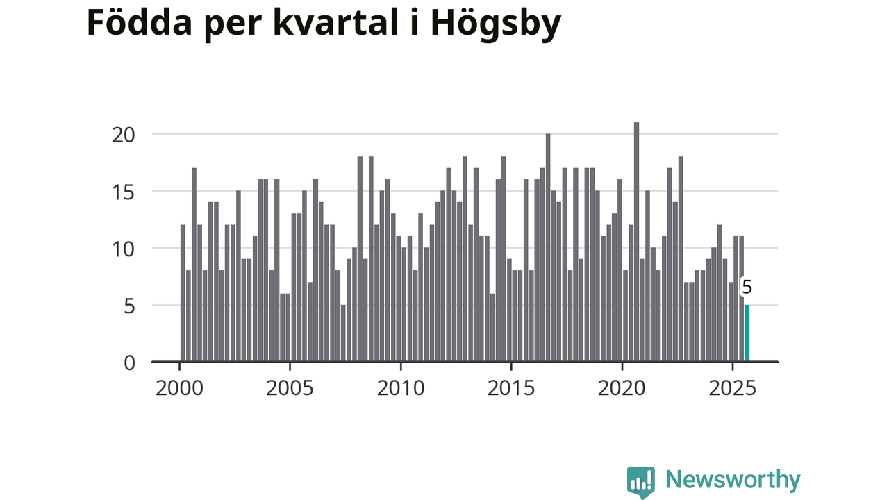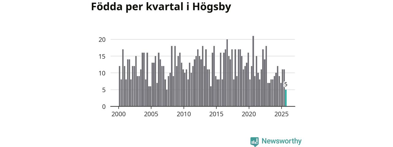 Enligt SCB:s siffror föddes fem barn i Högsby under det senaste kvartalet. Det är det lägsta födelsetal som registrerats i kommunen under 2000-talet. Det finns en osäkerhet här, eftersom SCB lägger på ett slumpmässigt brus på alla siffror. Klart är i alla fall att det är ett mycket lågt födslotal. Samtidigt avled 19 personer. Högsby hade alltså ett negativt födelsenetto, vilket kommunen historiskt sett nästan alltid har haft.