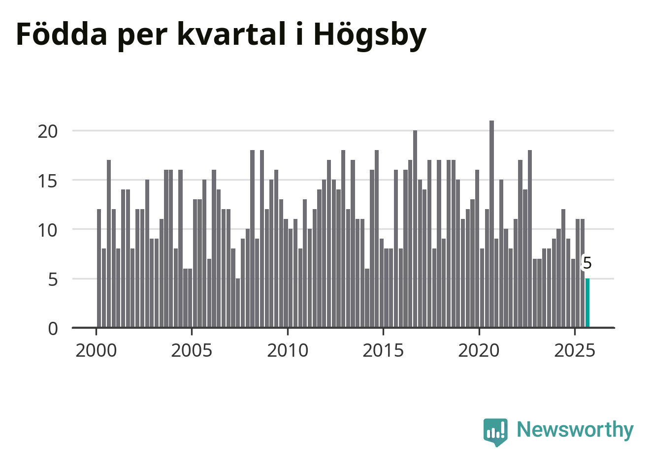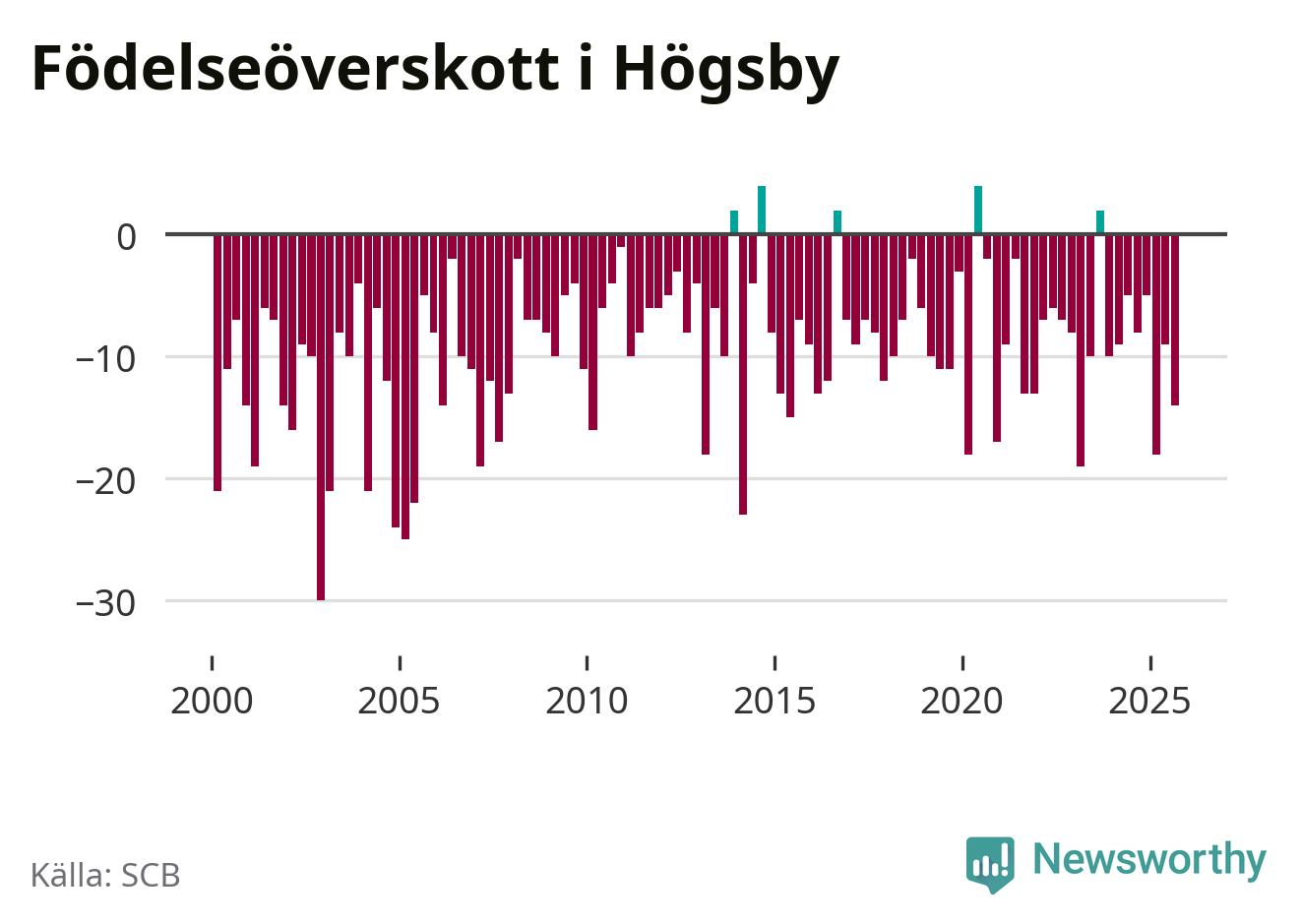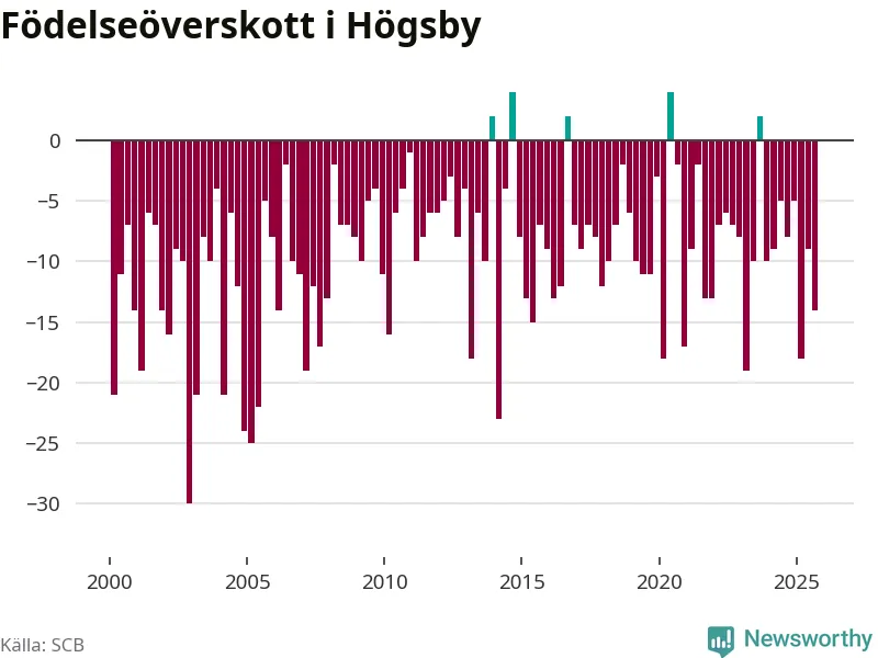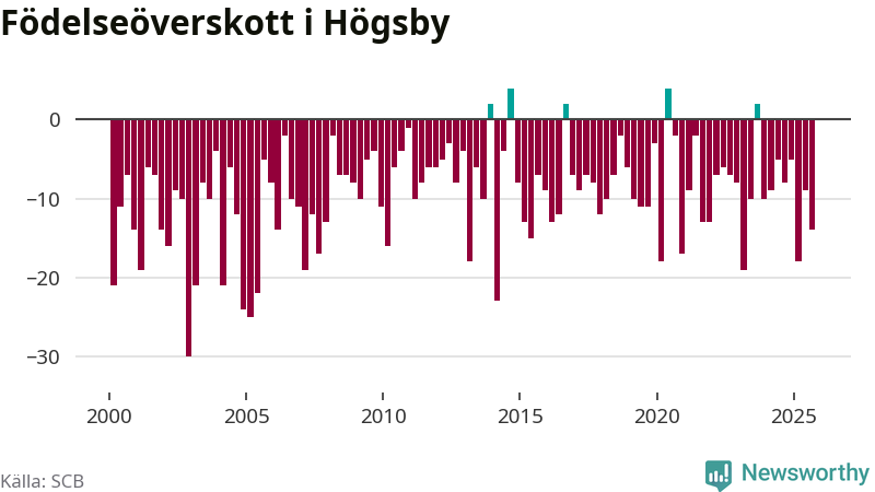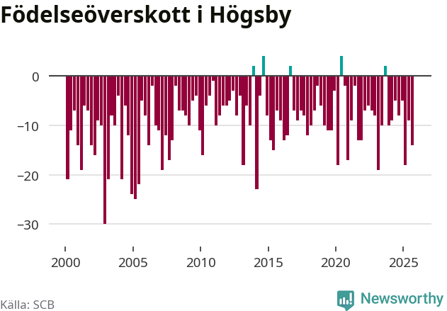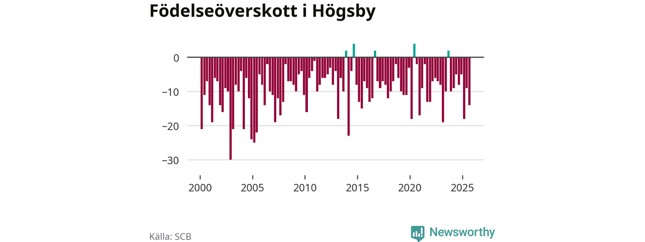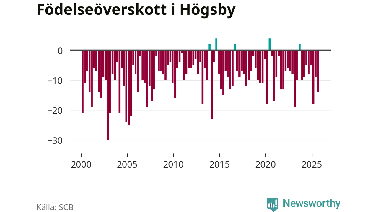 Enligt SCB:s siffror föddes fem barn i Högsby under det senaste kvartalet. Det är det lägsta födelsetal som registrerats i kommunen under 2000-talet. Det finns en osäkerhet här, eftersom SCB lägger på ett slumpmässigt brus på alla siffror. Klart är i alla fall att det är ett mycket lågt födslotal. Samtidigt avled 19 personer. Högsby hade alltså ett negativt födelsenetto, vilket kommunen historiskt sett nästan alltid har haft.