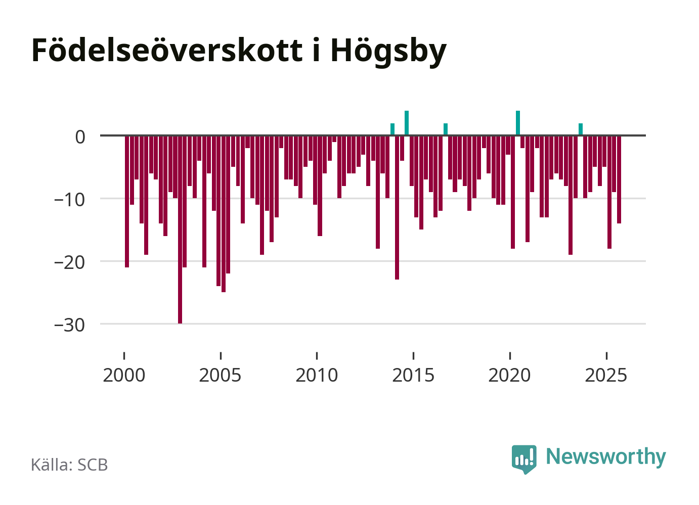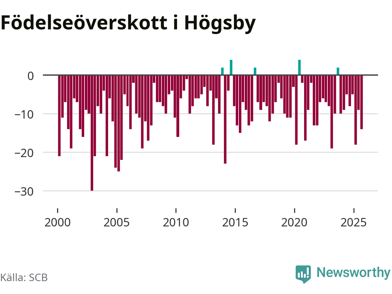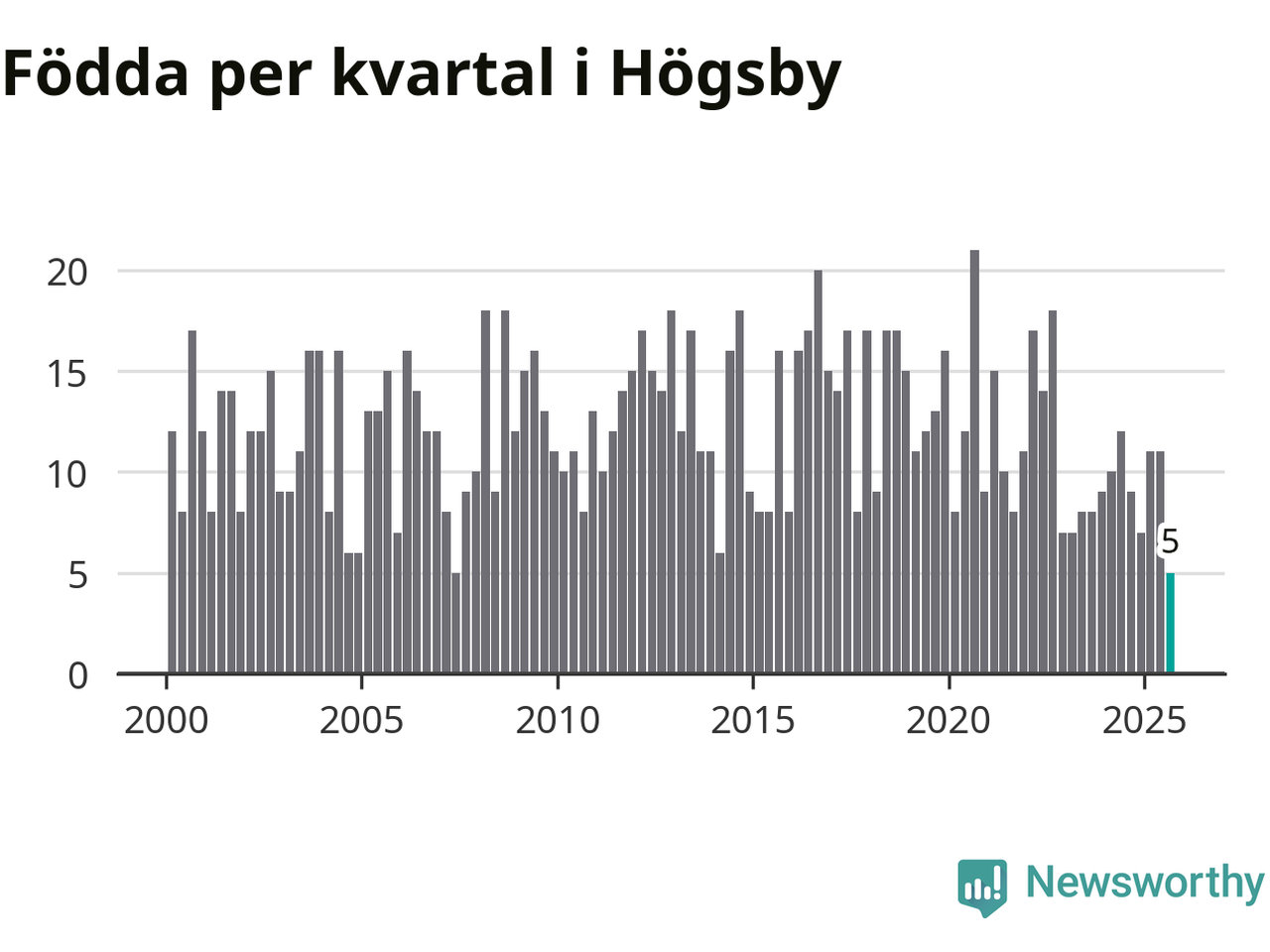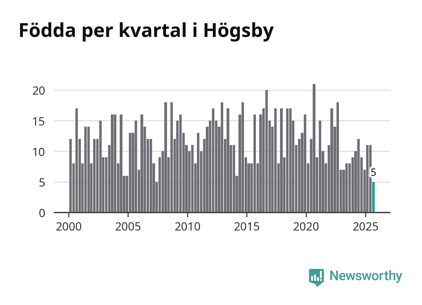 Enligt SCB:s siffror föddes fem barn i Högsby under det senaste kvartalet. Det är det lägsta födelsetal som registrerats i kommunen under 2000-talet. Det finns en osäkerhet här, eftersom SCB lägger på ett slumpmässigt brus på alla siffror. Klart är i alla fall att det är ett mycket lågt födslotal. Samtidigt avled 19 personer. Högsby hade alltså ett negativt födelsenetto, vilket kommunen historiskt sett nästan alltid har haft.