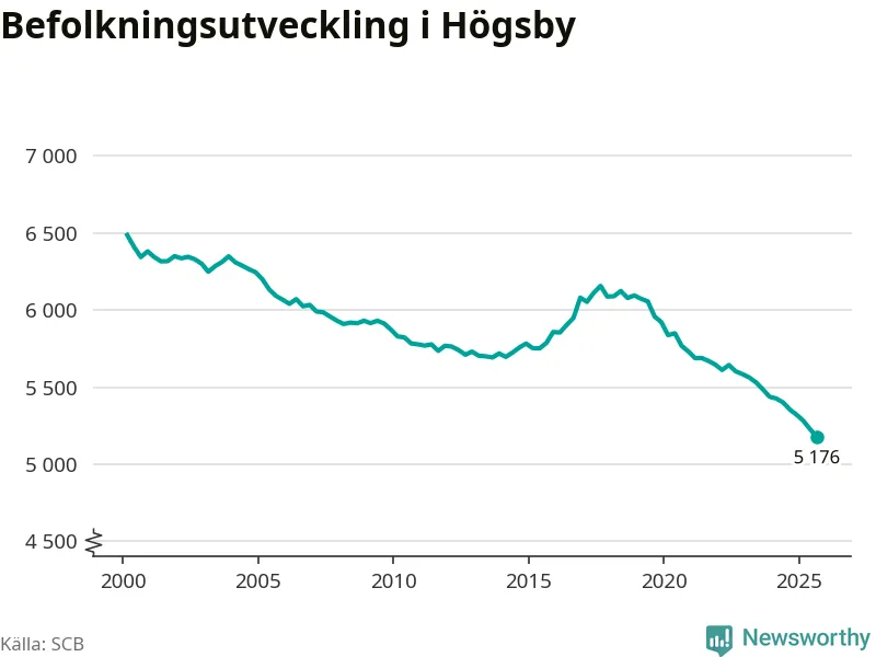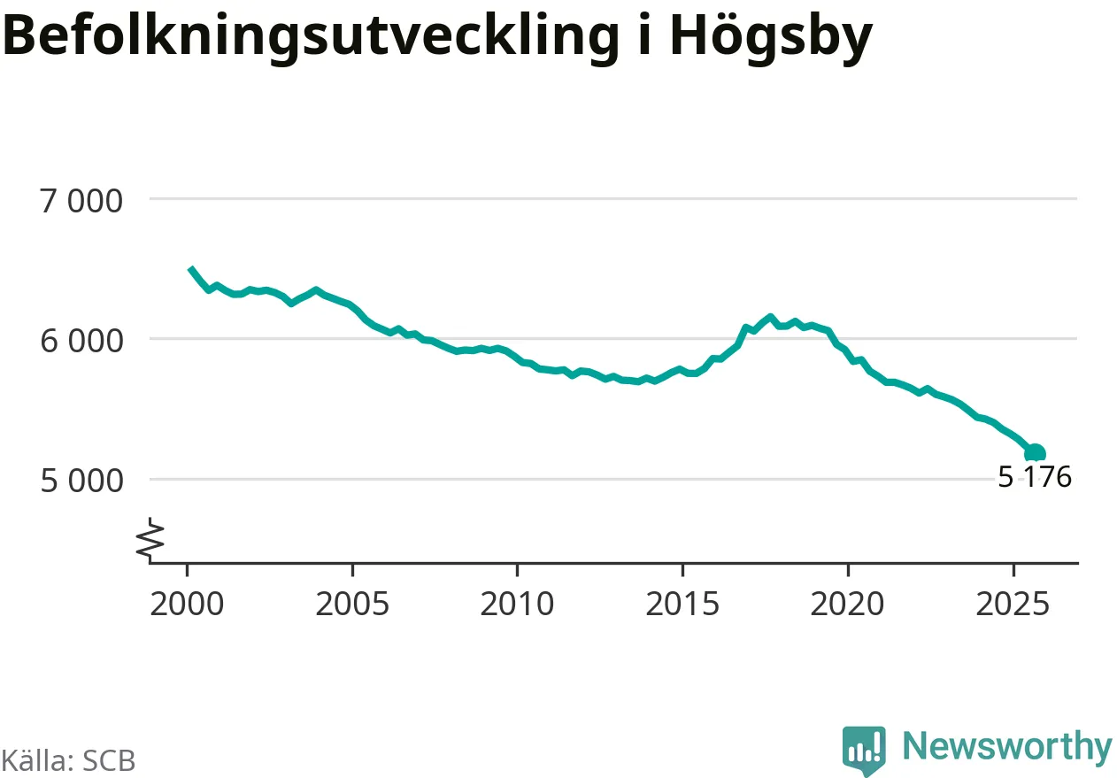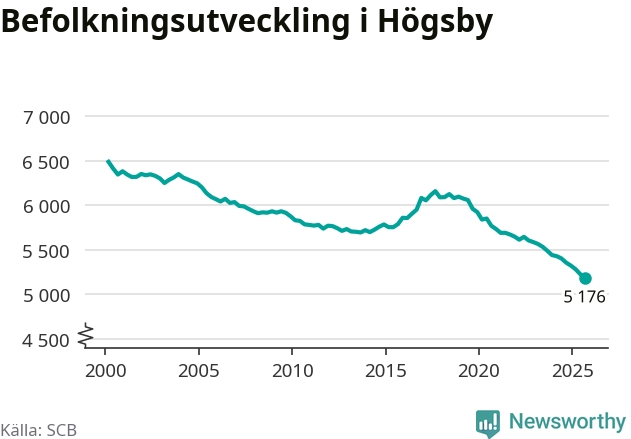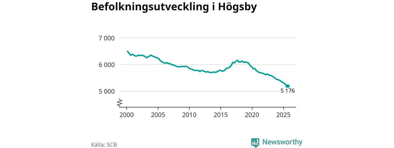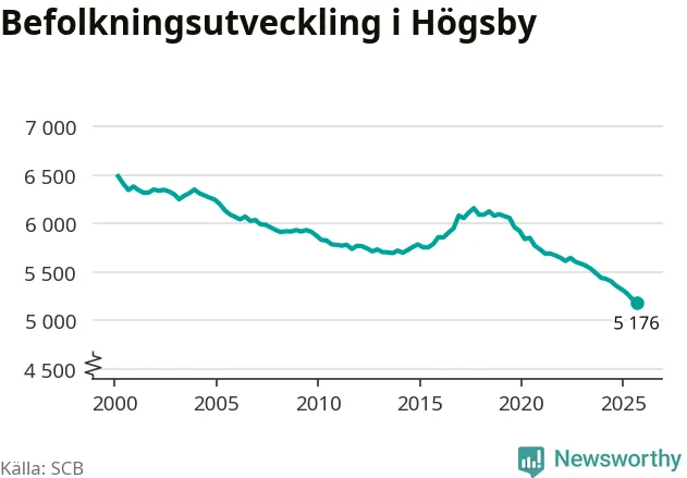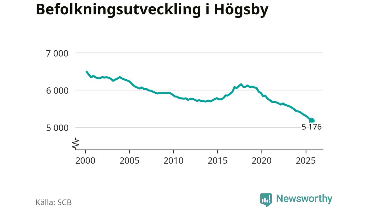 Befolkningen minskade i Högsby kommun under det tredje kvartalet 2025. Den 30 september bodde enligt SCB:s senaste siffror 5 176 personer i kommunen, vilket är 51 färre än i slutet av andra kvartalet. Det gör Högsby till en av de kommuner som minskar mest, procentuellt sett, i hela landet – och mest i Kalmar län.