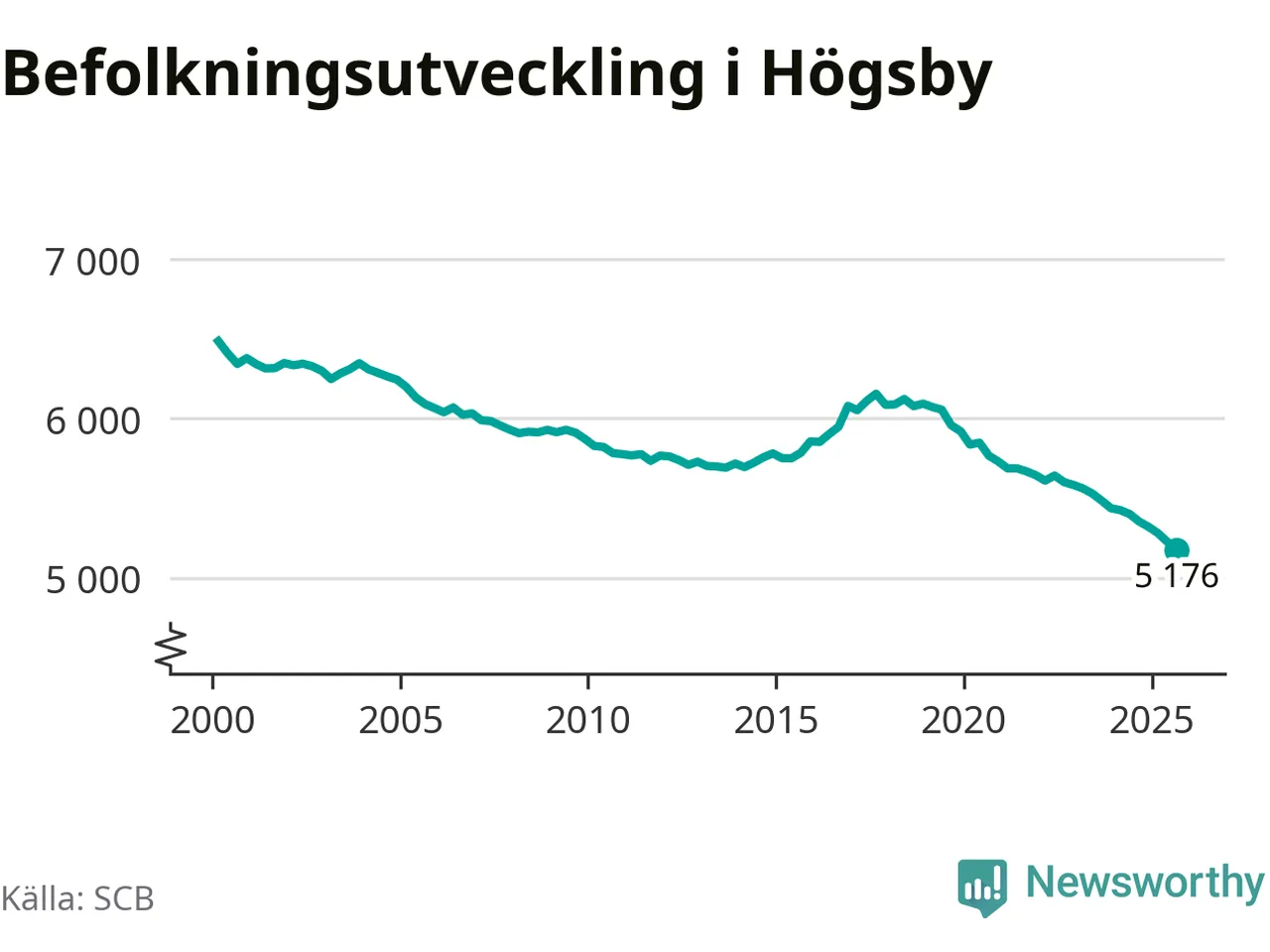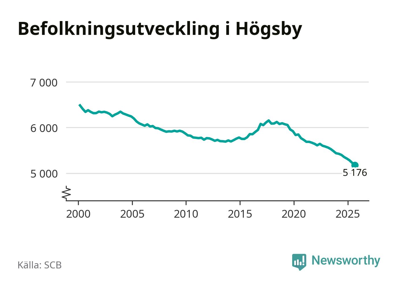 Jämfört med för ett år sedan har befolkningen i Högsby minskat med ungefär 180 personer – vilket motsvarar en nedgång på 3,3 procent. Sedan millennieskiftet har folkmängden minskat med 1 310 personer, eller 20 procent. Det är den största minskningen i Kalmar län under den perioden.