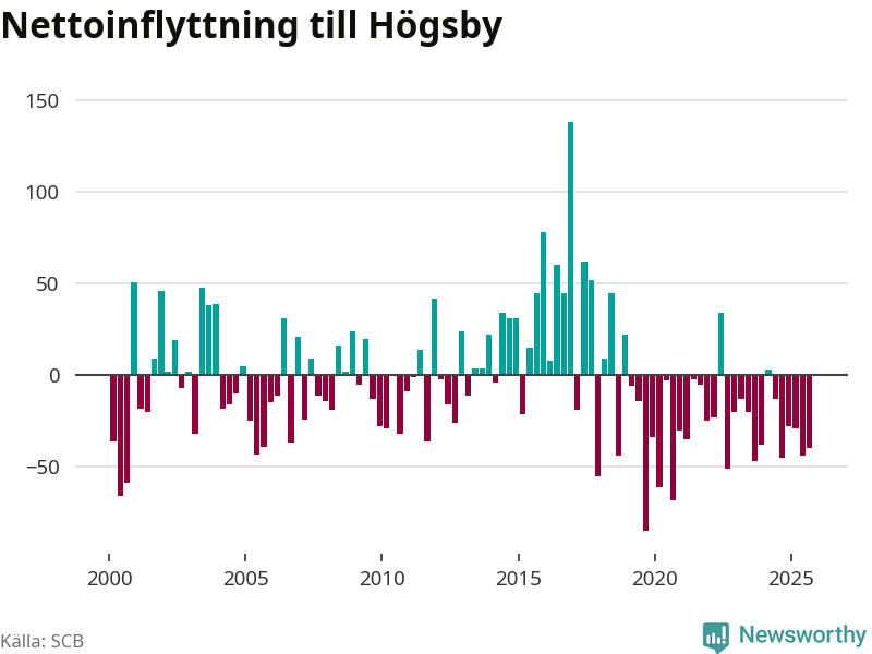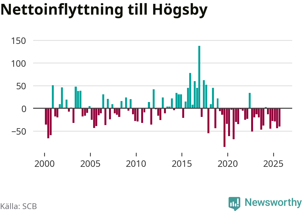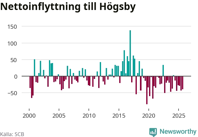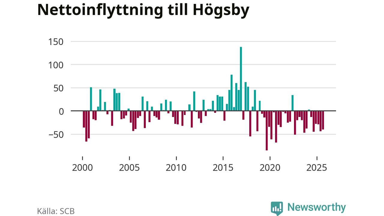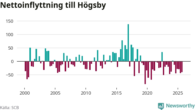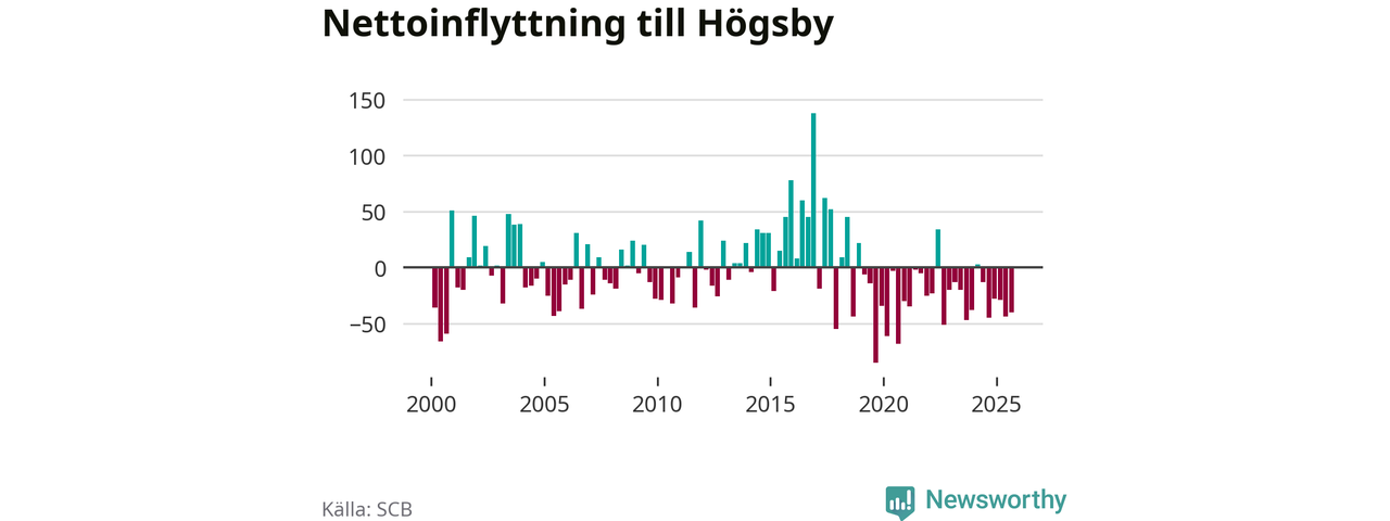 Under tredje kvartalet 2025 flyttade 74 personer till kommunen medan 114 personer flyttade därifrån. Sedan seklets början har Högsby oftast haft ett negativt flyttnetto.