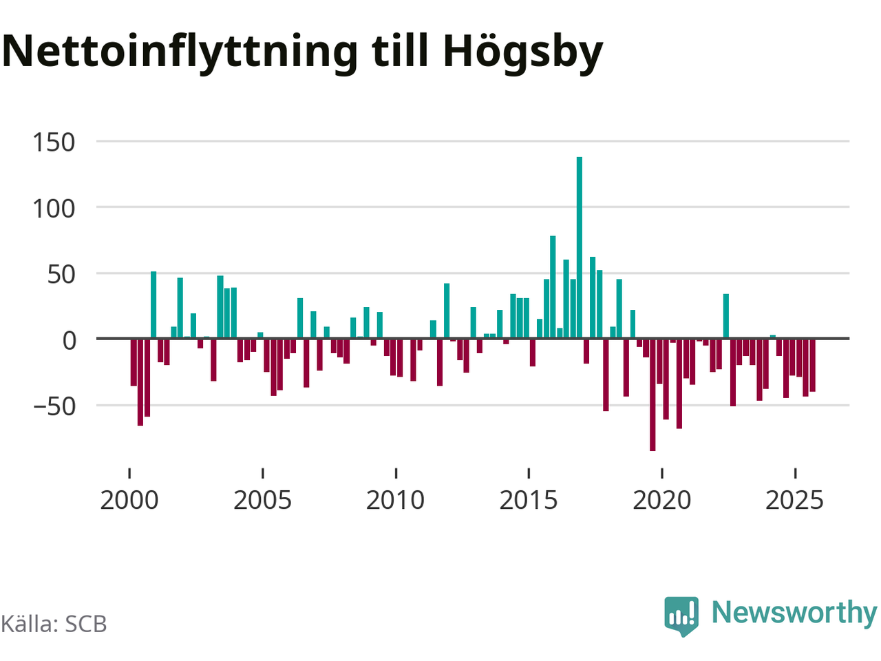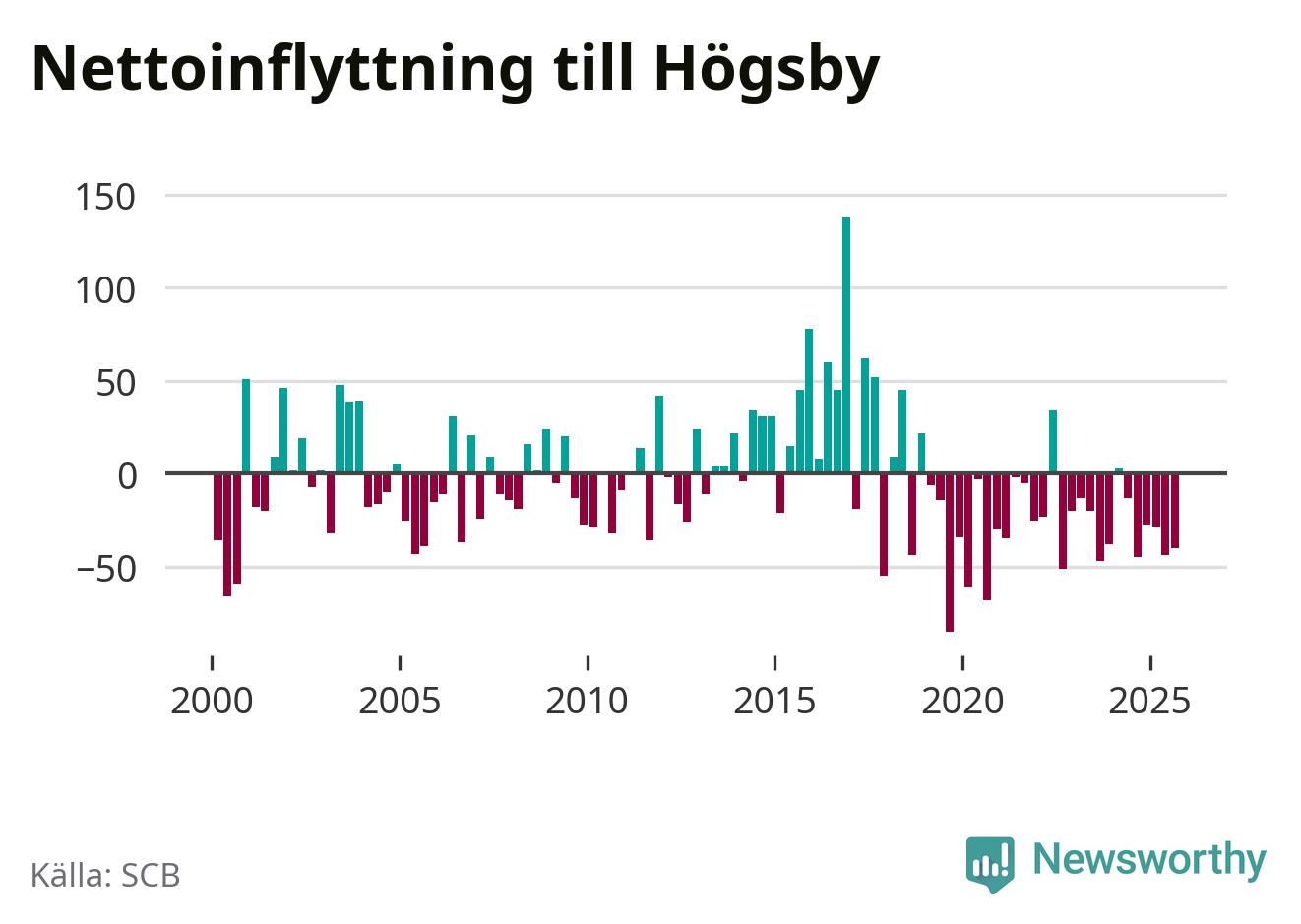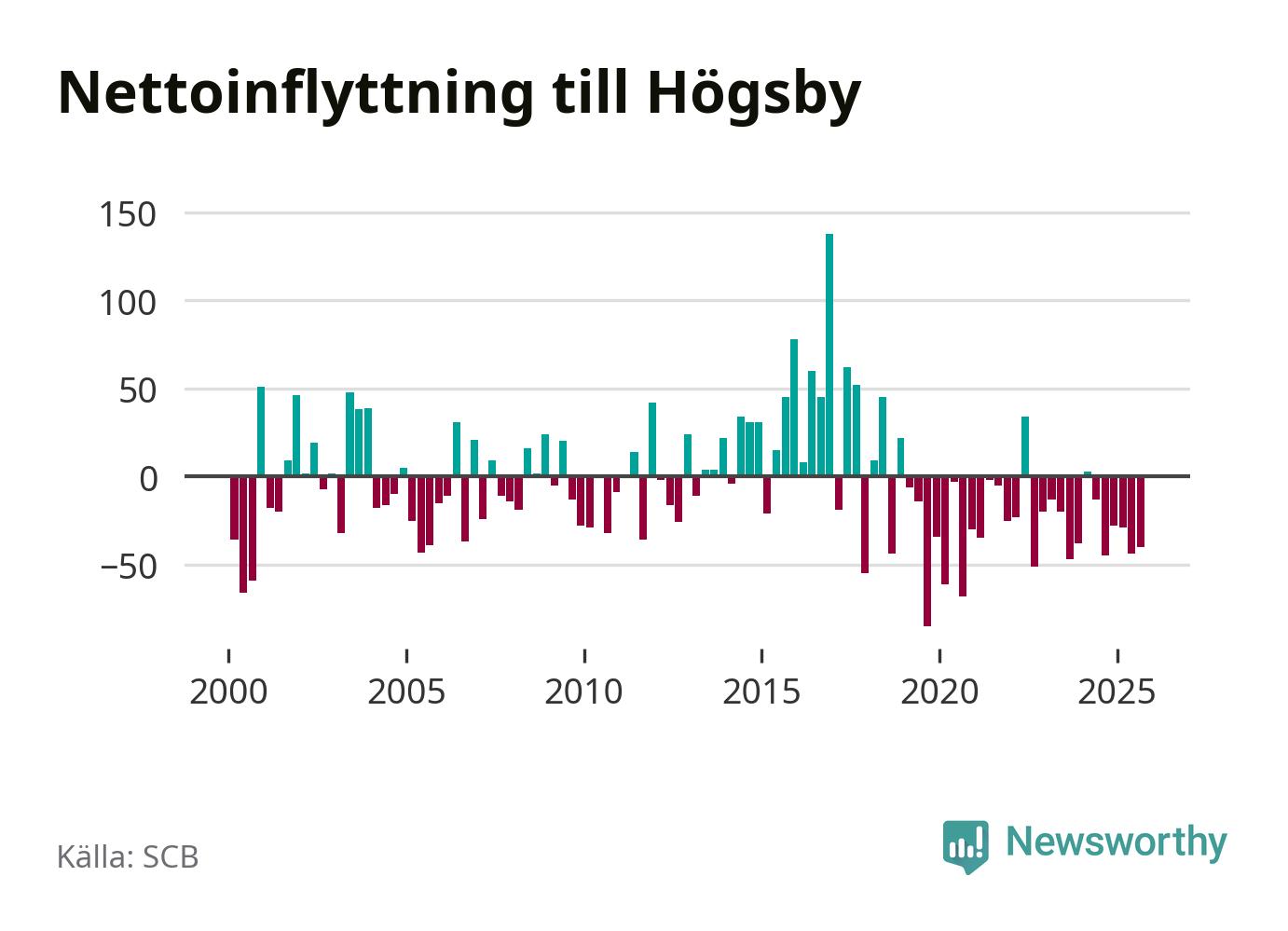 Under tredje kvartalet 2025 flyttade 74 personer till kommunen medan 114 personer flyttade därifrån. Sedan seklets början har Högsby oftast haft ett negativt flyttnetto.