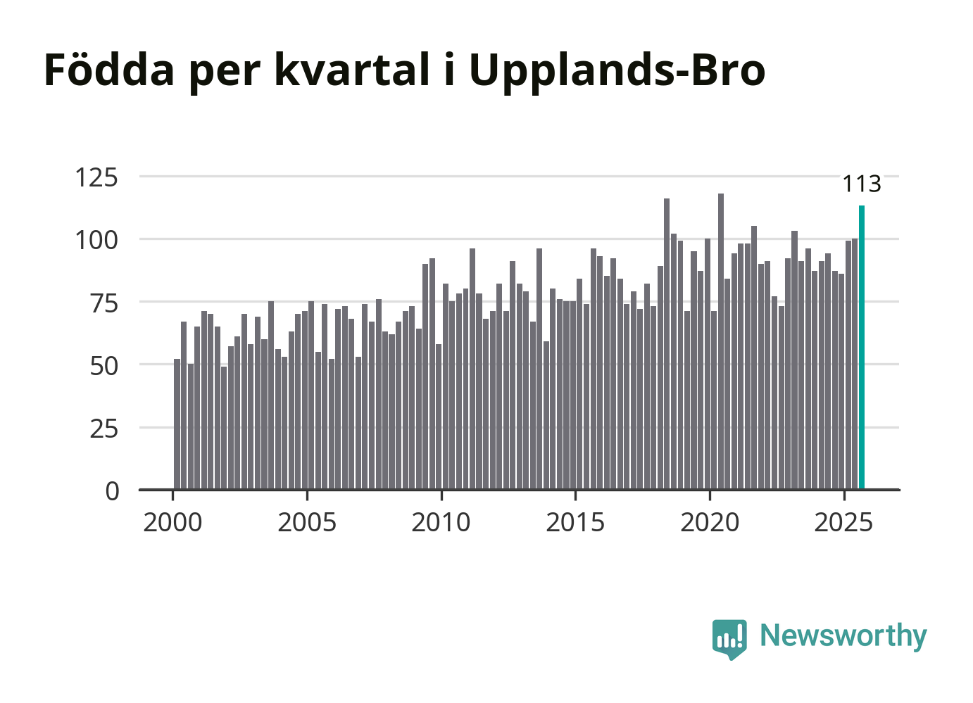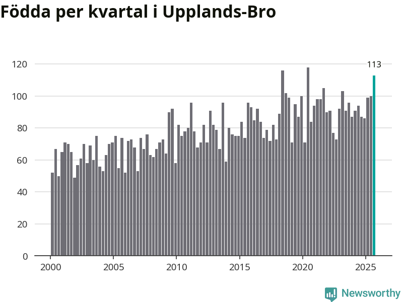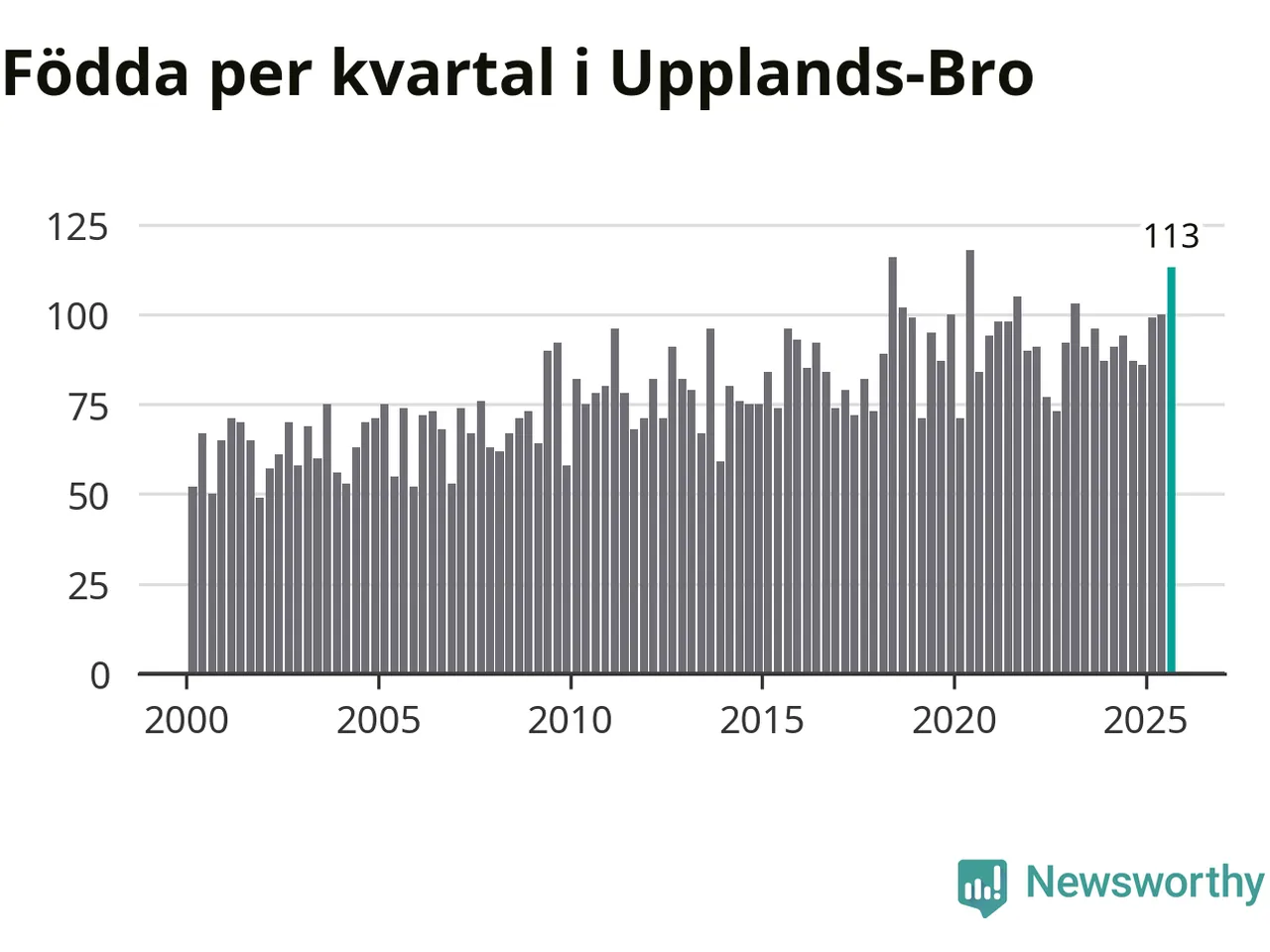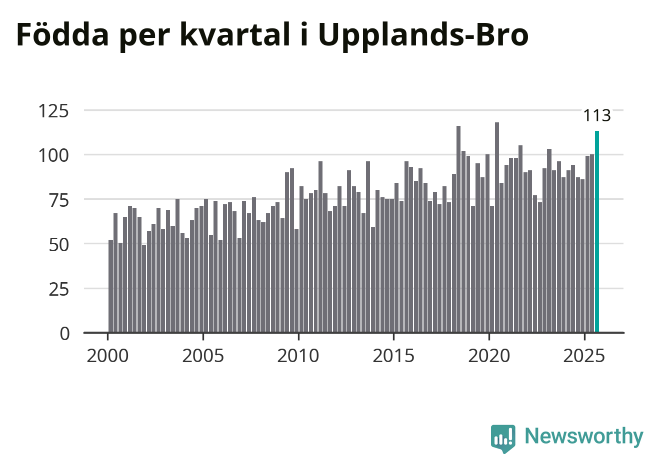 Enligt SCB:s siffror föddes 113 barn i Upplands-Bro under det senaste kvartalet, vilket är en relativt hög siffra historiskt sett. Samtidigt avled 55 personer. Upplands-Bro hade alltså ett positivt födelsenetto, vilket kommunen historiskt sett i princip alltid har haft.
