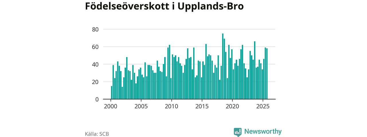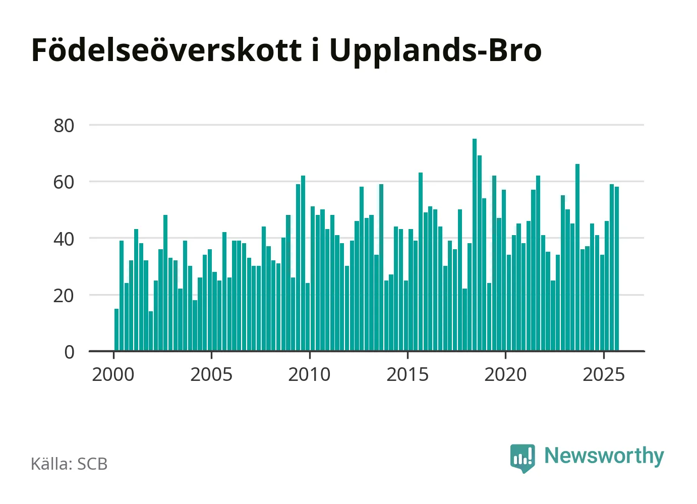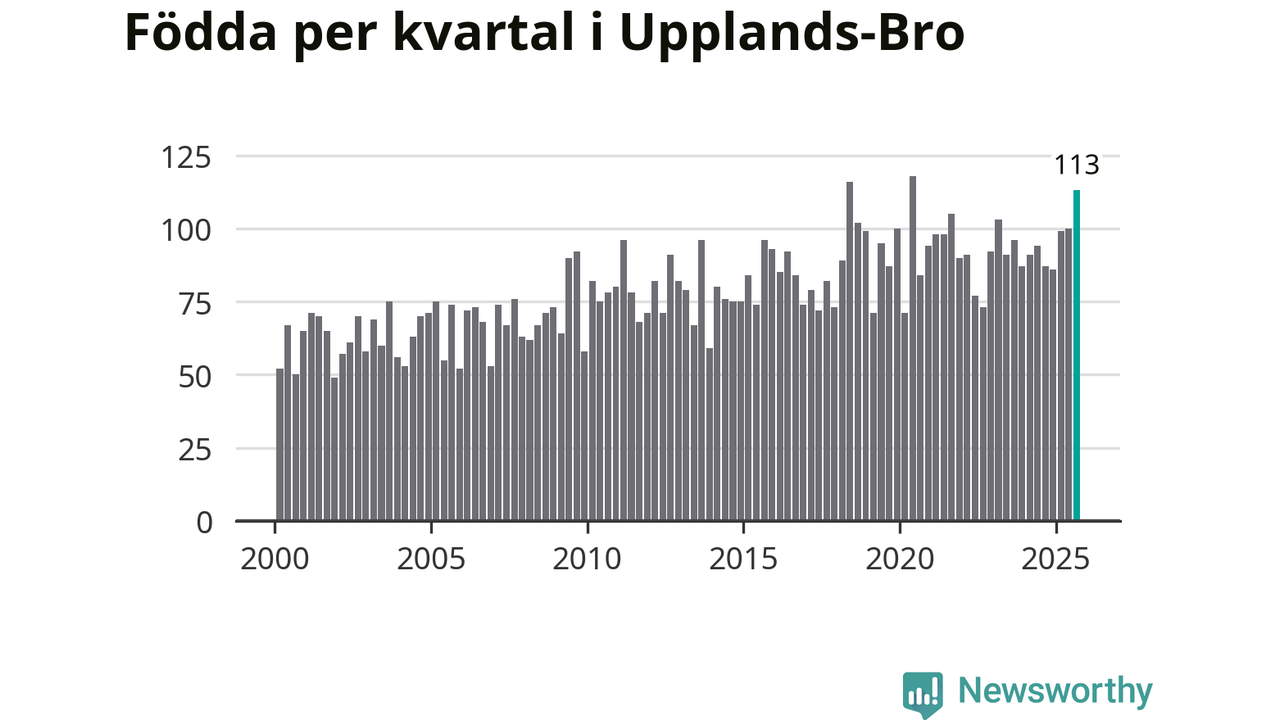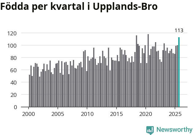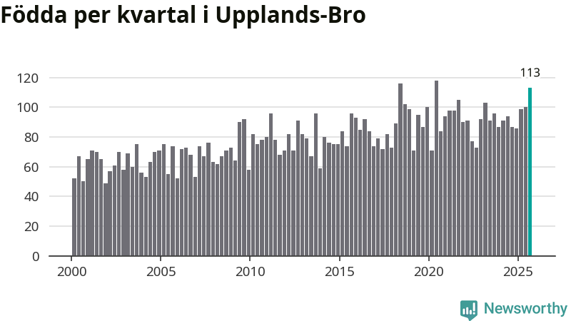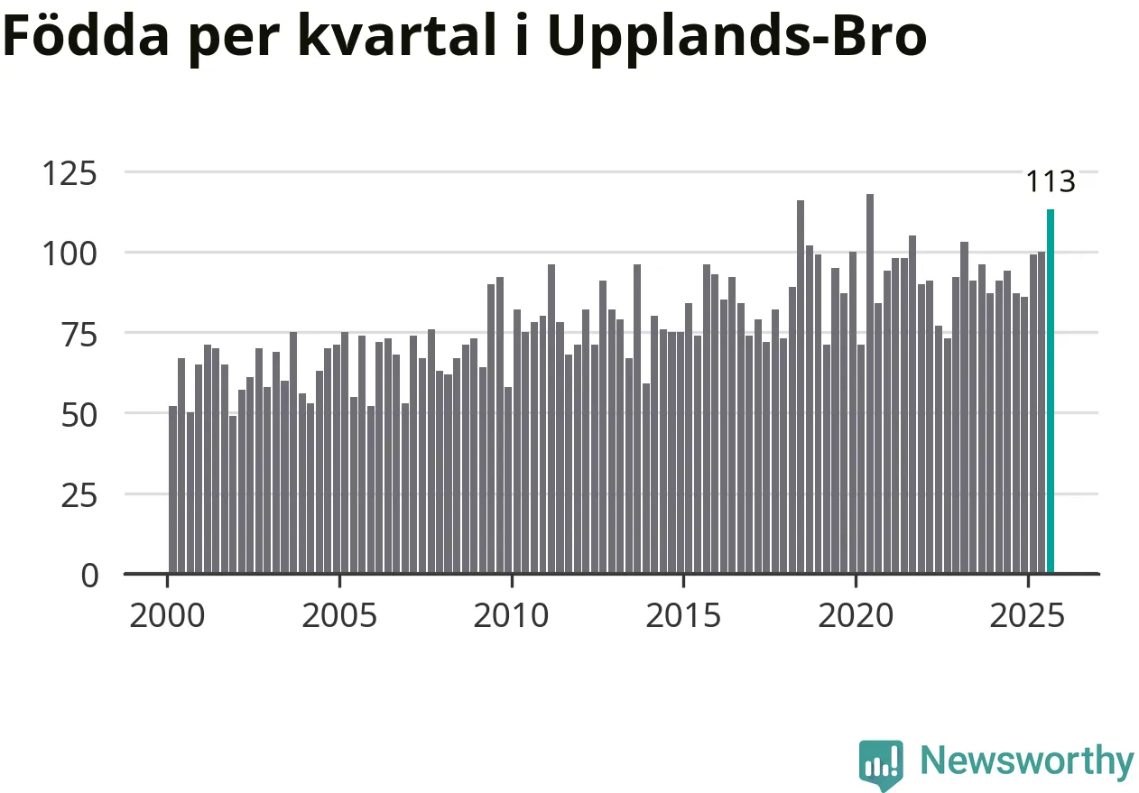 Enligt SCB:s siffror föddes 113 barn i Upplands-Bro under det senaste kvartalet, vilket är en relativt hög siffra historiskt sett. Samtidigt avled 55 personer. Upplands-Bro hade alltså ett positivt födelsenetto, vilket kommunen historiskt sett i princip alltid har haft.