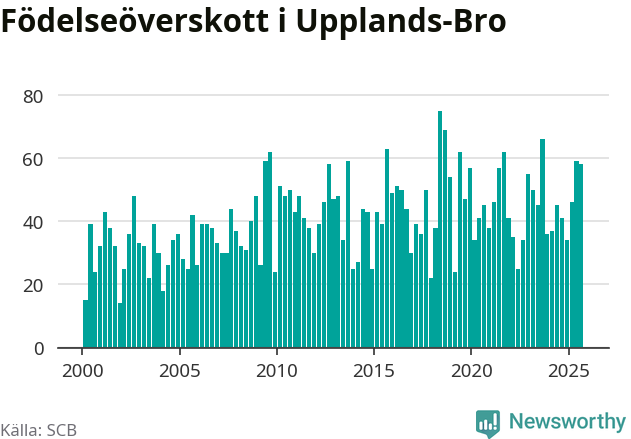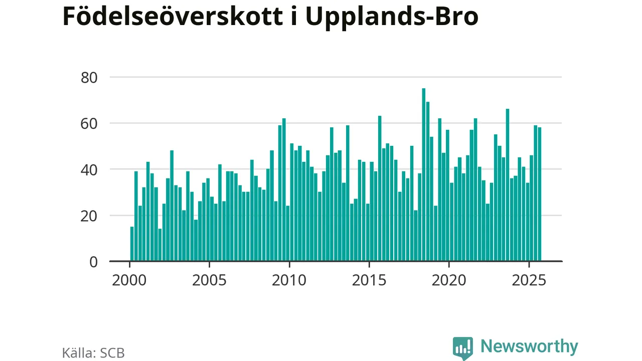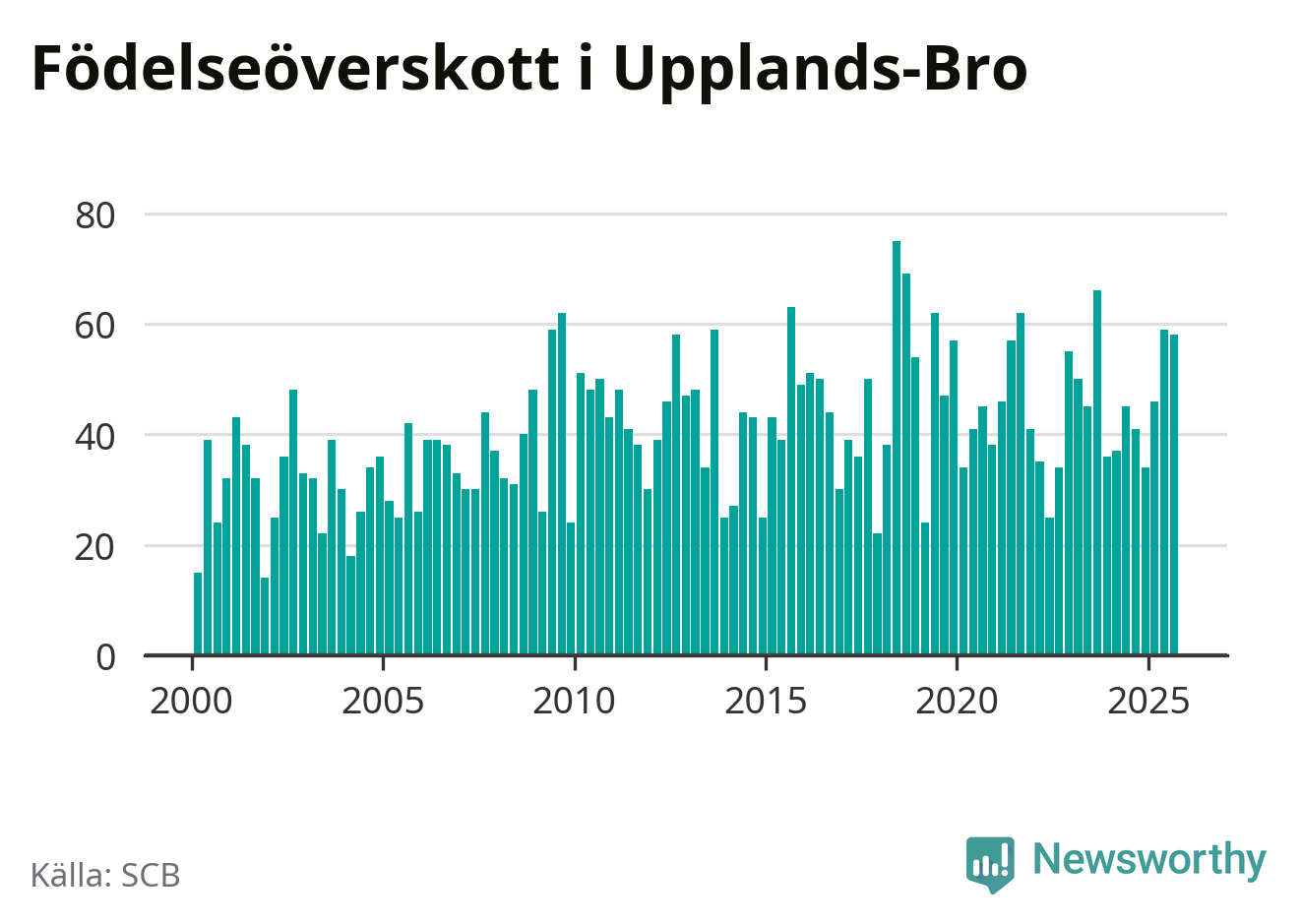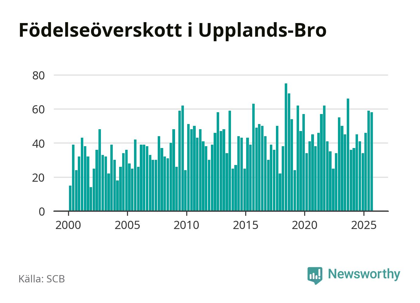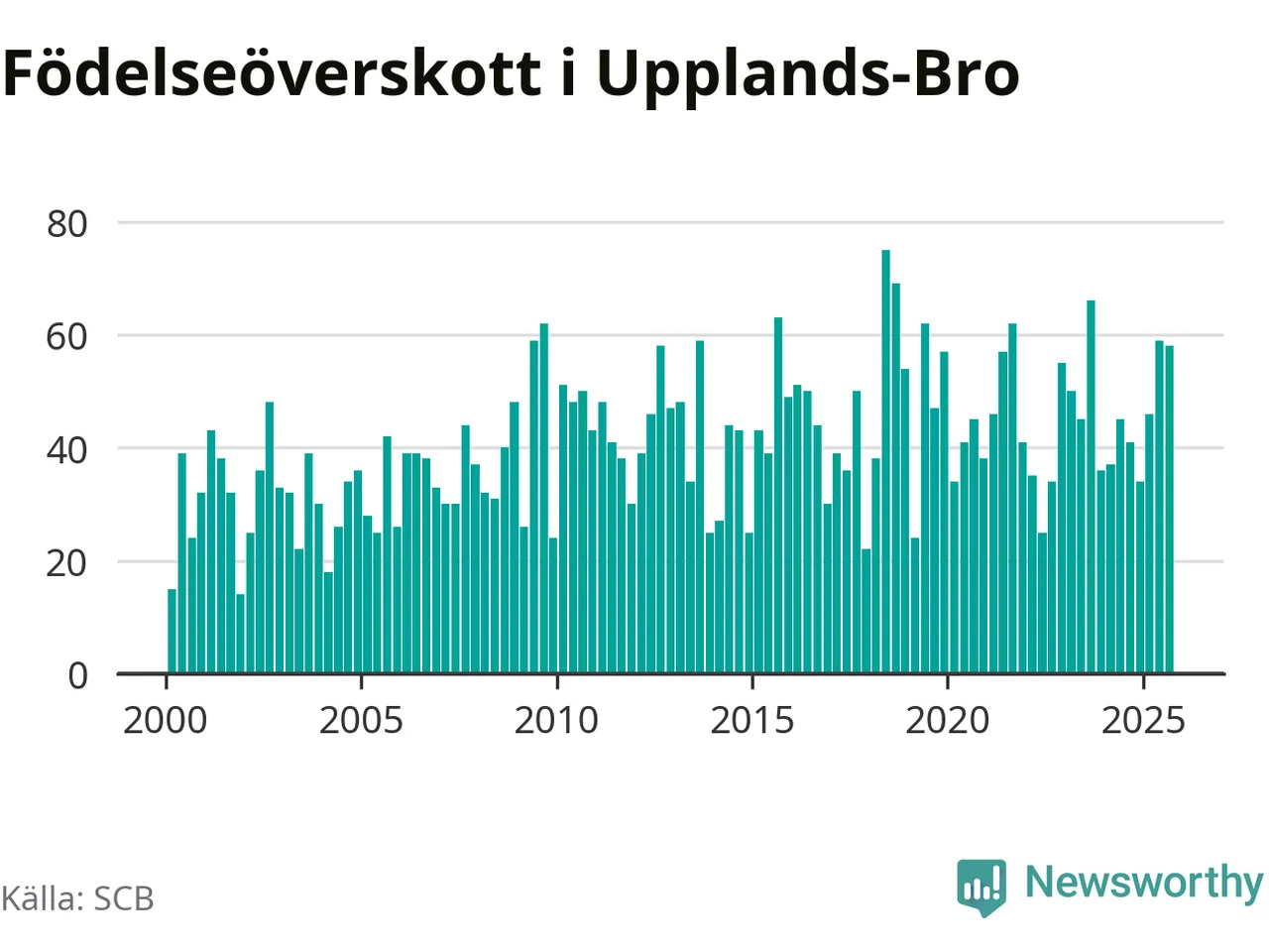 Enligt SCB:s siffror föddes 113 barn i Upplands-Bro under det senaste kvartalet, vilket är en relativt hög siffra historiskt sett. Samtidigt avled 55 personer. Upplands-Bro hade alltså ett positivt födelsenetto, vilket kommunen historiskt sett i princip alltid har haft.