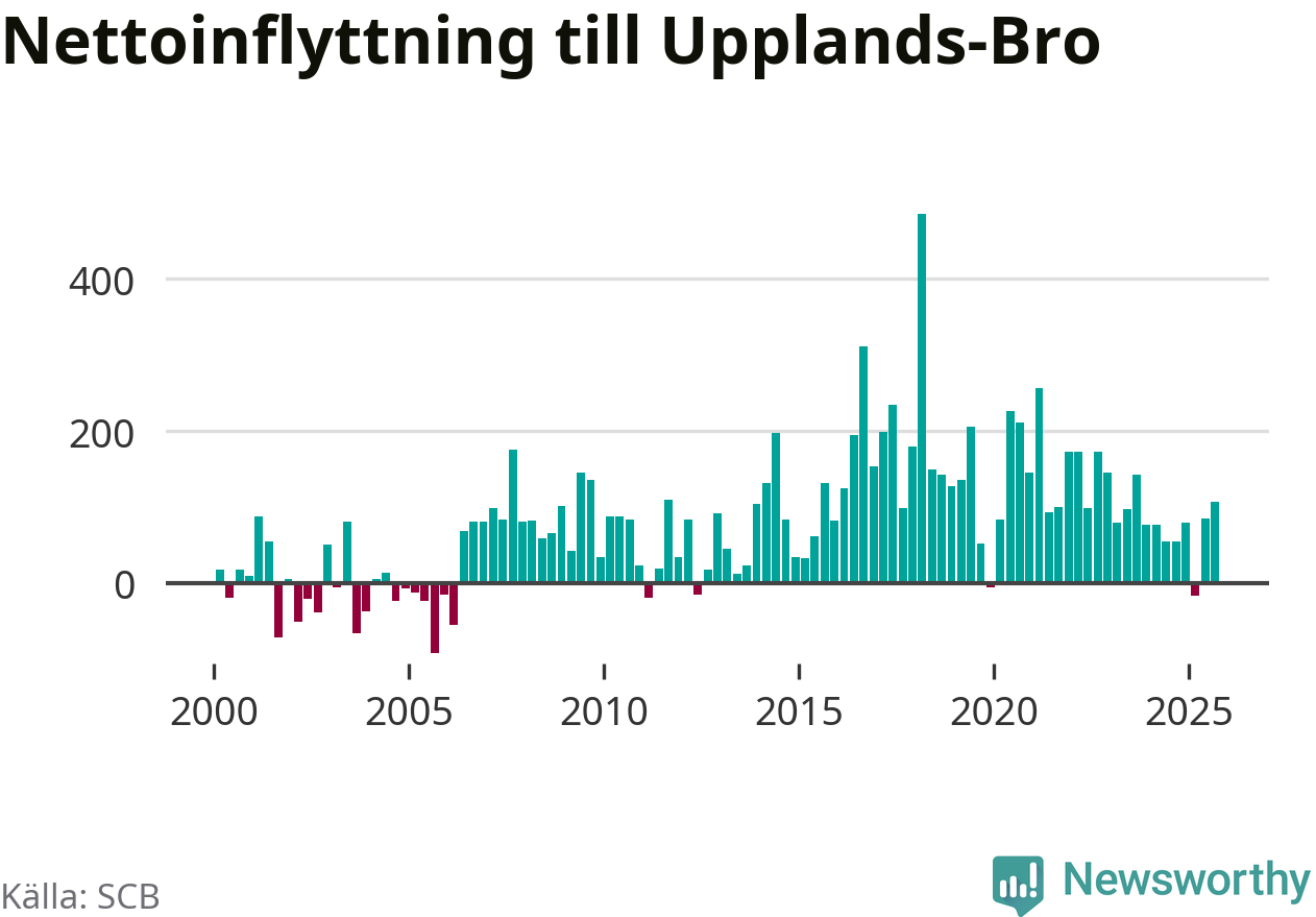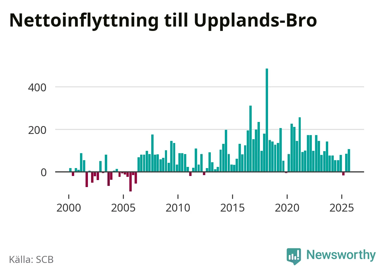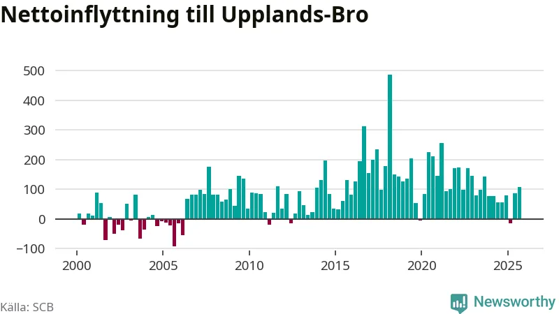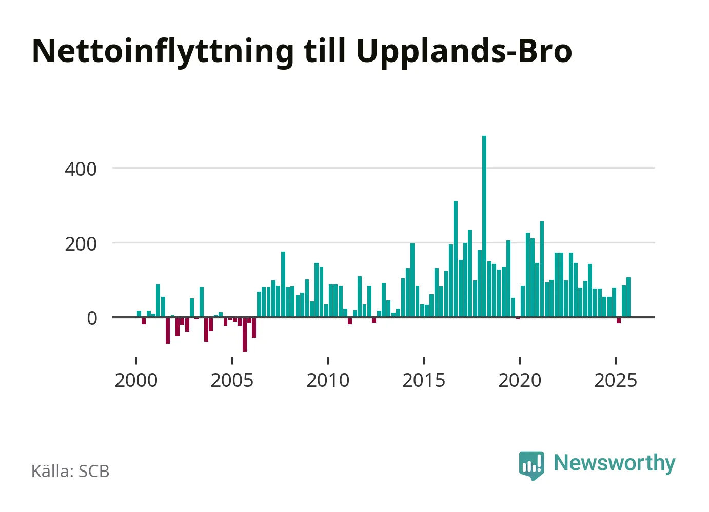 Under tredje kvartalet 2025 flyttade 957 personer till kommunen medan 850 personer flyttade därifrån. Det är historiskt sett en stor inflyttning under ett kvartal – men samtidigt var utflyttningen relativt stor. Sedan seklets början har Upplands-Bro haft ett positivt flyttnetto under nästan alla kvartal, inklusive det senaste kvartalet.