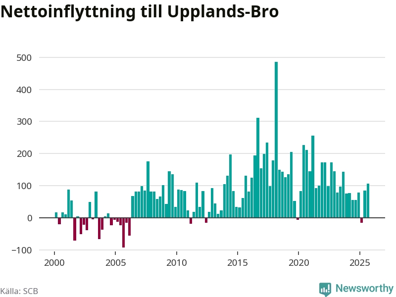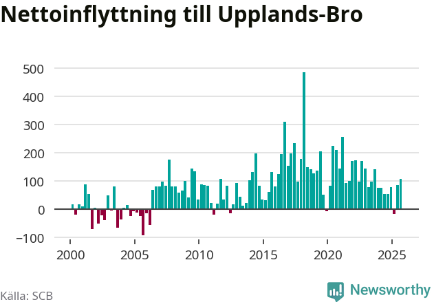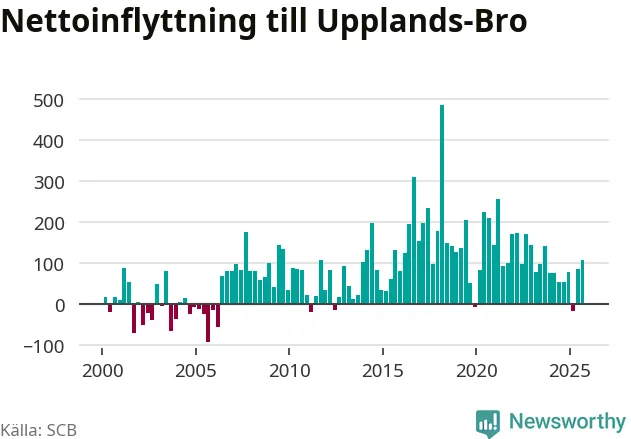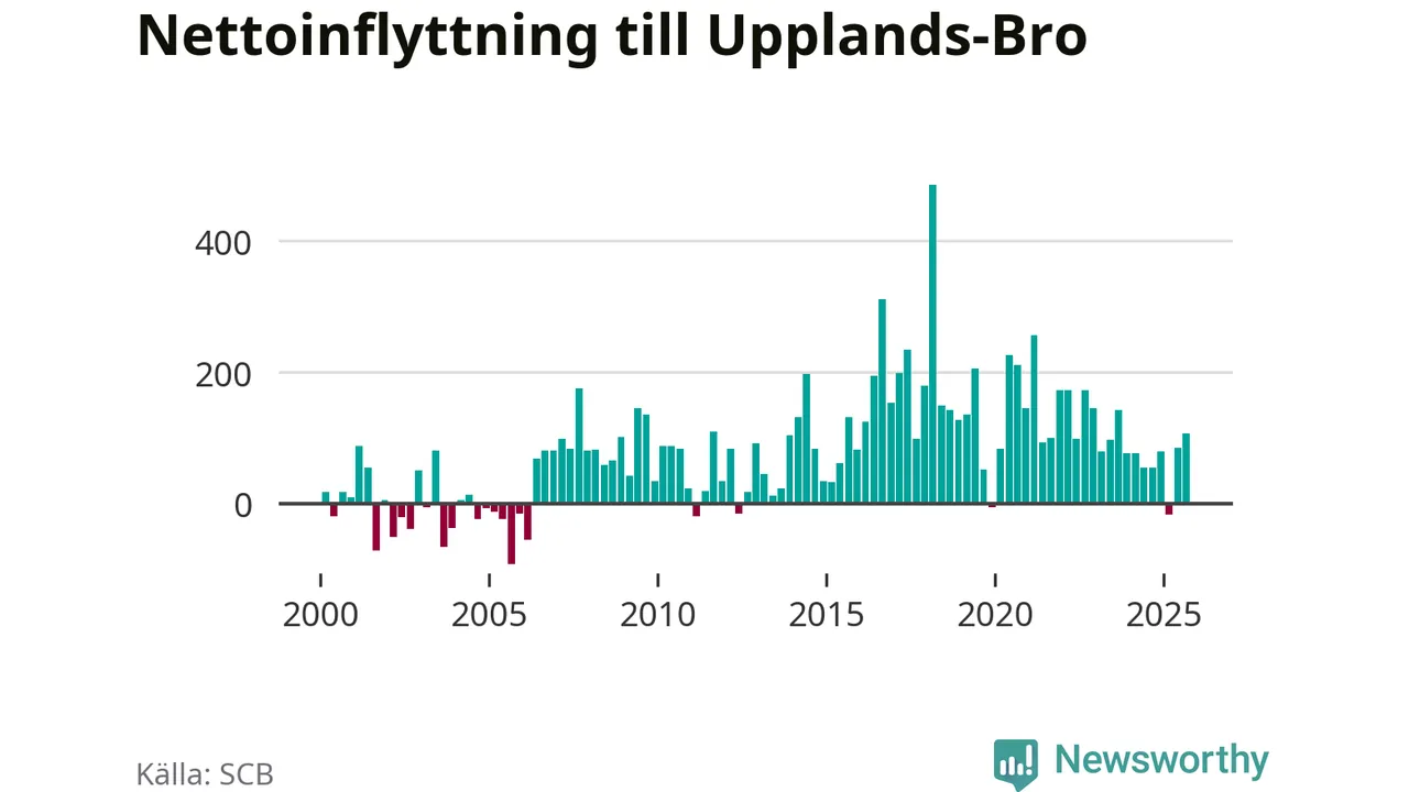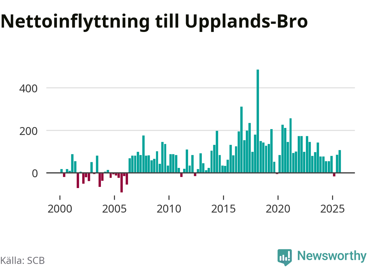 Under tredje kvartalet 2025 flyttade 957 personer till kommunen medan 850 personer flyttade därifrån. Det är historiskt sett en stor inflyttning under ett kvartal – men samtidigt var utflyttningen relativt stor. Sedan seklets början har Upplands-Bro haft ett positivt flyttnetto under nästan alla kvartal, inklusive det senaste kvartalet.