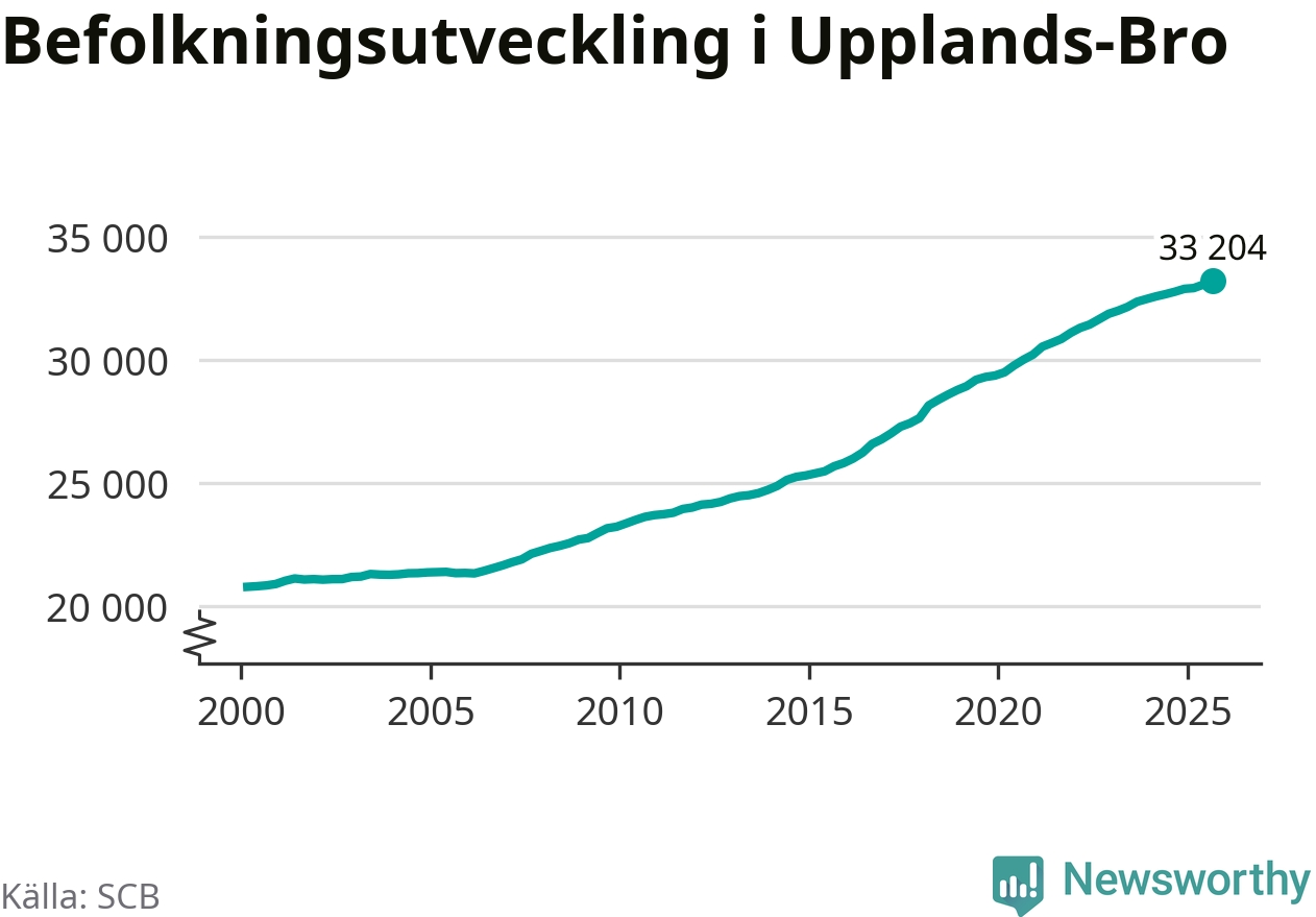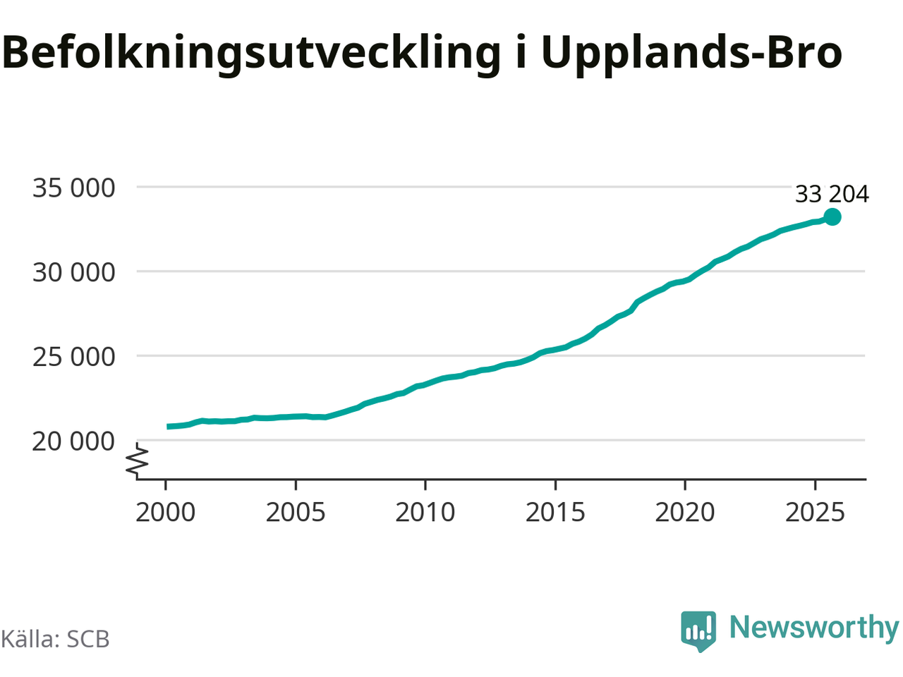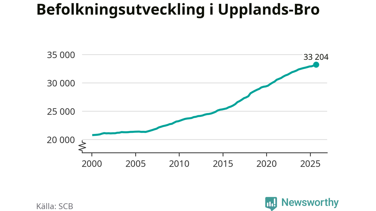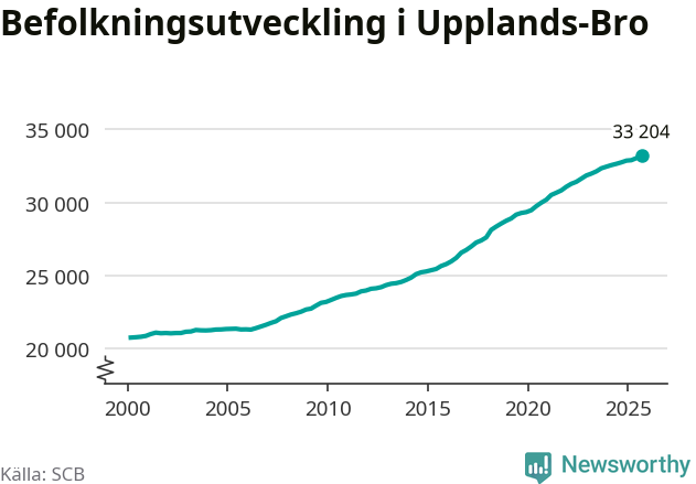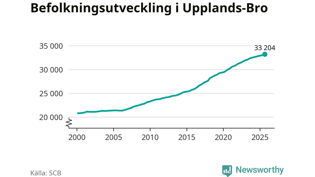 Befolkningen ökade i Upplands-Bro kommun under det tredje kvartalet 2025. Den 30 september bodde enligt SCB:s senaste siffror 33 204 personer i kommunen, vilket är 165 fler än i slutet av andra kvartalet. Folkökningen är procentuellt sett en av de största i Stockholms län.