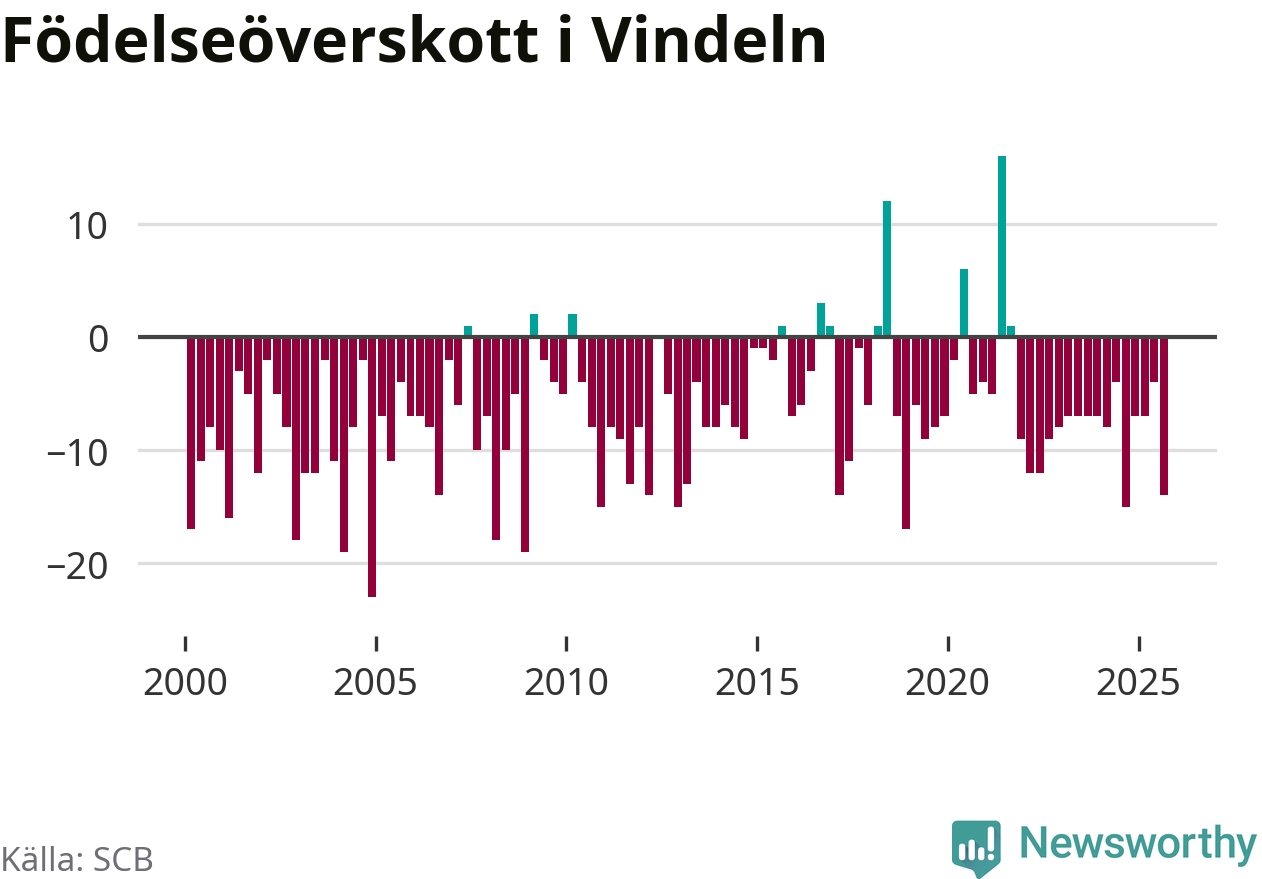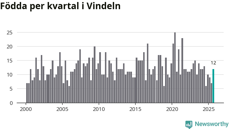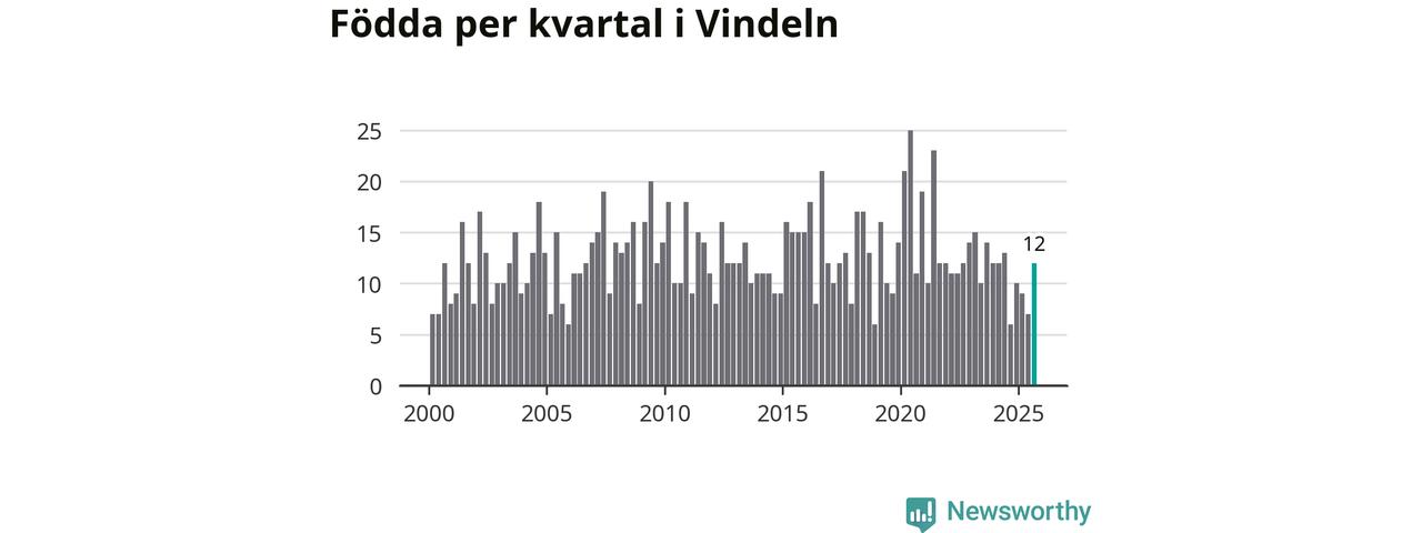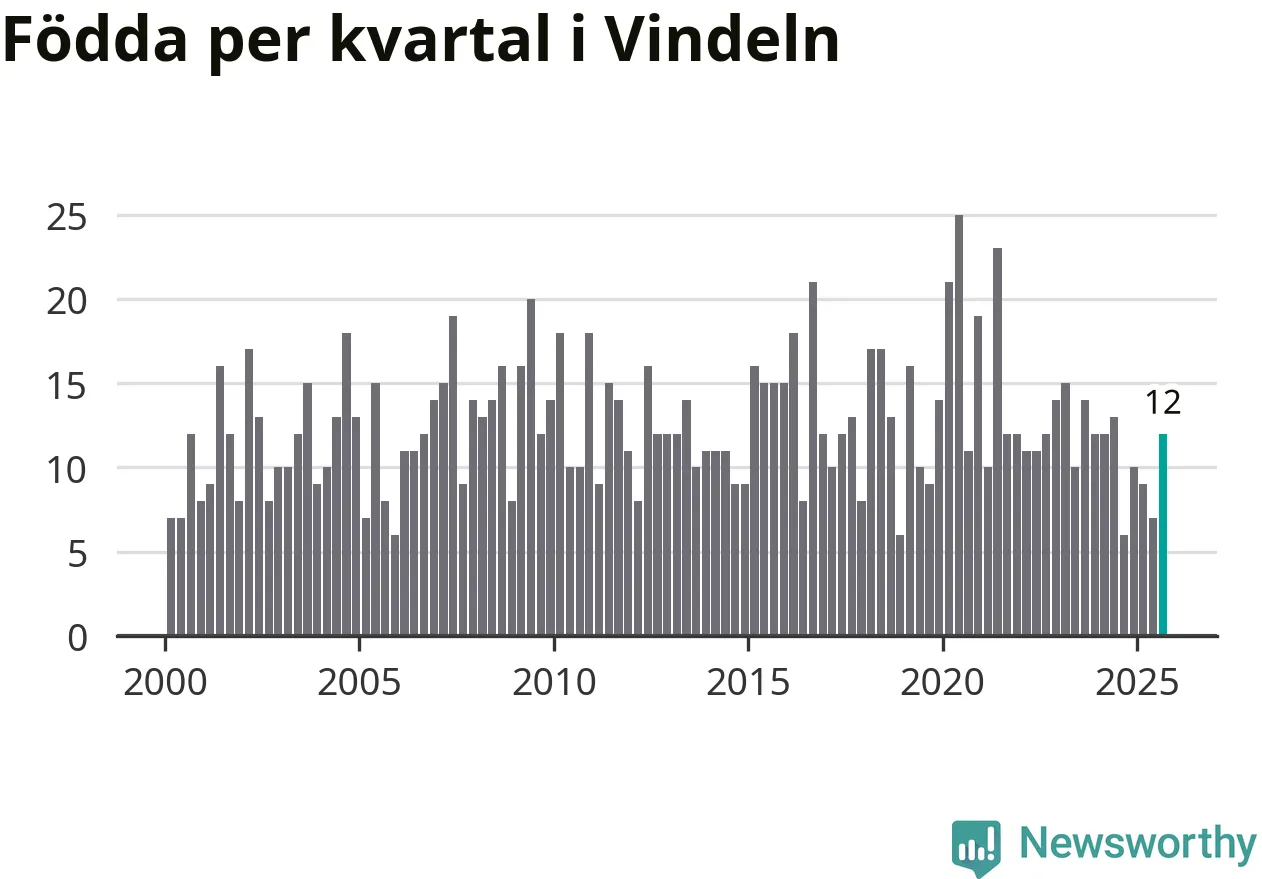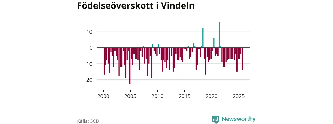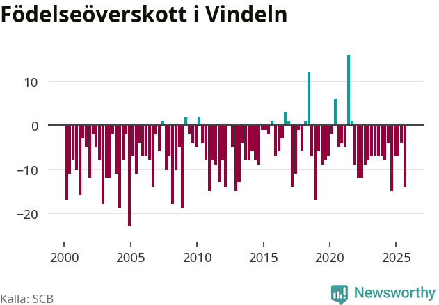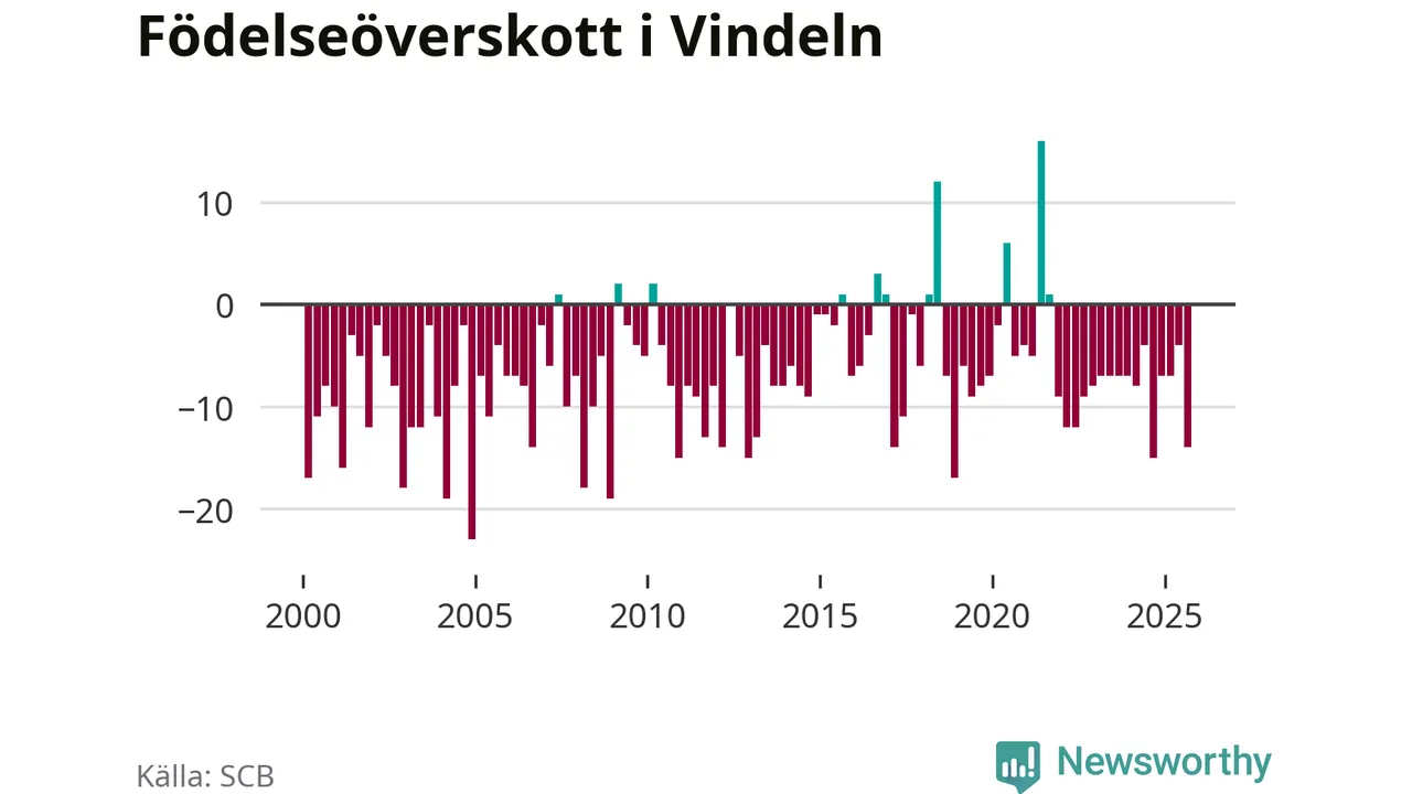 Enligt SCB:s siffror föddes tolv barn i Vindeln under det senaste kvartalet. Samtidigt avled relativt många – 26 personer. Vindeln hade alltså ett negativt födelsenetto, vilket kommunen historiskt sett oftast har haft.