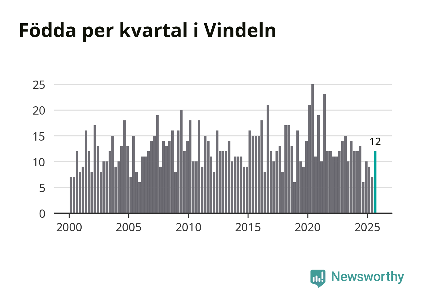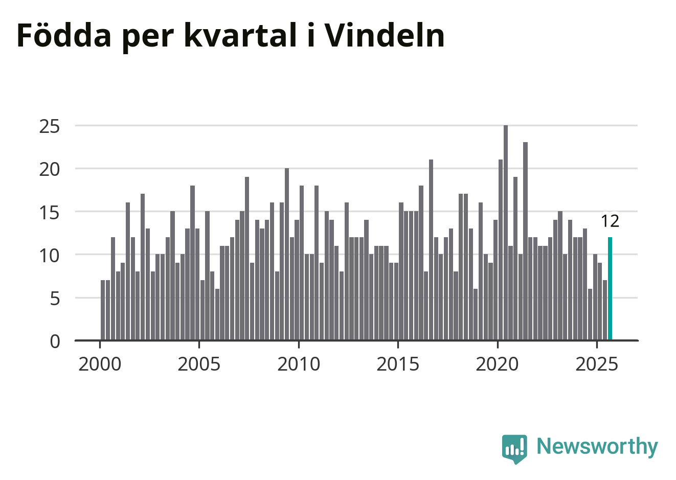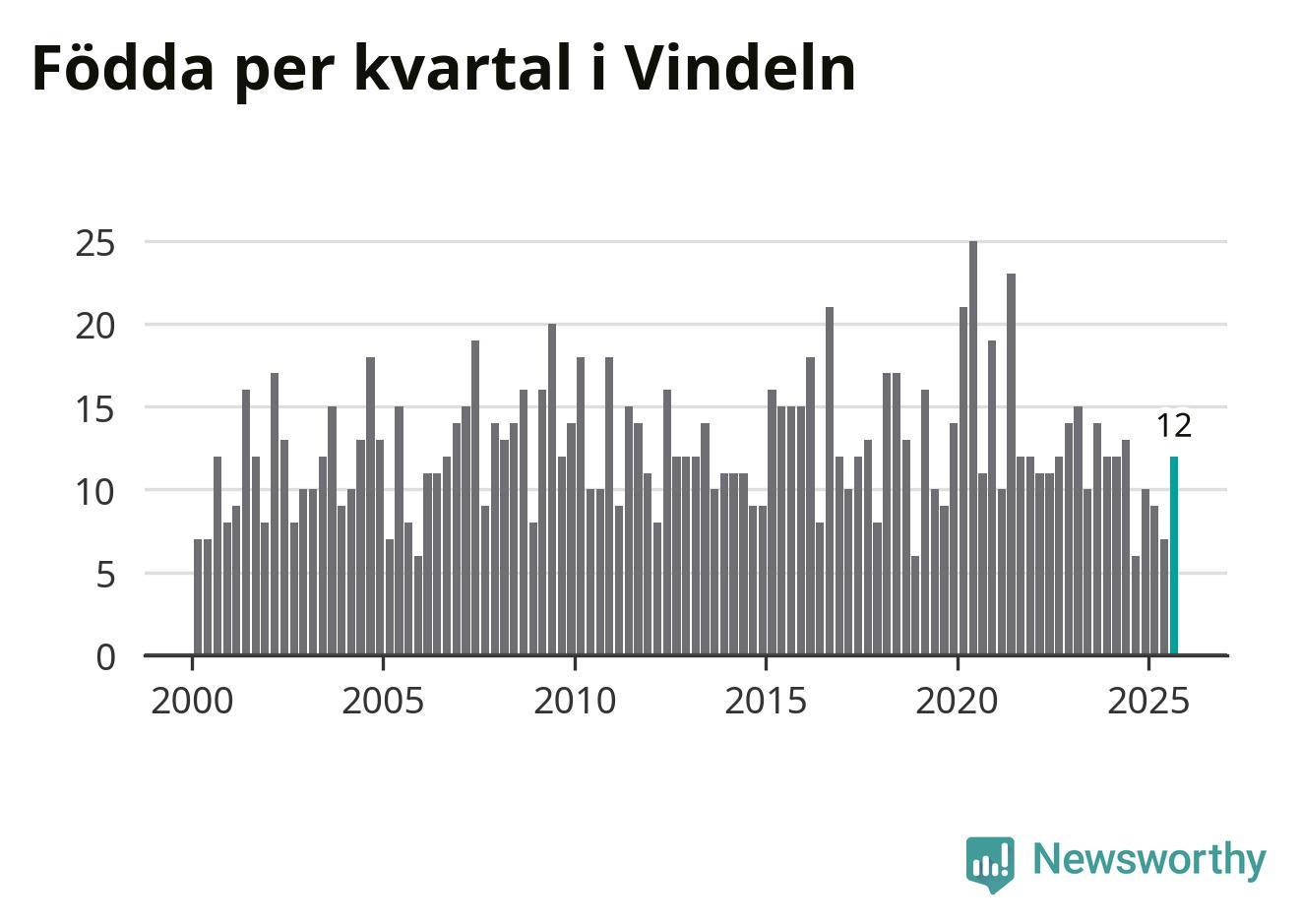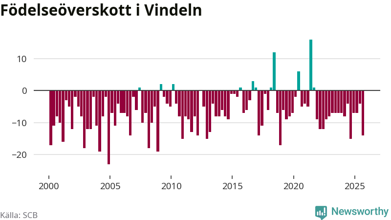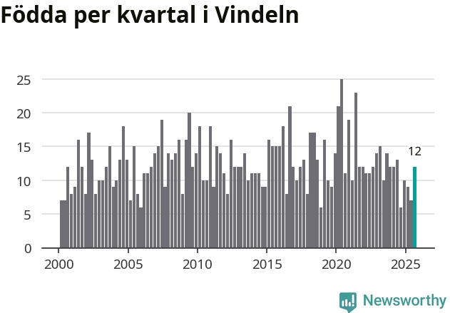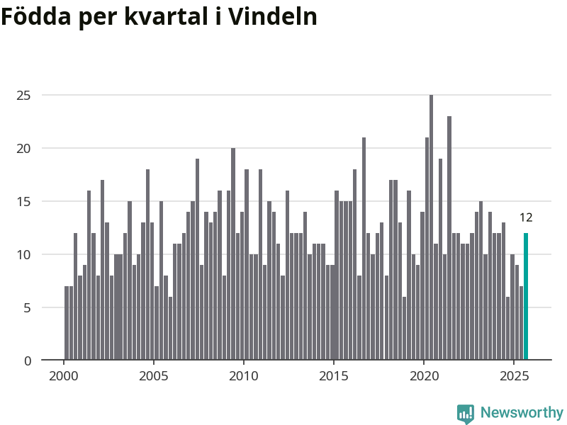 Enligt SCB:s siffror föddes tolv barn i Vindeln under det senaste kvartalet. Samtidigt avled relativt många – 26 personer. Vindeln hade alltså ett negativt födelsenetto, vilket kommunen historiskt sett oftast har haft.