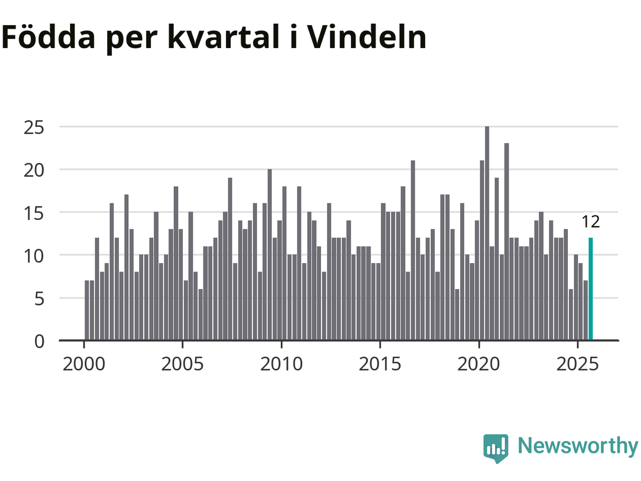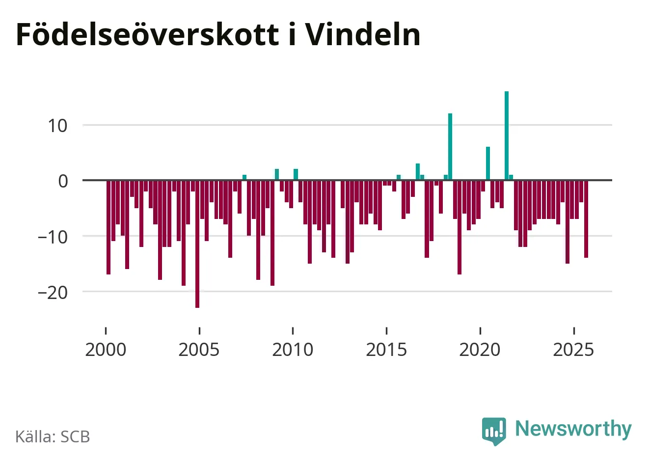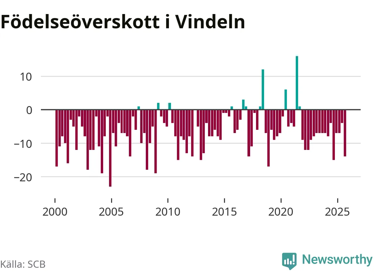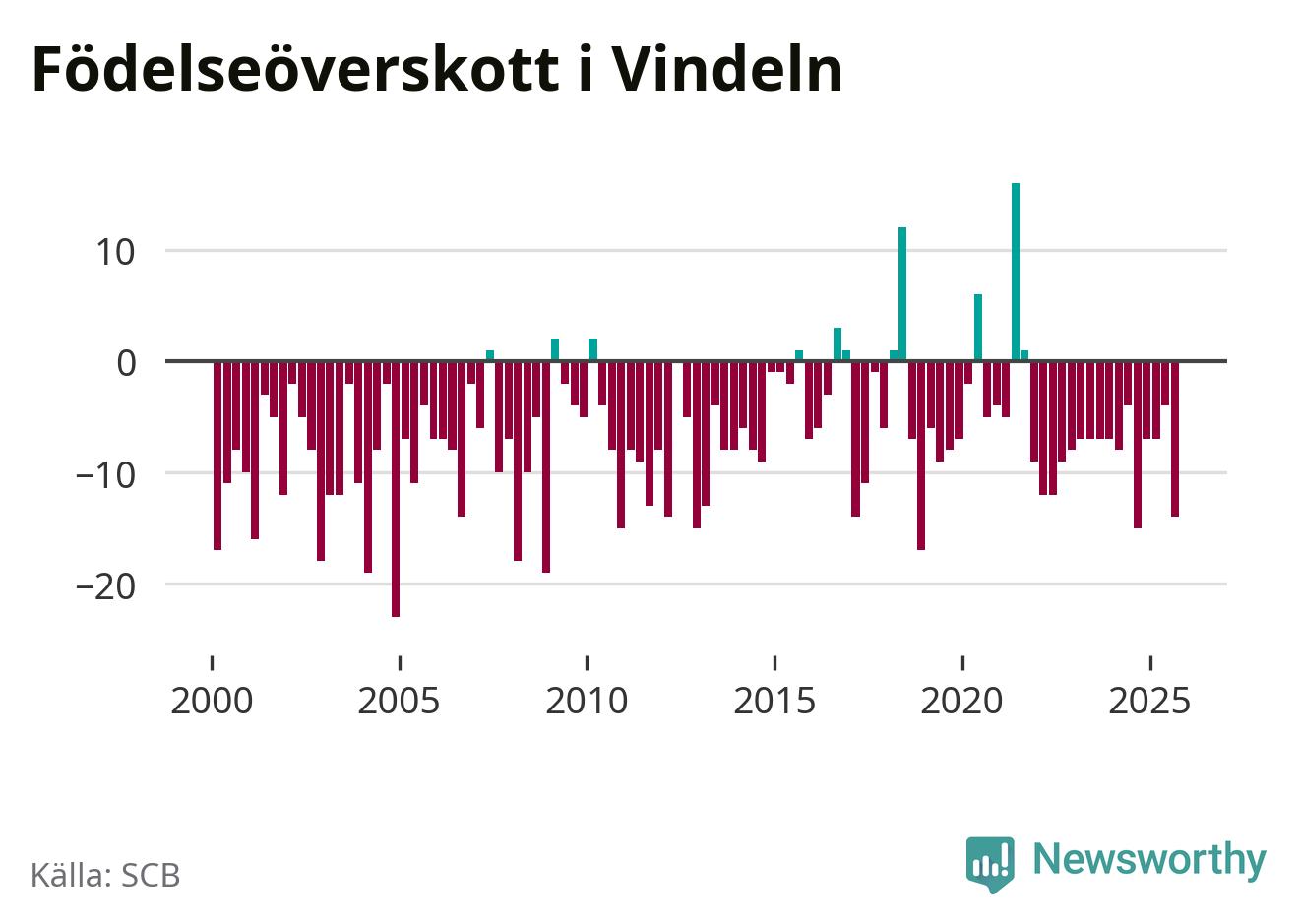 Enligt SCB:s siffror föddes tolv barn i Vindeln under det senaste kvartalet. Samtidigt avled relativt många – 26 personer. Vindeln hade alltså ett negativt födelsenetto, vilket kommunen historiskt sett oftast har haft.